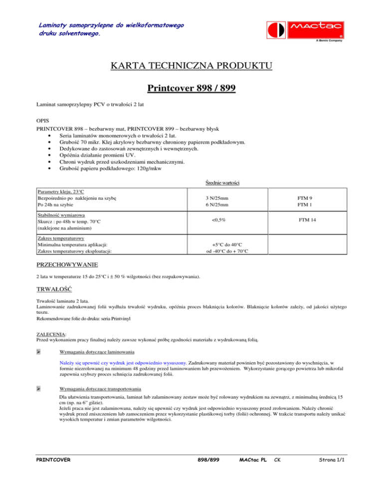 KARTA TECHNICZNA PRODUKTU Printcover 898 / 899 Laminat samoprzylepny PCV o trwało ci 2 lat OPIS PRINTCOVER 898 – bezbarwny mat, PRINTCOVER 899 – bezbarwny błysk • Seria laminatów monomerowych o trwało ci 2 lat. • Grubo 70 mikr. Klej akrylowy bezbarwny chroniony papierem podkładowym. • Dedykowane do zastosowa zewn trznych i wewn trznych. • Opó nia działanie promieni UV. • Chroni wydruk przed uszkodzeniami mechanicznymi. • Grubo papieru podkładowego: 120g/mkw rednie warto ci Parametry kleju, 23°C Bezpo rednio po naklejeniu na szyb Po 24h na szybie 3 N/25mm 6 N/25mm Stabilno wymiarowa Skurcz : po 48h w temp. 70°C (naklejone na aluminium) FTM 9 FTM 1 <0,5% Zakres temperaturowy Minimalna temperatura aplikacji: Zakres temperaturowy eksploatacji: FTM 14 +5°C do 40°C od -40°C do + 70°C PRZECHOWYWANIE 2 lata w temperaturze 15 do 25°C i ± 50 % wilgotno ci (bez rozpakowywania). TRWAŁO Trwało laminatu 2 lata. Laminowanie zadrukowanej folii wydłu a trwało tuszu. Rekomendowane folie do druku: seria Printvinyl wydruku, opó nia proces blakni cia kolorów. Blakni cie kolorów zale y, od jako ci u ytego ZALECENIA: Przed wykonaniem pracy finalnej nale y zawsze wykona prób zgodno ci materiału z wydrukowan foli . Wymagania dotycz ce laminowania Nale y si upewni czy wydruk jest odpowiednio wysuszony. Zadrukowany materiał powinien by pozostawiony do wyschni cia, w formie niezrolowanej na minimum 48 godziny przed laminowaniem lub przewo eniem. Wykorzystanie gor cego powietrza lub mikrofal zapewnia szybszy proces schni cia zadrukowanej folii. Wymagania dotycz ce transportowania Dla ułatwienia transportowania, laminat lub zalaminowany zestaw mo e by rolowany wydrukiem na zewn trz, z minimaln rednic 15 cm (np. na 6” gilzie). Je eli praca nie jest zalaminowana, nale y si upewni czy wydruk jest odpowiednio wysuszony przed zrolowaniem. Nale y chroni wydruk przed zniszczeniem lub zamoczeniem przez wykorzystanie plastikowej torby (folii) ochronnej. W trakcie transportu nale y unika wysokich temperatur i zmian parametrów wilgotno ci. !" !#!" " $% &