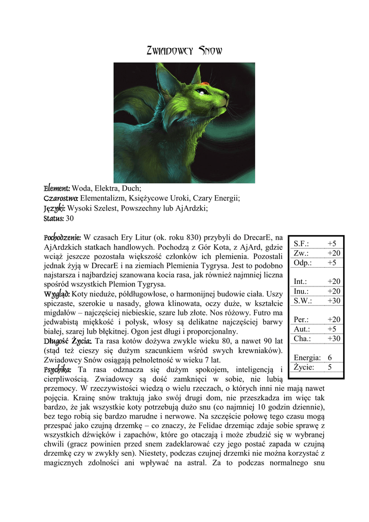 Zwiadowcy Snow ę Woda, Elektra, Duch; Elementalizm, Księżycowe Uroki, Czary Energii; Wysoki Szelest, Powszechny lub AjArdzki; 30 W czasach Ery Litur (ok. roku 830) przybyli do DrecarE, na AjArdzkich statkach handlowych. Pochodzą z Gór Kota, z AjArd, gdzie S.F.: wciąż jeszcze pozostała większość członków ich plemienia. Pozostali Zw.: jednak żyją w DrecarE i na ziemiach Plemienia Tygrysa. Jest to podobno Odp.: najstarsza i najbardziej szanowana kocia rasa, jak również najmniej liczna Int.: spośród wszystkich Plemion Tygrysa. ą Koty nieduże, półdługowłose, o harmonijnej budowie ciała. Uszy Inu.: spiczaste, szerokie u nasady, głowa klinowata, oczy duże, w kształcie S.W.: migdałów – najczęściej niebieskie, szare lub złote. Nos różowy. Futro ma jedwabistą miękkość i połysk, włosy są delikatne najczęściej barwy Per.: Aut.: białej, szarej lub błękitnej. Ogon jest długi i proporcjonalny. ł ść Ż Ta rasa kotów dożywa zwykle wieku 80, a nawet 90 lat Cha.: (stąd też cieszy się dużym szacunkiem wśród swych krewniaków). Energia: Zwiadowcy Snów osiągają pełnoletność w wieku 7 lat. Ta rasa odznacza się dużym spokojem, inteligencją i Życie: cierpliwością. Zwiadowcy są dość zamknięci w sobie, nie lubią przemocy. W rzeczywistości wiedzą o wielu rzeczach, o których inni nie mają nawet pojęcia. Krainę snów traktują jako swój drugi dom, nie przeszkadza im więc tak bardzo, że jak wszystkie koty potrzebują dużo snu (co najmniej 10 godzin dziennie), bez tego robią się bardzo marudne i nerwowe. Na szczęście połowę tego czasu mogą przespać jako czujną drzemkę – co znaczy, że Felidae drzemiąc zdaje sobie sprawę z wszystkich dźwięków i zapachów, które go otaczają i może zbudzić się w wybranej chwili (gracz powinien przed snem zadeklarować czy jego postać zapada w czujną drzemkę czy w zwykły sen). Niestety, podczas czujnej drzemki nie można korzystać z magicznych zdolności ani wpływać na astral. Za to podczas normalnego snu +5 +20 +5 +20 +20 +30 +20 +5 +30 6 5 Zwiadowcy wędrują zwykle po tajemniczych szlakach krainy snów. Jako jedyne koty lubią wodę i nie czują do niej niechęci. Żyją samotnie lub w grupach rodzinnych, których członkowie znajdują się w luźnym kontakcie. Wielu zamieszkuje wsie i miasta korzystając z wygód cywilizacji, które bardzo sobie cenią. Często mieszkają razem z ludźmi lub utra, korzystając z darmowej opieki w zamian za usługi magiczne. Jak wszystkie koty cenią sobie niezależność i na ogółu są szanowane przez inne rasy. Większość z nich zajmuje się magią, to oni również stworzyli technikę kociego pisma (symboli wydrapywanych na miękkim drewnie), oraz ścieżkę Księżycowych Uroków. Inne felidae uważają ich za mędrców swego plemienia i często zasięgają ich rady w ważnych sprawach. Zwiadowcy noszą płaszcze z kapturami w jasnych kolorach – preferują błękit, srebro i jasny fiolet. Wielu nosi również biżuterię (której wzornictwo często naśladuje styl AjArdzki). Często przycinają któryś z pazurów tak, by można było także nim pisać. Lubią dobre i lekkie materiały, raczej nie noszą zbroi. MG powinien traktować wszystkie kocie rasy tak jakby posiadały +20 do krycia się gdy się poruszają bez zbroi (trudno jest usłyszeć skradającego się kota) i +10 w zbroi. Felidae nie testują także zdolności Wspinaczka, uważa się ją za udaną automatycznie, jeśli powierzchnia ściany jest na tyle chropowata, że umożliwia zaczepienie się pazurami. Koty nie mogą jednak wchodzić po linach. Także wszelkie manualne czynności są dla nich znacznie utrudnione, otrzymują one -20 do tego rodzaju działań (np. włamywanie, manipulacja, obsługa technologii czy próba stworzenia eliksiru). Zwiadowcy Snów, podobnie jak inne plemiona Felidae wyznają Religię Niebiańskich Świateł. Sporadycznie, bardziej postępowe jednostki przyjmują Kult Równowagi. Właściwie wszyscy w tej niewielkiej rasie wybierają drogę Adepta. Większość zostaje Magami Astralnymi i Tkaczami Uroków. Nieliczni interesują się zbieraniem wiedzy i praktykują jako uczeni lub astroinformatycy. Biegłości sugerowane: bez broni, krótkie; ę ść - Kosmologia; - ś Koci wzrok; Przebudzenie Astralu i +1 do Zdolności Astralnych; Mały cel (+10 P.0. w starciu z większymi od siebie przeciwnikami); Srebrne wszczepy (szpony lub kły).