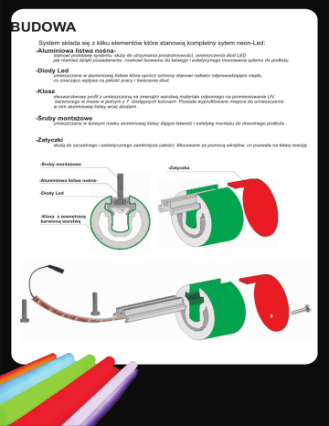BUDOWA System sk³ada siê z kilku elementów które stanowi¹ kompletny sytem neon-Led: -Aluminiowa listwa noœna- stanowi podstawê systemu, s³u¿y do utrzymania prostoliniowoœci, umieszczenia diod LED jak równie¿ dziêki posiadanemu rowkowi teowemu do ³atwego i estetycznego mocowania sytemu do pod³o¿y. -Diody Led umieszczane w aluminiowej listwie która oprócz ochrony stanowi radiator odprowadzaj¹ce ciep³o, co znacz¹co wp³ywa na jakoœæ pracy i œwiecenia diod. -Klosz dwuwarstwowy profil z umieszczon¹ na zewn¹trz warstw¹ materia³u odpornego na promieniowanie UV, barwionego w masie w jednym z 7 dostêpnych kolorach. Posiada wyprofilowane miejsce do umieszczenia w nim aluminiowej listwy wraz diodami . -Œruby monta¿owe umieszczane w teowym rowku aluminiowej listwy daj¹ce ³atwoœæ i estetykê monta¿u do dowolnego pod³o¿a . -Zatyczki s³u¿¹ do szczelnego i estsetycznego zamkniêcia ca³oœci. Mocowane za pomoc¹ wkrêtów, co pozwala na ³atw¹ rewizjê . -Œruby monta¿owe -Aluminiowa listwa noœna-Diody Led -Klosz z zewnêtrzn¹ barwion¹ warstw¹ -Zatyczka KOLORY Bia³y ¯ó³ty Zielony Czerwony Jasny niebieski Ciemny niebieski Pomarañczowy WYMIARY 12mm 17mm 32mm 40mm od 200m 50mm m do 30 00mm DIODY kierunek œwiecenia: horyzontalny wymiary 60 SMD 3528 /m Napiêcie (VDC) Moc (W) czerwony zielony niebieski zimny bia³y ciep³y bia³y DC 12V DC 12V DC 12V DC 12V DC 12V 24 24 24 24 24 Iloœæ diod 300 szt. 300 szt. 300 szt. 300 szt. 300 szt. Maksymalna D³ugoœæfali (nm) d³ugoœæ ³añcucha Temp. barwowa (K) 5m 5m 5m 5m 5m 620 - 630 nm 510 - 530 nm 460 - 470 nm 8000 - 8500 K 3200 - 3500 K K¹t œwiecenia Lumeny (lm) Temp. pracy 120 120 120 120 120 414 780 340 1800 1620 -20 do +60 -20 do +60 -20 do +60 -20 do +60 -20 do +60 - dane dotycz¹pojedynczej rolki 5 metrowej - tolerancja parametrów optycznych i elektrycznych +- 10% - przekroczenie napiêcia zasilania prowadzi do przeci¹¿enia produktu, w konsekwencji czego mo¿e nast¹piæskrócenie czasu¿ycia, ograniczenie luminancji, a nawet zniszczenie ca³ej taœmy diodowej - przekroczenie temperatury sk³adowania lub pracy wp³ywa na czas ¿ycia, luminancje i mo¿e doprowadziæ do uszkodzenia produktu kierunek œwiecenia: wertyklany wymiary 60 SMD 3528 /m Napiêcie (VDC) Moc (W) Iloœæ diod czerwony zielony niebieski zimny bia³y DC 12V DC 12V DC 12V DC 12V 0,72 0,72 0,72 0,72 96 szt. 96 szt. 96 szt. 96 szt. Maksymalna K¹t d³ugoœæ ³añcucha œwiecenia 0,96m 0,96m 0,96m 0,96m 100 100 100 100 - dane dotycz¹pojedynczej rolki 96 centymetrów - tolerancja parametrów optycznych i elektrycznych +- 10% - przekroczenie napiêcia zasilania prowadzi do przeci¹¿enia produktu, w konsekwencji czego mo¿e nast¹piæskrócenie czasu¿ycia, ograniczenie luminancji, a nawet zniszczenie ca³ej taœmy diodowej - przekroczenie temperatury sk³adowania lub pracy wp³ywa na czas ¿ycia, luminancje i mo¿e doprowadziæ do uszkodzenia produktu Lumeny (lm) Temp. pracy 195 225 95 315 -25 do +60 -25 do +60 -25 do +60 -25 do +60 ZASILACZE 30W/12V DC MODEL AN-12-30W Wymiary: IP66 WEJŒCIE napiêcie wejœciowe 170~250VAC czêstotliwoœæ 50Hz pobór mocy (pe³ne obci¹¿enie) d³. 218 mm, szer. 30 mm, wys. 22 mm 30mm 218mm 38W pr¹d wyjœciowy (pe³ne obci¹¿enie) 2,5A napiêcie wyjœciowe (pe³ne obci¹¿enie) 12V DC +- 0,5V napiêcie wyjœciowe (bez obci¹¿enia) 12V DC +- 0,5V zabezpieczenie zwarciowe w przypadku wyst¹pienia zwarcia automatycznie wy³¹czane jest napiêcie wyj. po usuniêciu zwarcia i up³ywie 3 sek. zasilacz wraca do normalnego trybu pracy zabezpieczenie przeci¹¿eniowe w przypadku wyst¹pienia przeci¹¿enia automatycznie wy³¹czane jest napiêcie wyj. zasilacza WYJŒCIE 22mm têtnienie napiêcia wyjœciowego 500mVpp (120Hz) iloœæwyjœæmocy 2 1 - 2x0,75mm o o -25 C ~ +40 C temp. PRACY 40W/12V DC MODEL VA-12040DOO6 WEJŒCIE IP66 napiêcie wejœciowe 170~250VAC czêstotliwoœæ 50Hz 53W pobór mocy (pe³ne obci¹¿enie) Wymiary: 3,4A pr¹d wyjœciowy (pe³ne obci¹¿enie) d³. 253 mm, szer. 40 mm, wys. 22 mm 40mm napiêcie wyjœciowe (pe³ne obci¹¿enie) 12V DC +- 0,5V napiêcie wyjœciowe (bez obci¹¿enia) 12V DC +- 0,5V zabezpieczenie zwarciowe w przypadku wyst¹pienia zwarcia automatycznie wy³¹czane jest napiêcie wyj. po usuniêciu zwarcia i up³ywie 3 sek. zasilacz wraca do normalnego trybu pracy zabezpieczenie przeci¹¿eniowe w przypadku wyst¹pienia przeci¹¿enia automatycznie wy³¹czane jest napiêcie wyj. zasilacza WYJŒCIE 253mm 500mVpp (120Hz) têtnienie napiêcia wyjœciowego 22mm iloœæwyjœæmocy 2 1 - 2x0,75mm o o -25 C ~ +40 C temp. PRACY 100W/12V DC MODEL AN-12V-60W Wymiary: d³. 180 mm, szer. 68 mm, wys. 55 mm WEJŒCIE napiêcie wejœciowe 170~250VAC czêstotliwoœæ 50Hz pobór mocy (pe³ne obci¹¿enie) 78W pr¹d wyjœciowy (pe³ne obci¹¿enie) 5A 68mm napiêcie wyjœciowe (pe³ne obci¹¿enie) 12V DC +- 0,5V napiêcie wyjœciowe (bez obci¹¿enia) 12V DC +- 0,5V zabezpieczenie zwarciowe w przypadku wyst¹pienia zwarcia automatycznie wy³¹czane jest napiêcie wyj. po usuniêciu zwarcia i up³ywie 3 sek. zasilacz wraca do normalnego trybu pracy zabezpieczenie przeci¹¿eniowe w przypadku wyst¹pienia przeci¹¿enia automatycznie wy³¹czane jest napiêcie wyj. zasilacza WYJŒCIE 180mm 500mVpp (120Hz) 55mm têtnienie napiêcia wyjœciowego iloœæwyjœæmocy IP66 2 2 x 2x0,75mm o o -25 C ~ +40 C temp. PRACY 150W/12V DC MODEL AN-12V-150W Wymiary: d³. 236 mm, szer. 132 mm, wys. 65 mm WEJŒCIE napiêcie wejœciowe 170~250VAC czêstotliwoœæ 50Hz pobór mocy (pe³ne obci¹¿enie) 185W pr¹d wyjœciowy (pe³ne obci¹¿enie) 12,5A 132mm napiêcie wyjœciowe (pe³ne obci¹¿enie) 12V DC +- 0,5V napiêcie wyjœciowe (bez obci¹¿enia) 12V DC +- 0,5V zabezpieczenie zwarciowe w przypadku wyst¹pienia zwarcia automatycznie wy³¹czane jest napiêcie wyj. po usuniêciu zwarcia i up³ywie 3 sek. zasilacz wraca do normalnego trybu pracy zabezpieczenie przeci¹¿eniowe w przypadku wyst¹pi