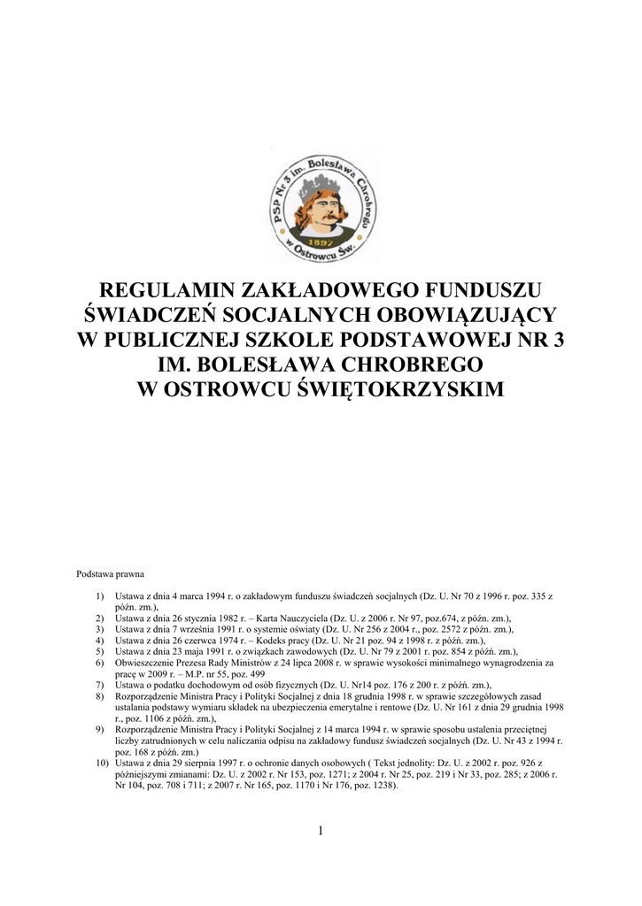 REGULAMIN ZAKŁADOWEGO FUNDUSZU ŚWIADCZEŃ SOCJALNYCH OBOWIĄZUJĄCY W PUBLICZNEJ SZKOLE PODSTAWOWEJ NR 3 IM. BOLESŁAWA CHROBREGO W OSTROWCU ŚWIĘTOKRZYSKIM Podstawa prawna Ustawa z dnia 4 marca 1994 r. o zakładowym funduszu świadczeń socjalnych (Dz. U. Nr 70 z 1996 r. poz. 335 z późn. zm.), 2) Ustawa z dnia 26 stycznia 1982 r. – Karta Nauczyciela (Dz. U. z 2006 r. Nr 97, poz.674, z późn. zm.), 3) Ustawa z dnia 7 września 1991 r. o systemie oświaty (Dz. U. Nr 256 z 2004 r., poz. 2572 z późn. zm.), 4) Ustawa z dnia 26 czerwca 1974 r. – Kodeks pracy (Dz. U. Nr 21 poz. 94 z 1998 r. z późń. zm.), 5) Ustawa z dnia 23 maja 1991 r. o związkach zawodowych (Dz. U. Nr 79 z 2001 r. poz. 854 z późń. zm.), 6) Obwieszczenie Prezesa Rady Ministrów z 24 lipca 2008 r. w sprawie wysokości minimalnego wynagrodzenia za pracę w 2009 r. – M.P. nr 55, poz. 499 7) Ustawa o podatku dochodowym od osób fizycznych (Dz. U. Nr14 poz. 176 z 200 r. z późń. zm.), 8) Rozporządzenie Ministra Pracy i Polityki Socjalnej z dnia 18 grudnia 1998 r. w sprawie szczegółowych zasad ustalania podstawy wymiaru składek na ubezpieczenia emerytalne i rentowe (Dz. U. Nr 161 z dnia 29 grudnia 1998 r., poz. 1106 z późń. zm.), 9) Rozporządzenie Ministra Pracy i Polityki Socjalnej z 14 marca 1994 r. w sprawie sposobu ustalenia przeciętnej liczby zatrudnionych w celu naliczania odpisu na zakładowy fundusz świadczeń socjalnych (Dz. U. Nr 43 z 1994 r. poz. 168 z późń. zm.) 10) Ustawa z dnia 29 sierpnia 1997 r. o ochronie danych osobowych ( Tekst jednolity: Dz. U. z 2002 r. poz. 926 z późniejszymi zmianami: Dz. U. z 2002 r. Nr 153, poz. 1271; z 2004 r. Nr 25, poz. 219 i Nr 33, poz. 285; z 2006 r. Nr 104, poz. 708 i 711; z 2007 r. Nr 165, poz. 1170 i Nr 176, poz. 1238). 1) 1 ROZDZIAŁ I Postanowienia ogólne §1 1. Ilekroć w Regulaminie jest mowa o: a) szkole – rozumie się przez to: Publiczną Szkołę Podstawową nr 3 w Ostrowcu Świętokrzyskim, b) Funduszu – rozumie się przez to: Zakładowy Fundusz Świadczeń Socjalnych. 2. Kwota policzonego Funduszu na dany rok kalendarzowy podlega przekazaniu na rachunek Funduszu w wysokości i terminach określonych przepisami Ustawy. 3. Fundusz ZFŚS tworzy się z corocznego odpisu podstawowego pracowników czynnych oraz emerytów i rencistów. 4. Fundusz służy finansowaniu działalności socjalnej w Publicznej Szkole Podstawowej nr 3 w Ostrowcu Świętokrzyskim. 5. Wysokość odpisu podstawowego i jego zwiększenia, sposób ustalenia „przeciętnej liczby zatrudnionych” oraz „przeciętnego wynagrodzenia” w celu naliczania odpisu na Fundusz określają przepisy powszechnie obowiązujące. 6. Odpisy i zwiększenia, o których mowa w p.5, tworzą jeden Fundusz i obciążają koszty działalności Publicznej Szkoły Podstawowej nr 3 w Ostrowcu Świętokrzyskim. 7. Podstawą gospodarowania Funduszem jest Roczny Plan Dochodów i Wydatków, stanowiący Załącznik nr 1 do niniejszego Regulaminu. 8. Regulamin, Roczny Plan Dochodów i Wydatków oraz wszelkie załączniki i zmiany Regulaminu wymagają uzgodnienia z organizacjami związkowymi, działającymi na terenie szkoły. 9. Odpowiedzialność za gospodarowanie oraz administrowanie środkami Funduszu ponosi pracodawca – Dyrektor Szkoły. 10. Środki Funduszu są gromadzone na odrębnym rachunku bankowym. 11. Maksymalna wysokość świadczeń wypłacanych z Funduszu określa tabela dopłat stanowiąca Załącznik nr 3 do Regulaminu. 12. Tabela, o której mowa w p. 11, podlega corocznej aktualizacji, stosownie do możliwości finansowych Funduszu oraz zmian minimalnego wynagrodzenia za pracę. §2 1. Środki Funduszu zwiększa się o: a) wpływy z oprocentowania pomocy bezzwrotnej (pożyczek) udzielanej na cele mieszkaniowe, b) odsetki od lokaty konta bankowego ZFŚS, c) inne środki określone w odrębnych przepisach, d) środki Funduszu niewykorzystane w danym roku kalendarzowym przechodzą na rok następny. 2 §3 Publiczna Szkoła Podstawowa nr 3, zwana dalej Pracodawcą, ustala roczny preliminarz dochodów i wydatków Funduszu w terminie do 31 maja każdego roku kalendarzowego. §4 Nie można pokrywać z Funduszu wydatków, które nie mogą być z niego finansowane ani obciążać Funduszu zobowiązaniami niezgodnymi z celami Funduszu i ustawą, o której mowa w Podstawie Prawnej – p. 1. §5 Środkami Funduszu administruje samodzielnie, zgodnie z Regulaminem, Pracodawca w porozumieniu z Komisją Socjalną. §6 Pracodawca przekazuje na odrębny rachunek bankowy kwoty nie niższe niż określone w wyżej wymienionej Podstawie Prawnej. §7 Z podatku dochodowego od osób fizycznych zwolnione są: bezzwrotne zapomogi losowe oraz zapomogi dla podratowania zdrowia w związku z długotrwałą przewlekłą chorobą określone w Rozdz. III § 1pkt 4 Regulaminu, wartość rzeczowych i finansowych świadczeń określonych odrębnymi przepisami, dopłaty do wypoczynku dzieci i młodzieży do lat 18. ROZDZIAŁ II Komisja Socjalna §1 1. Działalność „socjalna” oznacza usługi świadczone przez szkołę na rzecz: -a- różnych form wypoczynku krajowego i zagranicznego, -b- działalności kulturalno-oświatowej i sportowo-rekreacyjnej, -c- udzielania bezzwrotnej pomocy materialnej (rzeczowej lub finansowej), -d- pomocy zwrotnej (pożyczki) na cele mieszkaniowe na warunkach określonych umową. 2. Komisja Socjalna – zespół utworzony przez Pracodawcę, składa się z czterech osób, w tym reprezentujących Związki Zawodowe działające na terenie placówki. 3. Członkowie Komisji Socjalnej wybierają spośród siebie Przewodniczącego i Sekretarza Komisji. Wybór ten podlega zatwierdzeniu przez Dyrektora Szkoły. 3 4. Komisja Socjalna podejmuje rozstrzygnięcia zwykłą większością w głosowaniu jawnym. W przypadku równej liczby głosów, decyduje głos Przewodniczącego. 5. Posiedzenia Komisji są protokołowane. 6. Posiedzenia Komisji Socjalnej są zwoływane przez Przewodniczącego lub 