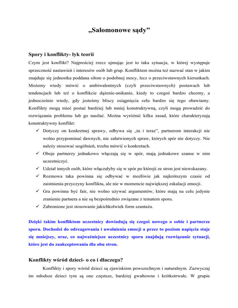„Salomonowe sądy” Spory i konflikty- łyk teorii Czym jest konflikt? Najprościej rzecz ujmując jest to taka sytuacja, w której występuje sprzeczność nastawień i interesów osób lub grup. Konfliktem można też nazwać stan w jakim znajduje się jednostka poddana siłom o podobnej mocy, lecz o przeciwstawnych kierunkach. Możemy wtedy mówić o ambiwalentnych (czyli przeciwstawnych) postawach lub tendencjach lub też o konflikcie dążenie-unikanie, kiedy to czegoś bardzo chcemy, a jednocześnie wtedy, gdy jesteśmy bliscy osiągnięcia celu bardzo się tego obawiamy. Konflikty mogą mieć postać bardziej lub mniej konstruktywną, czyli mogą prowadzić do rozwiązania problemu lub go nasilać. Można wyróżnić kilka zasad, które charakteryzują konstruktywny konflikt: ü Dotyczy on konkretnej sprawy, odbywa się „tu i teraz”, partnerom interakcji nie wolno przypominać dawnych, nie załatwionych spraw, których spór nie dotyczy. Nie należy stosować uogólnień, trzeba mówić o konkretach. ü Oboje partnerzy jednakowo włączają się w spór, mają jednakowe szanse w nim uczestniczyć. ü Udział innych osób, które włączałyby się w spór po którejś ze stron jest niewskazany. ü Rozmowa taka powinna się odbywać w możliwie jak najkrótszym czasie od zaistnienia przyczyny konfliktu, ale nie w momencie największej eskalacji emocji. ü Gra powinna być fair, nie wolno używać argumentów, które mają na celu jedynie zranienie partnera a nie są bezpośrednio związane z tematem sporu. ü Zabronione jest stosowanie jakichkolwiek form szantażu. Dzięki takim konfliktom uczestnicy dowiadują się czegoś nowego o sobie i partnerze sporu. Dochodzi do odreagowania i uwolnienia emocji a przez to poziom napięcia staje się mniejszy, oraz, co najważniejsze uczestnicy sporu znajdują rozwiązanie sytuacji, które jest do zaakceptowania dla obu stron. Konflikty wśród dzieci- o co i dlaczego? Konflikty i spory wśród dzieci są zjawiskiem powszechnym i naturalnym. Zazwyczaj im młodsze dzieci tym są one częstsze, bardziej gwałtowne i krótkotrwałe. W grupie dwulatków konflikty mogą wybuchać nawet co kilkadziesiąt sekund. Wiele zależy od poziomu rozwoju społecznego dziecka. W okresie średniego dzieciństwa czyli w wieku od 3 do 6 lat dziecko stopniowo uczy się współdziałania w grupie. Młodsze dzieci zazwyczaj preferują zabawy samotne lub równoległe. Z czasem rówieśnicy stają się partnerami w zabawie. Dzieci stopniowo uczą się stosowania reguł i współdziałania tak, że pod koniec tego okresu stają się zdolne do podejmowania zabaw zespołowych, co oznacza, że potrafią ustalić wspólny cel i dążyć do jego realizacji. Poznanie reguł obowiązujących w grupie społecznej wiąże się z rozwojem moralnym, rozumieniem dobra i zła oraz doświadczaniem takich emocji jak wstyd, poczucie winy. Dzieci w wieku przedszkolnym znajdują się na poziomie moralności przedkonwencjonalnej (wg Kohlberga) lub wg innego ujęcia, moralności heteronomicznej (Piaget). Oznacza to, że dziecko w tym wieku przestrzega zasad głównie w obawie przed konsekwencjami. Już 3-4 latek potrafi odróżnić zachowanie akceptowane przez dorosłych od nieakceptowanego i może zrzucać odpowiedzialność za swoje niewłaściwe postępowanie na inne osoby lub zabawki (To nie ja, to miś). Ten etap rozumowania moralnego wiąże się z występowaniem tzw. realizmu moralnego. Dziecko traktuje zasadę nie jak umowę społeczną, ale jako bezwzględny nakaz, który musi być spełniony niezależnie od okoliczności. Wina jest tym większą im gorsze ma konsekwencje (rozumiane jako konkretna szkoda), intencje sprawcy nie są brane pod uwagę. Małe dziecko może być np. bardzo obrażone na kolegę, który zniszczył mu budowlę z klocków, niezależnie od tego czy stało się to celowo czy też przez nieuwagę. Wszystko to sprawia, że współżycie dzieci w grupie może natrafiać na różnego rodzaju przeszkody. Czasami same warunki funkcjonowania grupy mogą nasilać konflikty. Dzieje się tak np. wtedy, gdy grupa dzieci przebywa w zbyt małym dla nich pomieszczeniu lub gdy dostępna ilość zabawek jest niewystarczająca. W niektórych przypadkach, korzystne skądinąd gry i zabawy oparte na rywalizacji i współzawodnictwie mogą także stymulować antagonizmy pomiędzy dziećmi. Dzieje się tak np. wtedy, gdy dzieci mają zbyt mało okazji do współpracy, lub też gdy dorośli nadmiernie podkreślają wagę zwycięstwa i bycia najlepszym a nie doceniają samych starań dzieci. Ważnym czynnikiem wpływającym na pojawianie się konfliktów między dziećmi są deficyty umiejętności komunikacyjnych. Nieumiejętność zgłaszania swoich pragnień, postulatów, brak zrozumienia wypowiedzi kolegów jest częstym powodem gwałtownych reakcji, szczególnie młodszych dzieci. Najczęstszym powodem konfliktów, jest podobnie jak u dorosłych sprzeczność interesów. Najmłodszym dzieciom, szczególnie tym, które dotąd miały kontakt głównie z dorosłymi często trudno jest zaakceptować odmienne zdanie partnera zabawy. Dorosły bawiąc się z dzieckiem najczęściej podąża za jego pomysłami, wycofuje się wobec oporu, pozwala dziecku na realizację własnego planu, a często także karnie spełnia polecenia małego towarzysza zabawy. Kontakt z rówieśnikiem przebiega na zupełnie odmiennych zasadach. Właśnie w grupie rówieśniczej dziecko ma szansę poznać odmienne zdania i poglądy, spierać się i negocjować na zasadach równorzędności. Konflikt nie tylko nie jest czymś złym, ale może być wykorzystany w celach wychowawczych. W mądrym sporze dziecko ma szansę trenować wiele ważnych umiejętności takich jak: nazywanie swoich emocji i ich wyrażanie w akceptowalnej formie, komunikowanie swoich potrzeb i pragnień, rozumienie perspektywy innej osoby, proponowanie i negocjowanie rozwiązań. Wszystkie te umiejętności będą niezbędne w dla