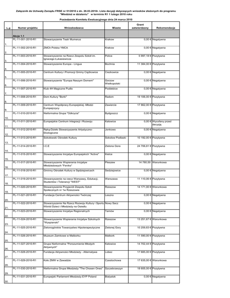 Załącznik do Uchwały Zarządu FRSE nr 51/2010 z dn. 26.03.2010r. Lista decyzji dotyczących wniosków złoŜonych do programu "MłodzieŜ w działaniu" w terminie R1 1 lutego 2010 roku Posiedzenie Komitetu Ewaluacyjnego dnia 24 marca 2010 L.p Numer projektu Wnioskodawca Miasto Grant zatwierdzony Rekomendacja Akcja 1.1 PL-11-001-2010-R1 Stowarzyszenie Teatr Mumerus Krakow 0,00 € Negatywna PL-11-002-2010-R1 ZMCh Polska YMCA Krakow 0,00 € Negatywna PL-11-003-2010-R1 Stowarzyszenie na Rzecz Zespolu Szkół im. Ignacego Łukasiewicza Police PL-11-004-2010-R1 Stowarzyszenie Europa - Lingua Bochnia PL-11-005-2010-R1 Centrum Kultury i Promocji Gminy CięŜkowice Ciezkowice 0,00 € Negatywna PL-11-006-2010-R1 Stowarzyszenie "Europa Naszym Domem" Gorzow Wielkopolski 0,00 € Negatywna PL-11-007-2010-R1 Klub 4H Magiczne Pudlo Poddebice 0,00 € Negatywna PL-11-008-2010-R1 Dom Kultury "Borki" Radom 19 106,00 € Pozytywna PL-11-009-2010-R1 Centrum Współpracy Europejskiej -Młodzi Europejczycy Zawiercie 17 862,00 € Pozytywna PL-11-010-2010-R1 Nieformalna Grupa "Odkrycia" Bydgoszcz 0,00 € Negatywna PL-11-011-2010-R1 Europejskie Centrum Integracji i Rozwoju Katowice 0,00 € Wycofany przed decyzją PL-11-012-2010-R1 Ręką-Dzieło Stowarzyszenie ArtystycznoEkologiczne Jonkowo 0,00 € Negatywna PL-11-013-2010-R1 Sokołowski Ośrodek Kultury Sokolow Podlaski 10 192,00 € Pozytywna PL-11-014-2010-R1 I.C.E Zielona Gora 24 706,81 € Pozytywna PL-11-015-2010-R1 Stowarzyszenie Inicjatyw Europejskich "Active" Kielce PL-11-017-2010-R1 Stowarzyszenie Wspierania Inicjatyw MłodzieŜowych "Feniks" Pleszew PL-11-018-2010-R1 Gminny Ośrodek Kultury w Sędziejowicach Sedziejowice PL-11-019-2010-R1 Stowarzyszenie na rzecz Warszawy, Edukacji, Studentów i Tolerancji "WEST" Warszawa 11 110,06 € Pozytywna PL-11-020-2010-R1 Stowarzyszenie Przyjaciół Zespołu Szkól Społecznych nr 1w Rzeszowie Rzeszow 14 171,00 € Warunkowa PL-11-021-2010-R1 Fundacja Centrum Aktywności Twórczej Leszno PL-11-022-2010-R1 Stowarzyszenie Na Rzecz Rozwoju Kultury i Sportu Nowy Sacz Wśród Dzieci i MłodzieŜy na Osiedlu 0,00 € Negatywna PL-11-023-2010-R1 Stowarzyszenie Inicjatyw Regionalnych Tarnów 0,00 € Negatywna PL-11-024-2010-R1 Stowarzyszenie Wspierania Inicjatyw Szkolnych "Wyspianski" Rzeszow 13 251,67 € Warunkowa PL-11-025-2010-R1 Zielonogórskie Towarzystwo Hipoterapeutyczne Zielonej Gory 10 259,83 € Pozytywna PL-11-026-2010-R1 Muzeum Zamkowe w Malborku Malbork 11 590,00 € Pozytywna PL-11-027-2010-R1 Grupa Nieformalna "Porozumienie Młodych Aktywnych" Katowice 14 702,44 € Pozytywna PL-11-028-2010-R1 Fundacja Aktywności MłodzieŜy - Alternatywa Lobez 17 685,00 € Pozytywna PL-11-029-2010-R1 Koło ZMW w Zawadzie Czestochowa 17 635,00 € Warunkowa PL-11-030-2010-R1 Nieformalna Grupa MłodzieŜy "The Chosen Ones" Szczebrzeszyn PL-11-031-2010-R1 Europejski Parlament MłodzieŜy EYP Poland 1. 2. 3. 5 997,18 € Pozytywna 11 384,00 € Pozytywna 4. 5. 6. 7. 8. 9. 10. 11. 12. 13. 14. 0,00 € Negatywna 15. 16. 14 780,50 Warunkowa 0,00 € Negatywna 17. 18. 19. 0,00 € Negatywna 20. 21. 22. 23. 24. 25. 26. 27. 28. 18 605,00 € Pozytywna 29. 30. Bialystok 0,00 € Negatywna PL-11-032-2010-R1 Częstochowskie Stowarzyszenie Rozwoju Małej Przedsiębiorczości Czestochowa PL-11-033-2010-R1 Stowarzyszenie Forum Kultur Poznan PL-11-034-2010-R1 Europejski Dom Spotkań - Fundacja Nowy Staw Lublin PL-11-035-2010-R1 Klub Młodego Europejczyka "Young Europeans" Poniatowa 0,00 € Negatywna PL-11-036-2010-R1 Fundacja im. Jana Pawła II Walbrzych 23 743,00 € Pozytywna PL-11-037-2010-R1 Grupa teatralna Post-Arte-Fakt Mragowo 27 615,00 € Warunkowa PL-11-038-2010-R1 MlodzieŜowy Dom Kultury im. Wl. Broniewskiego Warszawa 19 931,17 € Pozytywna PL-11-039-2010-R1 SEN Stowarzyszenie Edukacji Nieformalnej Olsztynek 0,00 € Negatywna PL-11-040-2010-R1 Grupa Nieformalna przy AKS SPARTA Augustow 0,00 € Negatywna PL-11-041-2010-R1 Zespół Szkół Kształtowania Środowiska i Agrobiznesu Gizycko 7 751,44 € Pozytywna PL-11-042-2010-R1 Stowarzyszenie na Rzecz Rozwoju Gminy śychlin Zychlin 26 480,80 € Warunkowa PL-11-043-2010-R1 I Liceum Ogólnokształcące im. Floriana Ceynowy Swiecie 0,00 € Negatywna PL-11-044-2010-R1 Gmina Drawno Drawno 0,00 € Negatywna PL-11-045-2010-R1 Bractwo MłodzieŜy Prawosławnej w Polsce Bialystok 0,00 € Negatywna PL-11-046-2010-R1 ZHR 10 Poznańska DruŜyna Harcerek "GNIAZDO" Warszawa 10 196,00 € Warunkowa PL-11-047-2010-R1 Salezjańskie Stowarzyszenie Wychowania MłodzieŜy Pila 15 248,00 € Pozytywna PL-11-048-2010-R1 Stowarzyszenie Działań Artystycznych i Kulturalnych "Fabryka Twórczości" Legnica PL-11-049-2010-R1 Grupa "Źli Ludzie" Warszawa 14 602,59 € Pozytywna PL-11-050-2010-R1 Polskie Stowarzyszenie Na Rzecz Osób z Upośledzeniem Umysłowym Koło w Chorzowie Warsztat Terapii Zajęciowej Chorzow 19 220,00 € Pozytywna PL-11-051-2010-R1 Klub Europejski przy Zespole Szkół w Klimontowie Klimontow PL-11-052-2010-R1 Nowowarpieńskie Stowarzyszenie "Pamięć i Tradycja" Nowe Warpno 0,00 € Negatywna PL-11-053-2010-R1 Urząd Marszałkowski Województa Lubuskiego Zielona Gora 0,00 € Negatywna PL-11-054-2010-R1 Stowarzyszenie Czasu Wolnego Dzieci i MłodzieŜy Katowice PL-11-055-2010-R1 Podlaska Wojewódzka Komenda OHP w Białymstoku Bialystok 15 223,00 € Pozytywna PL-11-056-2010-R1 Klub Europejski "Eurochrobrek" Pszczyna 7 082,00 € Pozytywna PL-11-057-2010-R1 Grupa Nieformalna "Wolontariusze Radiofonia 100,5 fm" Krakow 17 059,00 € Pozytywna PL-11-058-2010-R1 Nieformalna Grupa MłodzieŜy SOWA Suwalki 7 092,00 € Pozytywna PL-11-059-2010-R1 Szkolny Klub Europejski Metro Koszyce 10 090,00 € Pozytywna PL-11-060-2010-R1 I Liceum Ogólnokształcące im. M. Skłodowskiej Curie Trzebinia 0,00 € Negatywna PL-11-061-2010-R1 Partnerski Klub Europejski Tychy 0,00 € Wycofany przed decyzją PL-11-062-2010-R1 Stowarzyszenie MłodzieŜowe STRATEG Lisia Gora 0,00 € 