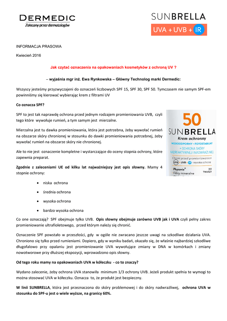 INFORMACJA PRASOWA Kwiecień 2016 Jak czytać oznaczenia na opakowaniach kosmetyków z ochroną UV ? – wyjaśnia mgr inż. Ewa Rynkowska – Główny Technolog marki Dermedic: Wszyscy jesteśmy przyzwyczajeni do oznaczeń liczbowych SPF 15, SPF 30, SPF 50. Tymczasem nie samym SPF‐em powinniśmy się kierować wybierając krem z filtrami UV Co oznacza SPF? SPF to jest tak naprawdę ochrona przed jednym rodzajem promieniowania UVB, czyli tego które wywołuje rumień, a tym samym jest mierzalne. Mierzalna jest tu dawka promieniowania, która jest potrzebna, żeby wywołać rumień na obszarze skóry chronionej w stosunku do dawki promieniowania potrzebnej, żeby wywołać rumień na obszarze skóry nie chronionej. Ale to nie jest oznaczenie kompletne i wystarczające do oceny stopnia ochrony, które zapewnia preparat. Zgodnie z zaleceniami UE od kilku lat najważniejszy jest opis słowny. Mamy 4 stopnie ochrony: niska ochrona średnia ochrona wysoka ochrona bardzo wysoka ochrona Co one oznaczają? SPF obejmuje tylko UVB. Opis słowny obejmuje zarówno UVB jak i UVA czyli pełny zakres promieniowanie ultrafioletowego, przed którym należy się chronić. Oznaczenie SPF powstało w przeszłości, gdy w ogóle nie zwracano jeszcze uwagi na szkodliwe działania UVA. Chroniono się tylko przed rumieniami. Dopiero, gdy w wyniku badań, okazało się, że właśnie najbardziej szkodliwe długofalowo przy opalaniu jest promieniowanie UVA wywołujące zmiany w DNA w komórkach i zmiany nowotworowe przy dłuższej ekspozycji, wprowadzono opis słowny. Od tego roku mamy na opakowaniach UVA w kółeczku ‐ co to znaczy? Wydano zalecenie, żeby ochrona UVA stanowiła minimum 1/3 ochrony UVB. Jeżeli produkt spełnia te wymogi to można stosować UVA w kółeczku. Oznacza to, że produkt jest bezpieczny. W linii SUNBRELLA, która jest przeznaczona do skóry problemowej i do skóry nadwrażliwej, ochrona UVA w stosunku do SPF‐u jest o wiele wyższe, na granicy 60%. Fotostabilność i wodoodporność Produkt ochrony przeciwsłonecznej musi być wodoodporny i musi być fotostabilny . Wodoodporność definiowana jest przez Europejskie Stowarzyszenie do Spraw Produktów Toaletowych i Perfumeryjnych COLIPA. Jest to iloraz wartości współczynnika SPF przed kontaktem z wodą do wartości współczynnika SPF po dwukrotnej 20‐minutowej kąpieli w jacuzzi Wodoodporność oznacza zachowanie przez produkt właściwości ochronnych przed promieniowaniem UV nawet po dwóch 20‐minutowych kąpielach wodnych przy czym ochrona ta nie może być mniejsza niż 50% tej deklarowanej na opakowaniu. Według przyjętej w branży definicji, kosmetyk wodoodporny to taki, którego SPF po 40 minutach przebywania w wodzie wynosi > 50% SPF przed kąpielą. Kosmetyk wysoce wodoodporny to taki, którego SPF po 80 minutach przebywania w wodzie wynosi > 50% SPF przed kąpielą. W produktach SUNBRELLA wodoodporność gwarantują: - - Użyte surowce i ich potwierdzona wodoodporność, a wśród nich: Tinosorb M (filtr) Abil OSW5 (składnik zabezpieczający całość formulacji) Rodzaj formuły – produkty SUNBRELLA BABY oparte są na konstrukcji typu woda w oleju, dzięki czemu substancje ochronne nie rozpuszczają się w wodzie. Fotostabilność to zdolność cząsteczki filtru do utrzymania swych właściwości ochronnych w stanie niezmienionym przez określony przedział czasu, podczas którego jest on poddany działaniu promieni słonecznych. Fotostabilność w SUNBRELLI osiągamy dzięki: • Stosowaniu w formulacji więcej niż jednego filtra UV różniących się budową cząsteczek • Zastosowaniu w formułach APS – Advanced Protection System - odpowiedniej mieszaniny filtrów w odpowiednich proporcjach, które uzupełniają się w pochłanianiu energii promieniowania UVA i UVB • Zastosowaniu Ronacare AP – składnika chroniącego cząsteczki filtrów przed rozpadem **** Więcej informacji: Angelika Popiołek, PR & Media Manager marki Dermedic Telefon: +48 698 585 990 / email: [email protected]