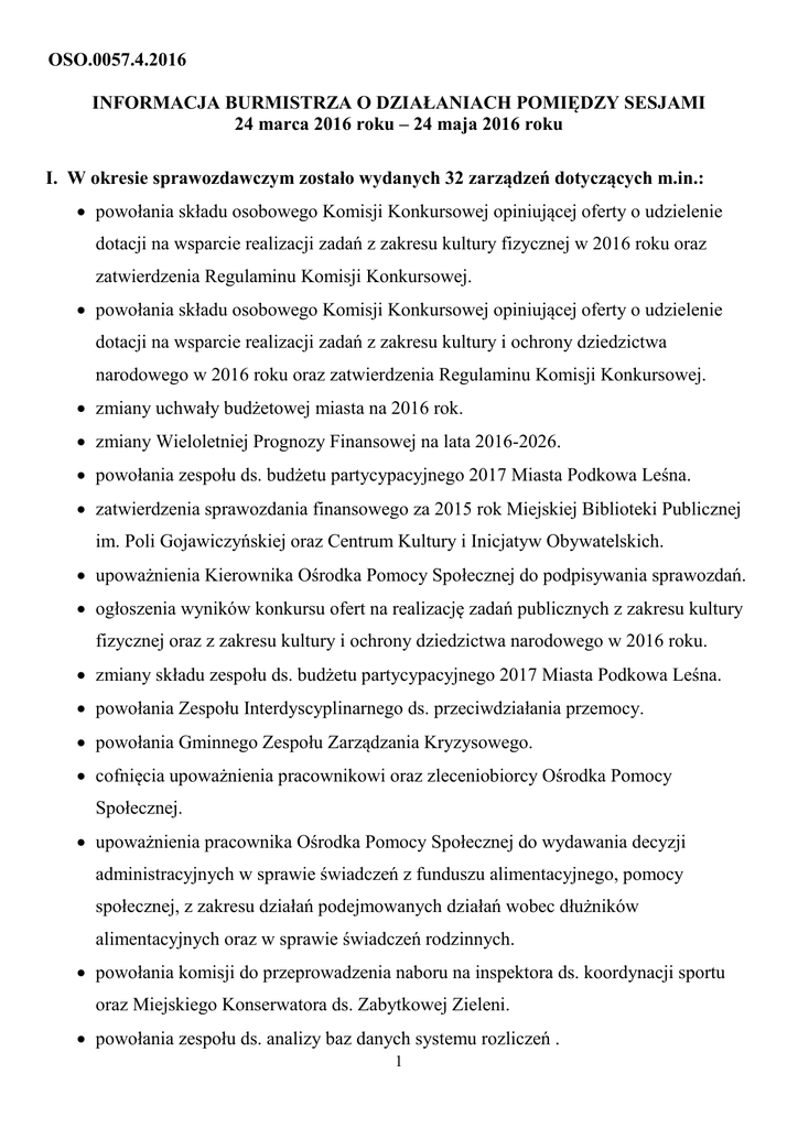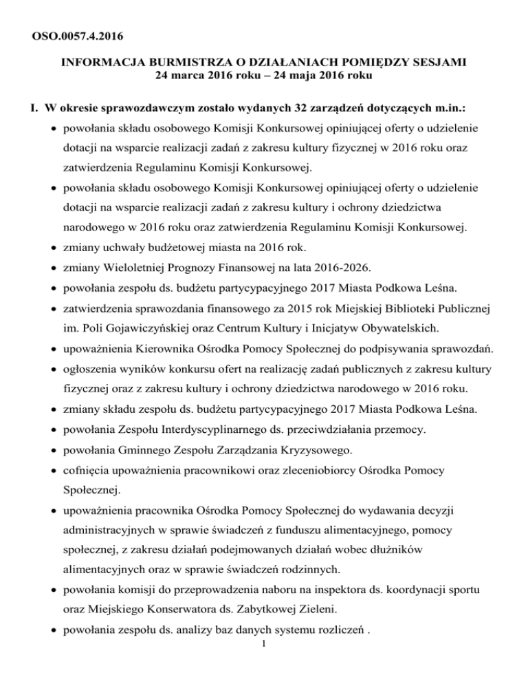 OSO.0057.4.2016 INFORMACJA BURMISTRZA O DZIAŁANIACH POMIĘDZY SESJAMI 24 marca 2016 roku – 24 maja 2016 roku I. W okresie sprawozdawczym zostało wydanych 32 zarządzeń dotyczących m.in.: • powołania składu osobowego Komisji Konkursowej opiniującej oferty o udzielenie dotacji na wsparcie realizacji zadań z zakresu kultury fizycznej w 2016 roku oraz zatwierdzenia Regulaminu Komisji Konkursowej. • powołania składu osobowego Komisji Konkursowej opiniującej oferty o udzielenie dotacji na wsparcie realizacji zadań z zakresu kultury i ochrony dziedzictwa narodowego w 2016 roku oraz zatwierdzenia Regulaminu Komisji Konkursowej. • zmiany uchwały budżetowej miasta na 2016 rok. • zmiany Wieloletniej Prognozy Finansowej na lata 2016-2026. • powołania zespołu ds. budżetu partycypacyjnego 2017 Miasta Podkowa Leśna. • zatwierdzenia sprawozdania finansowego za 2015 rok Miejskiej Biblioteki Publicznej im. Poli Gojawiczyńskiej oraz Centrum Kultury i Inicjatyw Obywatelskich. • upoważnienia Kierownika Ośrodka Pomocy Społecznej do podpisywania sprawozdań. • ogłoszenia wyników konkursu ofert na realizację zadań publicznych z zakresu kultury fizycznej oraz z zakresu kultury i ochrony dziedzictwa narodowego w 2016 roku. • zmiany składu zespołu ds. budżetu partycypacyjnego 2017 Miasta Podkowa Leśna. • powołania Zespołu Interdyscyplinarnego ds. przeciwdziałania przemocy. • powołania Gminnego Zespołu Zarządzania Kryzysowego. • cofnięcia upoważnienia pracownikowi oraz zleceniobiorcy Ośrodka Pomocy Społecznej. • upoważnienia pracownika Ośrodka Pomocy Społecznej do wydawania decyzji administracyjnych w sprawie świadczeń z funduszu alimentacyjnego, pomocy społecznej, z zakresu działań podejmowanych działań wobec dłużników alimentacyjnych oraz w sprawie świadczeń rodzinnych. • powołania komisji do przeprowadzenia naboru na inspektora ds. koordynacji sportu oraz Miejskiego Konserwatora ds. Zabytkowej Zieleni. • powołania zespołu ds. analizy baz danych systemu rozliczeń . 1 II. Spotkania pomiędzy sesjami: • z panem Pawłem Komenderem, członkiem Rady Sołeckiej Żółwina dotyczące nowej drogi powiatowej na terenie gmin Brwinów i Nadarzyn. (przedłużenie ulicy Słonecznej, poprzez teren sołectwa Terenia, przycinającej ulicę Grodziską w Starej Wsi do węzła Młochów na trasie S7. • z panią Wiesławą Kwiatkowską - burmistrz Miasta Milanówka, z panem Arkadiuszem Kosińskim - burmistrzem Gminy Brwinów, z panem Sebastianem Budziszewskim Prezesem Zarządu Milanowskiego Przedsiębiorstwa Wodociągów dotyczące wzajemnych rozliczeń za wodę i ścieki oraz prowadzenia prac inwestycyjnych. • wójtów, burmistrzów, prezydentów gmin i miast – partnerów m.st. Warszawy w ramach Warszawskiego Obszaru Funkcjonalnego ZIT. • z przedstawicielami Instytutu Spraw Publicznych i TPMO. • z panią Magdą Chustecką z Towarzystwa Edukacji Antydyskryminacyjnej. • z panią Barbarą Jezierską, Mazowieckim Wojewódzkim Konserwatorem Zabytków. • z Wojewodą Mazowieckim i włodarzami gmin mazowieckich ws współpracy administracji rządowej w terenie z jednostkami samorządu terytorialnego. • Prezydentów, Burmistrzów i Wójtów JST gmin Brwinów, Grodzisk Maz.. Jaktorów, Michałowice i miast Milanówek, Piastów, Podkowa Leśna, Pruszków i Żyrardów ws porozumienia dotyczącego wspólnego składania wniosków o dofinansowanie ścieżek rowerowych. III. Sprawy bieżące: • trwa nabór na stanowisko Miejskiego Konserwatora ds. Zabytkowej Zieleni • w kwietniu otrzymaliśmy dofinansowanie w wysokości 303.264 zł (wartość projektu 336.960 zł) na pielęgnację drzew w parku; • w maju – w wysokości 92.000 zł (wartość projektu 102.146,40 zł) na pielęgnację 194 pomników przyrody, w tym na terenach prywatnych. • złożyliśmy wniosek na termomodernizację budynków publicznych i komunalnych na kwotę 1.366.230,49 zł – 80% dofinansowania 2 • na ukończeniu są prace nad wnioskiem o dofinansowanie dotyczącym rozbudowy biblioteki – zadanie 5.3 RPO WM. Kwota ok. 1.3 mln, termin składania wniosku 1 VI. • trwają uzgodnienia projektów przebudowy węzła ulic Modrzewiowa/Kościelna w Starostwie Powiatowym – otrzymaliśmy negatywne opinie komunikacyjne wydziału komunikacji starostwa grodziskiego. Przygotowywane są wystąpienia do Ministra Infrastruktury o uzyskanie odstępstw. • uzgodniono projekt remontu odtworzeniowego przedłużenia ulicy Błońskiej na odcinku ul. Słowiczej do terenu WKD • uzyskaliśmy odstępstwa od przepisów techniczno-budowlanych dla przebudowy węzła ulic Jodłowa, Reymonta, Bukowa dzięki czemu uzyskamy zgody i pozwolenia na budowę w formie zaproponowanej przez miasto przy aprobacie mieszkańców dotyczące : 1- przebudowy połączenia ulic Lipowej- Bukowej- Sosnowej –Topolowej (rondo), 2- przebudowy ul. Bukowej na odcinku Lipowa – Reymonta, 3- przebudowy ulicy Jodłowej, 4- przebudowy ulicy Reymonta na odcinku od ulicy Żeromskiego do ulicy Słowackiego, 5- oraz projektu organizacji ruchu dla całego rejonu z podziałem na poszczególne zadania • trwa wykonywanie projektu zmian w organizacji ruchu w ulicy Jałowcowej przewidującego wykonanie progów zwalniających. Ze względu na brak uzyskania uzgodnień przez Starostę Grodziskiego projektant złożył ponownie odwołanie do Wojewody Mazowieckiego • wykonano remont chodnika na ul. Modrzewiowej na odcinku ulic Wschodnia Sosnowa • rozpoczęto przygotowanie dokumentów formalno-prawnych pozwalających na wykonanie remontu nawierzchni na ulicy Modrzewiowej na odcinku Wschodnia – Sosnowa, polegającego na wymianie warstwy ścieralnej, krawężnika po stronie północnej oraz nawierzchni zjazdów po stronie północnej. 3 • rozpoczęto przygotowanie dokumentów formalno-prawnych pozwalających na wykonanie remontu chodnika na ul. Głównej (Miejska-cmentarz), parking polegającego na wymianie zużytych 