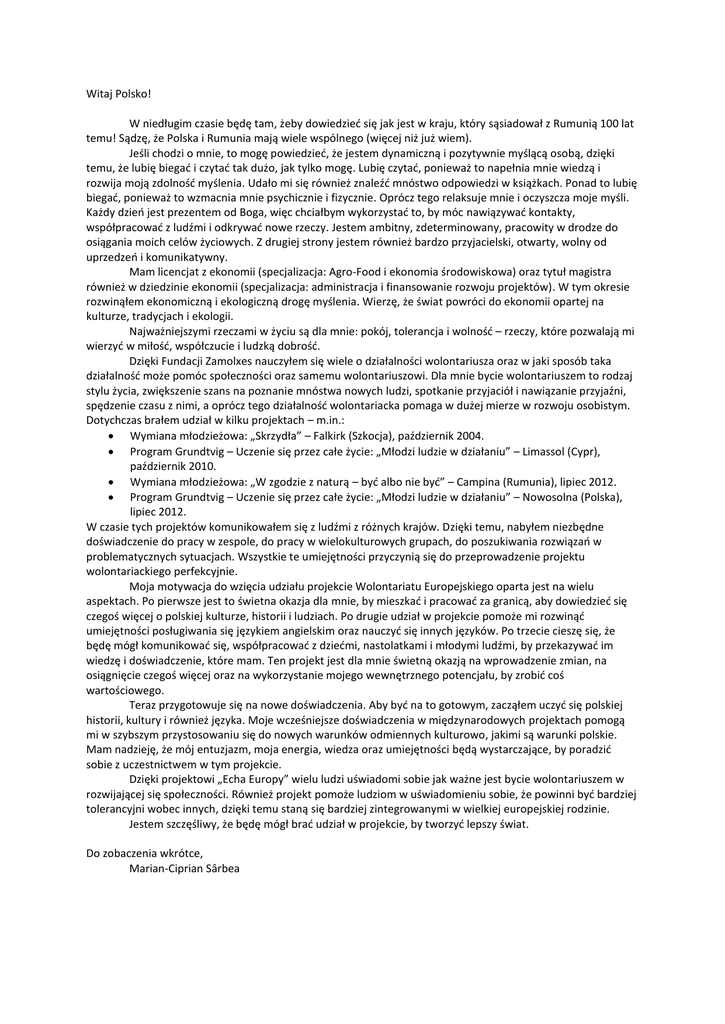 Witaj Polsko! W niedługim czasie będę tam, żeby dowiedzieć się jak jest w kraju, który sąsiadował z Rumunią 100 lat temu! Sądzę, że Polska i Rumunia mają wiele wspólnego (więcej niż już wiem). Jeśli chodzi o mnie, to mogę powiedzieć, że jestem dynamiczną i pozytywnie myślącą osobą, dzięki temu, że lubię biegać i czytać tak dużo, jak tylko mogę. Lubię czytać, ponieważ to napełnia mnie wiedzą i rozwija moją zdolność myślenia. Udało mi się również znaleźć mnóstwo odpowiedzi w książkach. Ponad to lubię biegać, ponieważ to wzmacnia mnie psychicznie i fizycznie. Oprócz tego relaksuje mnie i oczyszcza moje myśli. Każdy dzień jest prezentem od Boga, więc chciałbym wykorzystać to, by móc nawiązywać kontakty, współpracować z ludźmi i odkrywać nowe rzeczy. Jestem ambitny, zdeterminowany, pracowity w drodze do osiągania moich celów życiowych. Z drugiej strony jestem również bardzo przyjacielski, otwarty, wolny od uprzedzeń i komunikatywny. Mam licencjat z ekonomii (specjalizacja: Agro-Food i ekonomia środowiskowa) oraz tytuł magistra również w dziedzinie ekonomii (specjalizacja: administracja i finansowanie rozwoju projektów). W tym okresie rozwinąłem ekonomiczną i ekologiczną drogę myślenia. Wierzę, że świat powróci do ekonomii opartej na kulturze, tradycjach i ekologii. Najważniejszymi rzeczami w życiu są dla mnie: pokój, tolerancja i wolność – rzeczy, które pozwalają mi wierzyć w miłość, współczucie i ludzką dobrość. Dzięki Fundacji Zamolxes nauczyłem się wiele o działalności wolontariusza oraz w jaki sposób taka działalność może pomóc społeczności oraz samemu wolontariuszowi. Dla mnie bycie wolontariuszem to rodzaj stylu życia, zwiększenie szans na poznanie mnóstwa nowych ludzi, spotkanie przyjaciół i nawiązanie przyjaźni, spędzenie czasu z nimi, a oprócz tego działalność wolontariacka pomaga w dużej mierze w rozwoju osobistym. Dotychczas brałem udział w kilku projektach – m.in.: Wymiana młodzieżowa: „Skrzydła” – Falkirk (Szkocja), październik 2004. Program Grundtvig – Uczenie się przez całe życie: „Młodzi ludzie w działaniu” – Limassol (Cypr), październik 2010. Wymiana młodzieżowa: „W zgodzie z naturą – być albo nie być” – Campina (Rumunia), lipiec 2012. Program Grundtvig – Uczenie się przez całe życie: „Młodzi ludzie w działaniu” – Nowosolna (Polska), lipiec 2012. W czasie tych projektów komunikowałem się z ludźmi z różnych krajów. Dzięki temu, nabyłem niezbędne doświadczenie do pracy w zespole, do pracy w wielokulturowych grupach, do poszukiwania rozwiązań w problematycznych sytuacjach. Wszystkie te umiejętności przyczynią się do przeprowadzenie projektu wolontariackiego perfekcyjnie. Moja motywacja do wzięcia udziału projekcie Wolontariatu Europejskiego oparta jest na wielu aspektach. Po pierwsze jest to świetna okazja dla mnie, by mieszkać i pracować za granicą, aby dowiedzieć się czegoś więcej o polskiej kulturze, historii i ludziach. Po drugie udział w projekcie pomoże mi rozwinąć umiejętności posługiwania się językiem angielskim oraz nauczyć się innych języków. Po trzecie cieszę się, że będę mógł komunikować się, współpracować z dziećmi, nastolatkami i młodymi ludźmi, by przekazywać im wiedzę i doświadczenie, które mam. Ten projekt jest dla mnie świetną okazją na wprowadzenie zmian, na osiągnięcie czegoś więcej oraz na wykorzystanie mojego wewnętrznego potencjału, by zrobić coś wartościowego. Teraz przygotowuje się na nowe doświadczenia. Aby być na to gotowym, zacząłem uczyć się polskiej historii, kultury i również języka. Moje wcześniejsze doświadczenia w międzynarodowych projektach pomogą mi w szybszym przystosowaniu się do nowych warunków odmiennych kulturowo, jakimi są warunki polskie. Mam nadzieję, że mój entuzjazm, moja energia, wiedza oraz umiejętności będą wystarczające, by poradzić sobie z uczestnictwem w tym projekcie. Dzięki projektowi „Echa Europy” wielu ludzi uświadomi sobie jak ważne jest bycie wolontariuszem w rozwijającej się społeczności. Również projekt pomoże ludziom w uświadomieniu sobie, że powinni być bardziej tolerancyjni wobec innych, dzięki temu staną się bardziej zintegrowanymi w wielkiej europejskiej rodzinie. Jestem szczęśliwy, że będę mógł brać udział w projekcie, by tworzyć lepszy świat. Do zobaczenia wkrótce, Marian-Ciprian Sârbea