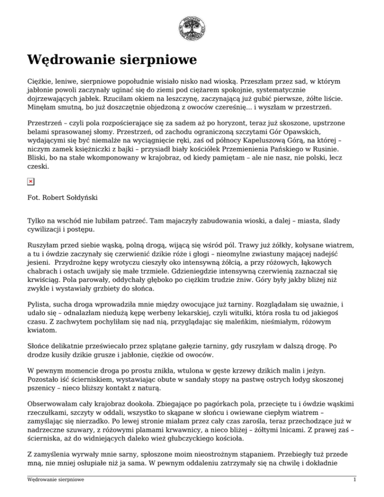 Wędrowanie sierpniowe Ciężkie, leniwe, sierpniowe popołudnie wisiało nisko nad wioską. Przeszłam przez sad, w którym jabłonie powoli zaczynały uginać się do ziemi pod ciężarem spokojnie, systematycznie dojrzewających jabłek. Rzuciłam okiem na leszczynę, zaczynającą już gubić pierwsze, żółte liście. Minęłam smutną, bo już doszczętnie objedzoną z owoców czereśnię... i wyszłam w przestrzeń. Przestrzeń – czyli pola rozpościerające się za sadem aż po horyzont, teraz już skoszone, upstrzone belami sprasowanej słomy. Przestrzeń, od zachodu ograniczoną szczytami Gór Opawskich, wydającymi się być niemalże na wyciągnięcie ręki, zaś od północy Kapeluszową Górą, na której – niczym zamek księżniczki z bajki – przysiadł biały kościółek Przemienienia Pańskiego w Rusinie. Bliski, bo na stałe wkomponowany w krajobraz, od kiedy pamiętam – ale nie nasz, nie polski, lecz czeski. Fot. Robert Sołdyński Tylko na wschód nie lubiłam patrzeć. Tam majaczyły zabudowania wioski, a dalej – miasta, ślady cywilizacji i postępu. Ruszyłam przed siebie wąską, polną drogą, wijącą się wśród pól. Trawy już żółkły, kołysane wiatrem, a tu i ówdzie zaczynały się czerwienić dzikie róże i głogi – nieomylne zwiastuny mającej nadejść jesieni. Przydrożne kępy wrotyczu cieszyły oko intensywną żółcią, a przy różowych, łąkowych chabrach i ostach uwijały się małe trzmiele. Gdzieniegdzie intensywną czerwienią zaznaczał się krwiściąg. Pola parowały, oddychały głęboko po ciężkim trudzie żniw. Góry były jakby bliżej niż zwykle i wystawiały grzbiety do słońca. Pylista, sucha droga wprowadziła mnie między owocujące już tarniny. Rozglądałam się uważnie, i udało się – odnalazłam niedużą kępę werbeny lekarskiej, czyli witułki, która rosła tu od jakiegoś czasu. Z zachwytem pochyliłam się nad nią, przyglądając się maleńkim, nieśmiałym, różowym kwiatom. Słońce delikatnie przeświecało przez splątane gałęzie tarniny, gdy ruszyłam w dalszą drogę. Po drodze kusiły dzikie grusze i jabłonie, ciężkie od owoców. W pewnym momencie droga po prostu znikła, wtulona w gęste krzewy dzikich malin i jeżyn. Pozostało iść ścierniskiem, wystawiając obute w sandały stopy na pastwę ostrych łodyg skoszonej pszenicy – nieco bliższy kontakt z naturą. Obserwowałam cały krajobraz dookoła. Zbiegające po pagórkach pola, przecięte tu i ówdzie wąskimi rzeczułkami, szczyty w oddali, wszystko to skąpane w słońcu i owiewane ciepłym wiatrem – zamyślając się nierzadko. Po lewej stronie miałam przez cały czas zarośla, teraz przechodzące już w nadrzeczne szuwary, z różowymi plamami krwawnicy, a nieco bliżej – żółtymi lnicami. Z prawej zaś – ścierniska, aż do widniejących daleko wież głubczyckiego kościoła. Z zamyślenia wyrwały mnie sarny, spłoszone moim nieostrożnym stąpaniem. Przebiegły tuż przede mną, nie mniej osłupiałe niż ja sama. W pewnym oddaleniu zatrzymały się na chwilę i dokładnie Wędrowanie sierpniowe 1 zlustrowały mnie wzrokiem, nieco zdziwionym. I ja miałam okazję, by im się lepiej przyjrzeć, popatrzeć w ich piękne oczy, a wreszcie, podziwiać ich zwinny bieg przez pola. Nagle spod nóg prysnęła mi zdenerwowana kuropatwa, z krzykiem pełnym oburzenia. Jak zwykle, zapatrzona w rośliny, świat zwierząt dostrzegałam dopiero wówczas, gdy wyraźnie zamanifestował swoją obecność. Flora odwdzięczała się jednak, wprost rzucając mi w oczy to, co miała najpiękniejszego. Na słonecznym wzgórzu, nieco dalej, odnalazłam jedną, jedyną centurię, spoglądającą na mnie szeroko otwartymi, liliowymi oczami. Słońce schodziło coraz niżej, z daleka dały się słyszeć dzwony wzywające na codzienną mszę. Trzeba mi było wracać, zostawiając za sobą nagrzane pola, żółte ścierniska i kolorowe od kwiatów zarośla. Agata Borzęcka Wędrowanie sierpniowe 2
