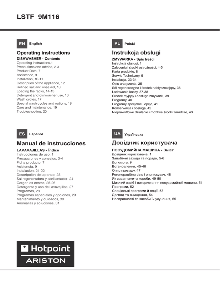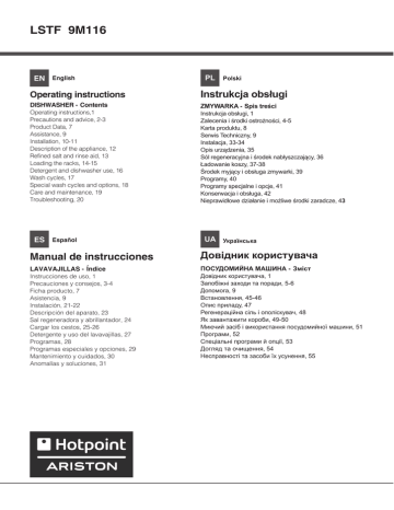 LSTF 9M116 EN English PL Polski Operating instructions Instrukcja obsługi DISHWASHER - Contents ZMYWARKA - Spis treści Operating instructions,1 Precautions and advice, 2-3 Product Data, 7 Assistance, 9 Installation, 10-11 Description of the appliance, 12 Refined salt and rinse aid, 13 Loading the racks, 14-15 Detergent and dishwasher use, 16 Wash cycles, 17 Special wash cycles and options, 18 Care and maintenance, 19 Troubleshooting, 20 ES Español Instrukcja obsługi, 1 Zalecenia i środki ostrożności, 4-5 Karta produktu, 8 Serwis Techniczny, 9 Instalacja, 33-34 Opis urządzenia, 35 Sól regeneracyjna i środek nabłyszczający, 36 Ładowanie koszy, 37-38 Środek myjący i obsługa zmywarki, 39 Programy, 40 Programy specjalne i opcje, 41 Konserwacja i obsługa, 42 Nieprawidłowe działanie i możliwe środki zaradcze, 43 UA Українська Manual de instrucciones Довідник користувача LAVAVAJILLAS - Índice ПОСУДОМИЙНА МАШИНА - Зміст Instrucciones de uso, 1 Precauciones y consejos, 3-4 Ficha producto, 7 Asistencia, 9 Instalación, 21-22 Descripción del aparato, 23 Sal regeneradora y abrillantador, 24 Cargar los cestos, 25-26 Detergente y uso del lavavajillas, 27 Programas, 28 Programas especiales y opciones, 29 Mantenimiento y cuidados, 30 Anomalías y soluciones, 31 Довідник користувача, 1 Запобіжні заходи та поради, 5-6 Допомога, 9 Встановлення, 45-46 Опис приладу, 47 Регенераційна сіль і ополіскувач, 48 Як завантажити короби, 49-50 Миючий засіб і використання посудомийної машини, 51 Програми, 52 Спеціальні програми й опції, 53 Догляд та очищення, 54 Несправності та засоби їх усунення, 55 EN Precautions and advice This appliance was designed and manufactured in compliance with international safety standards. The following information has been provided for safety reasons and should be read carefully. Keep this instruction manual in a safe place for future reference. If the appliance is sold, given away or moved, make sure the manual is kept with the machine. Read the instructions carefully, as they include important information on safe installation, use and maintenance. This appliance was designed for domestic use or similar applications, for example: - farmhouses; - use by guests in hotels, motels and other residential settings; - bed & breakfasts. Remove the appliance from all packaging and make sure it was not damaged during transportation. If it was damaged, contact the retailer and do not proceed any further with the installation process. General safety • This appliance should not be operated by children younger than 8 years, people with reduced physical, sensory or mental capacities, or inexperienced people who are not familiar with the product, unless they are given close supervision or instructions on how to use it safely and are made aware by a responsible person of the dangers its use might entail. • Children must not play with the appliance. • It is the user's responsibility to clean and maintain the appliance. Children should never clean or maintain it unless they are given supervision. •The appliance was designed for domestic use inside the home and is not intended for commercial or industrial use. •The appliance must be used to wash domestic crockery in accordance with the instructions in this manual. •The appliance must not be installed outdoors, even in covered areas. It is extremely dangerous to leave the machine exposed to rain and storms. •Do not touch the appliance when barefoot. •When unplugging the appliance always 2 pull the plug from the mains socket. Do not pull on the cable. •The water supply tap must be shut off and the plug should be removed from the electrical socket at the end of every cycle and before cleaning the appliance or carrying out any maintenance work. •The maximum number of place settings is shown in the product sheet. •If the appliance breaks down, do not under any circumstances touch the internal parts in an attempt to perform the repair work yourself. •Do not lean or sit on the open door: this may cause the appliance to overturn. • The door should not be left open as it may create a dangerous obstacle. •Keep detergent and rinse aid out of reach of children. •The packaging material should not be used as a toy. • Knives and other utensils with sharp edges must be placed either with the points/blades facing downwards in the cutlery basket or horizontally on the tip-up compartments or in the tray/third basket, if available. Disposal •To dispose of any packaging materials, follow local legislation so that the packagings may be reused. •The European Directive 2012/19/EU relating to Waste Electrical and Electronic Equipment (WEEE) states that household appliances should not be disposed of using the normal solid urban waste cycle. Exhausted appliances should be collected separately in order to optimise the cost of reusing and recycling the materials inside the machine, while preventing potential damage to the atmosphere and public health. The crossed-out dustbin symbol shown on all products reminds the owners of their obligations regarding separated waste collection. For further information relating to the correct disposal of household appliances, owners may contact the relevant public authority or the local appliance dealer. Saving energy and respecting the environment Saving water and energy •Only begin a wash cycle when the dishwasher is full. While waiting for the dishwasher to be filled, prevent unpleasant odours with the Soak cycle (if available, see El aparato ha sido proyectado y fabricado en conformidad con las normas internacionales de seguridad Estas advertencias se suministran por razones de seguridad y deben ser le