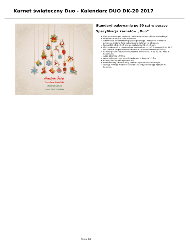 Karnet świąteczny Duo - Kalendarz DUO DK-20 2017 Standard pakowania po 50 szt w paczce Specyfikacja karnetów „Duo” druk na ozdobnym papierze z delikatną fakturą płótna malarskiego; wnętrze karnetu w kolorze białym; wzornictwo z elementami pejzażu polskiego i motywów ludowych; zdobienia srebrną folią zadrukowaną kolorowym obrazem; format DK 14,5 x 14,5 cm; po rozłożeniu 29 x 14,5 cm; (DK) maksymalna powierzchnia pod nadruk życzeń firmowych 29 x 14,5 cm (nadruk bezpośrednio na karnecie, brak dodatkowej wkładki); karnety pakowane płasko w pudełka z mikrofali 2 x po 50 szt. wraz z kopertami; waga zbiorcza 1.90 kg; waga pojedynczego kompletu (karnet + koperta): 16 g; karnety bez stopki wydawniczej; kod kreskowy umieszczony tylko na opakowaniu zbiorczym; istnieje również możliwość wykonania indywidualnego nadruku na karnecie. Strona 1/1 Powered by TCPDF (www.tcpdf.org)