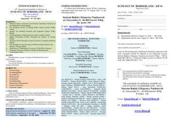 ANNOUNCEMENT No 1 14th International Scientific Conference on ECOLOGY OF BORDERLAND – EB’16 http://www.iben.pl Poznań -Poland September 19 - 20, 2016 Organizers: Poland Academy of Sciences Unit Poznań, Committee of Sciences of the Organization and managing The European Society of Ecology High Council, Gorzów Wlkp., Poland Institute for Scientific Research and Expertises Gorzów Wlkp., Poland Westpomeranian Technological University in Stettin, Poland Higher Professional School “Personnel for Europe” in Poznan, Poland European Social Movement Central Executive Committee Barlinek, Poland The committee of Sea Sociology of Polish Academy Sciences the Squad in Danzig, Poland State Moscow Technological University STANKIN in Moscow Technical University of Kośice, Fakulty of Manufacturing Technologies Preśov SCOPE Recapitulation in range of ecology of borderland the newest achievements. Ecologists' meeting. Lay-out the directions of working from now on in range of audits of ecology borderland. SUBJECTS 1. 2. 3. 4. 5. 6. 7. 8. 9. Ecosociology Ecomanagement Ecomedicine Ecoeconomy Ecotourism Ecotechnology Protection of the ground Forest ecosystems Economy waters LANGUAGES They are working languages Polish, English and Russian. All received sended in of these languages reports will be published after previous obtainment review. INSTRUCTIONS FOR AUTHORS The Scientific Committee encloses the instruction for authors how papers should be prepared for publishing. Submitted papers will undergo an evaluation. IMPORTANT DATES Registering the participation in the Conference –August 31, 2016 Delivering the completed text of a paper - September 07, 2016 The Conference - September 19 -20, 2016 OTHER INFORMATION To obtain more information please fill the Conference registration form and send it by 31 August 2016 to the following address: Instytut Badań i Ekspertyz Naukowych ul. Górczyńska 21, 66-400 Gorzów Wlkp., skr. poczt. 156 ECOLOGY OF BORDERLAND – EB’16 Registration Form Title: Prof., Dr., Mr, Ms Name and Forename ................................................................................... Institution:................................................................................................... ..................................................................................................................... ..................................................................................................................... E-mail: [email protected] or [email protected] or [email protected] Mailing address: ......................................................................................... tel./faks +48957228913, tel. +48957226564 Registration fee Tel.:............................................ Fax:......................................................... THE INTERNATIONAL SCIENTIFIC COMMITTEE Registration and fee by August 31, 2016 – 200 EUR Registration and fee since August 31, 2016 – 300 EUR The manner of payment: transfer or cash Chairman Tadeusz ZABOROWSKI - Poland Vice-Chairman Fang HAI-PING - Chinas, Jozef JURKO – Slovakia, Ivan MAŚEK – Czech Republik, Werner RICHTER – Germany, Leonid SHVARTBURG – Russia, Robert WOŹNIAK - Poland Amount paid for one person EUR ................... Copy of effected payment confirmation should be enclosed to this form. Payments should be effected to the following account: Instytut Badań i Ekspertyz Naukowych Gorzów Wlkp. – EB’16, Bank PKO BP S.A., O/Gorzów Wlkp, account No. IBAN: PL 09 1020 1967 0000 8502 0071 7371 .............................................................. Scientific Secretary (Signature of Participant) Wawrzyniec WAWRZYNIAK – Poland Organizational secretary Robert ZABOROWSKI - Poland Members Igor ARIEFYEV – Poland, Joseph D. BAGYARAJ – India, V.BU ŁGAKOV – Ukraine, David CAHEN – Israel, Alberta C. DIAS – Portugal, Marian MALICKI – Poland, Luis V. DIAZ–MARTIN Spain, Wladimir I.DOBRENIKOW – Russia, Maciej DZIKUĆ – Poland, Mauro FELLI – Italy, Kohzaburo FUJIKAWAYAMAMOTO – Japan, GALEMBECK – Fernando Brazil, Wladimir I.GUTKIN – Russia, Samir R. HAJARNIS – Sweden, Wiesław HŁADKIEWICZ – Poland, Tadeusz HOROSZKIEWICZ – Poland, Joao V. ISSLER – Brazil, Michael D. JACOBSON – Great Britain, Stanisław JANIK – Poland, Jonathan KARN – England, Heralampos KATSIKAS – Greece, Zbigniew KULAS – Poland, Ivan KURIC – Slovakia, Piotr KURYŁO – Poland, Gerarda Lamas MÜLLER – Peru, Jos M. LAMERS – Netherlands, Zdenek LAŚTUVKA – the Czech Republic, Chaudhary A. MAJID – Pakistan, Anita Sui Woh – Poppy Australia, Janusz MYSŁOWSKI – Poland, Bich Loc THI–NGUYEN - Vietnam, Arkadiusz PIWOWAR – Poland, Tatyana RONGIŃSKA – Poland, Stefan TRZCIELIŃSKI – Poland, Stefan VACLAV – Slovakia, Reiner VEITIA – France, Jozef ZAJAC – Slovakia, Maria ŻUK– Belarus Note: 1. 2. 3. 4. Every participant has to fill the separate form Please fill this form distinctly in printing. The registration fee covers a copy of the Conference Proceedings. The Registration Form should be returned to the following address: The secretariat of conference scientific on. THE ECOLOGY OF BORDERLAND – EB’16 Instytut Badań i Ekspertyz Naukowych ul. Górczyńska 21, 66-400 Gorzów Wlkp. P.O.Box 156 E-mail: [email protected] or [email protected] or [email protected] www.iben.pl I make a proposal report(announcement) under title. .................................................................................. ECOLOGY OF BORDERLAND .................................................................................. .................................................................................. .................................................................................. – EB’16 Co-authors: .................................................................................. .................................................................................. Sum