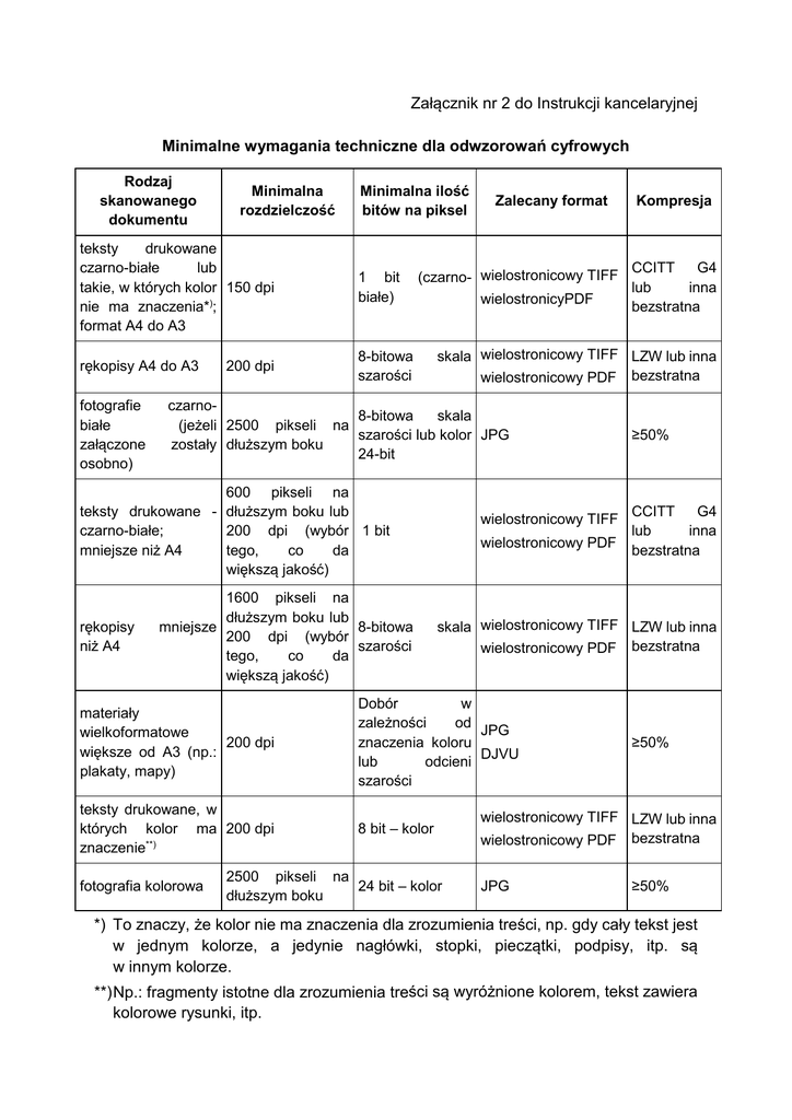 Załącznik nr 2 do Instrukcji kancelaryjnej Minimalne wymagania techniczne dla odwzorowań cyfrowych Rodzaj skanowanego dokumentu Minimalna rozdzielczość Minimalna ilość bitów na piksel teksty drukowane czarno-białe lub takie, w których kolor 150 dpi nie ma znaczenia*); format A4 do A3 1 bit białe) rękopisy A4 do A3 8-bitowa szarości fotografie białe załączone osobno) 200 dpi skala wielostronicowy TIFF LZW lub inna wielostronicowy PDF bezstratna czarno8-bitowa skala (jeżeli 2500 pikseli na szarości lub kolor JPG zostały dłuższym boku 24-bit 1600 pikseli na dłuższym boku lub mniejsze 8-bitowa 200 dpi (wybór szarości tego, co da większą jakość) wielostronicowy TIFF wielostronicowy PDF ≥50% CCITT G4 lub inna bezstratna skala wielostronicowy TIFF LZW lub inna wielostronicowy PDF bezstratna materiały wielkoformatowe 200 dpi większe od A3 (np.: plakaty, mapy) Dobór w zależności od JPG znaczenia koloru DJVU lub odcieni szarości teksty drukowane, w których kolor ma 200 dpi znaczenie**) 8 bit – kolor fotografia kolorowa Kompresja CCITT G4 (czarno- wielostronicowy TIFF lub inna wielostronicyPDF bezstratna 600 pikseli na teksty drukowane - dłuższym boku lub czarno-białe; 200 dpi (wybór 1 bit mniejsze niż A4 tego, co da większą jakość) rękopisy niż A4 Zalecany format 2500 pikseli na 24 bit – kolor dłuższym boku ≥50% wielostronicowy TIFF LZW lub inna wielostronicowy PDF bezstratna JPG ≥50% *) To znaczy, że kolor nie ma znaczenia dla zrozumienia treści, np. gdy cały tekst jest w jednym kolorze, a jedynie nagłówki, stopki, pieczątki, podpisy, itp. są w innym kolorze. **) Np.: fragmenty istotne dla zrozumienia treści są wyróżnione kolorem, tekst zawiera kolorowe rysunki, itp.