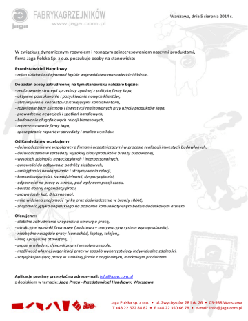 Warszawa, dnia 5 sierpnia 2014 r. W związku z dynamicznym rozwojem i rosnącym zainteresowaniem naszymi produktami, firma Jaga Polska Sp. z o.o. poszukuje osoby na stanowisko: Przedstawiciel Handlowy - rejon działania obejmował będzie województwo mazowieckie i łódzkie. Do zadań osoby zatrudnionej na tym stanowisku należało będzie: - realizowanie strategii sprzedaży zgodnej z polityką firmy Jaga, - aktywne poszukiwanie i pozyskiwanie nowych klientów, - utrzymywanie kontaktów z istniejącymi kontrahentami, - rozwijanie bazy klientów i inwestycji realizowanych przy użyciu produktów Jaga, - prowadzenie negocjacji i spotkań handlowych, - budowanie długofalowych relacji biznesowych, - reprezentowanie firmy Jaga, - sporządzanie raportów sprzedaży i analiza wyników. Od Kandydatów oczekujemy: - doświadczenia we współpracy z firmami uczestniczącymi w procesie realizacji inwestycji budowlanych, - doświadczenia w sprzedaży wysokiej klasy produktów branży budowlanej, - wysokich zdolności negocjacyjnych i interpersonalnych, - gotowości do odbywania podróży służbowych, - umiejętności nawiązywania i utrzymywania relacji, - komunikatywności, samodzielności, dyspozycyjności, - odporności na pracę w stresie, pod wpływem presji czasu, - bardzo dobrej organizacji pracy, - prawa jazdy kat. B (czynnego), - mile widziana znajomość rynku oraz doświadczenie w branży HVAC, - znajomość języka angielskiego na poziomie komunikatywnym będzie dodatkowym atutem. Oferujemy: - stabilne zatrudnienie w oparciu o umowę o pracę, - atrakcyjne warunki finansowe (podstawa + motywacyjny system wynagradzania), - niezbędne narzędzia pracy (samochód, laptop, telefon), - miłą i przyjazną atmosferę, - pracę w młodym, dynamicznym i wesołym zespole, - możliwość własnej organizacji pracy w sposób wykorzystujący indywidualne zdolności, - satysfakcjonującą pracę w stabilnej firmie z oryginalnym, markowym produktem. Aplikacje prosimy przesyłać na adres e-mail: [email protected] z dopiskiem w temacie: Jaga Praca - Przedstawiciel Handlowy; Warszawa [Wpisz tekst] Jaga Polska sp. z o.o. • ul. Zwycięzców 28 lok. 26 • 03-938 Warszawa T +48 22 672 88 82 • F +48 22 350 66 78 • e-mail: [email protected]