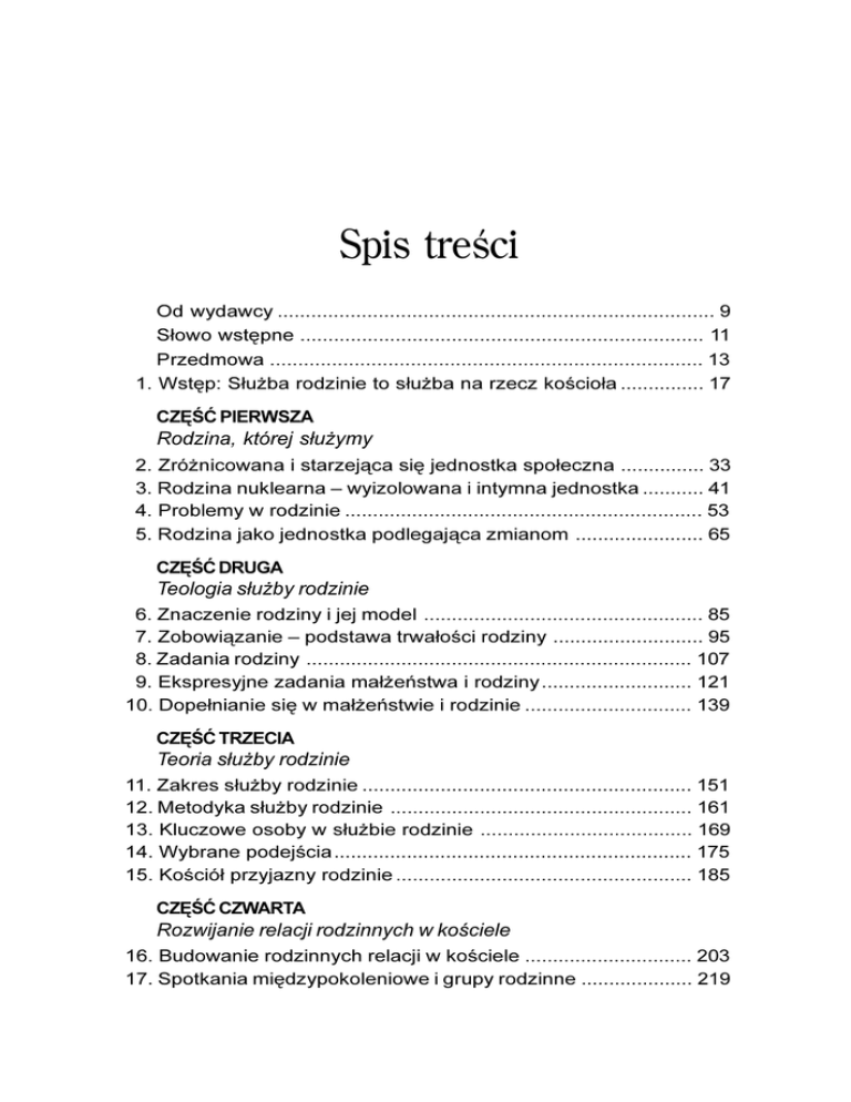 Spis treœci Od wydawcy .............................................................................. 9 S³owo wstêpne ........................................................................ 11 Przedmowa ............................................................................. 13 1. Wstêp: S³u¿ba rodzinie to s³u¿ba na rzecz koœcio³a ............... 17 CZÊŒÆ PIERWSZA Rodzina, której s³u¿ymy 2. Zró¿nicowana i starzej¹ca siê jednostka spo³eczna ............... 33 3. Rodzina nuklearna – wyizolowana i intymna jednostka ........... 41 4. Problemy w rodzinie ................................................................ 53 5. Rodzina jako jednostka podlegaj¹ca zmianom ....................... 65 CZÊŒÆ DRUGA Teologia s³u¿by rodzinie 6. Znaczenie rodziny i jej model .................................................. 85 7. Zobowi¹zanie – podstawa trwa³oœci rodziny ........................... 95 8. Zadania rodziny ..................................................................... 107 9. Ekspresyjne zadania ma³¿eñstwa i rodziny ........................... 121 10. Dope³nianie siê w ma³¿eñstwie i rodzinie .............................. 139 CZÊŒÆ TRZECIA Teoria s³u¿by rodzinie 11. Zakres s³u¿by rodzinie ........................................................... 151 12. Metodyka s³u¿by rodzinie ...................................................... 161 13. Kluczowe osoby w s³u¿bie rodzinie ...................................... 169 14. Wybrane podejœcia ................................................................ 175 15. Koœció³ przyjazny rodzinie ..................................................... 185 CZÊŒÆ CZWARTA Rozwijanie relacji rodzinnych w koœciele 16. Budowanie rodzinnych relacji w koœciele .............................. 203 17. Spotkania miêdzypokoleniowe i grupy rodzinne .................... 219 CZÊŒÆ PI¥TA Edukacja ma³¿eñska 18. Przygotowanie do ma³¿eñstwa ............................................. 245 19. Tematyka edukacji ma³¿eñskiej ............................................. 267 20. Programy edukacji ma³¿eñskiej ............................................. 285 CZÊŒÆ SZÓSTA Edukacja rodzicielska 21. Zasady edukacji rodzicielskiej ............................................... 303 22. Model edukacji rodzicielskiej .................................................. 319 23. Przygotowanie rodziców do pielêgnowania ¿ycia duchowego w rodzinie ................................................. 337 CZÊŒÆ SIÓDMA Szczególne formy s³u¿by rodzinie 24. Praca wœród rodzin dysfunkcyjnych ...................................... 351 25. Poradnictwo chrzeœcijañskie i grupy wsparcia ..................... 361 26. S³u¿ba wœród osób stanu wolnego i rodzin w okresie przejœciowym ....................................................... 375 CZÊŒÆ ÓSMA Administracja s³u¿by rodzinie 27. Przygotowanie konferencji poœwiêconej ¿yciu w rodzinie ..... 389 28. Organizowanie s³u¿by rodzinie ............................................. 405 Zakoñczenie .......................................................................... 425 Bibliografia w jêzyku angielskim ............................................ 429 Bibliografia dotycz¹ca problemów poradnictwa dostêpna w jêzyku polskim .................................................... 435 Indeks cytatów biblijnych ....................................................... 441 Indeks osób i hase³ rzeczowych ............................................ 445 Skróty ksi¹g biblijnych ............................................................ 449