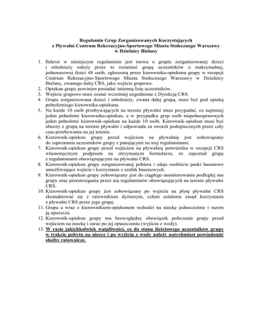 Regulamin Grup Zorganizowanych Korzystających z Pływalni Centrum Rekreacyjno-Sportowego Miasta Stołecznego Warszawy w Dzielnicy Bielany 1. Ilekroć w niniejszym regulaminie jest mowa o grupie zorganizowanej dzieci i młodzieży należy przez to rozumieć grupę uczestników o maksymalnej, jednorazowej ilości 48 osób, zgłoszoną przez kierownika-opiekuna grupy w recepcji Centrum Rekreacyjno-Sportowego Miasta Stołecznego Warszawy w Dzielnicy Bielany, zwanego dalej CRS, jako wejście grupowe. 2. Opiekun grupy powinien posiadać imienną listę uczestników. 3. Wejście grupowe musi zostać wcześniej uzgodnione z Dyrekcją CRS. 4. Grupa zorganizowana dzieci i młodzieży, zwana dalej grupą, musi być pod opieką pełnoletniego kierownika-opiekuna. 5. Na każde 10 osób przebywających na terenie pływalni musi przypadać, co najmniej jeden pełnoletni kierownika-opiekun, a w przypadku grup osób niepełnosprawnych jeden pełnoletni kierownik-opiekun na każde 10 osób. Kierownik-opiekun musi być obecny z grupą na terenie pływalni i odpowiada za swoich podopiecznych przez cały czas przebywania na jej terenie. 6. Kierownik-opiekun grupy przed wejściem na pływalnię jest zobowiązany do zapoznania uczestników grupy z panującymi na niej regulaminami. 7. Kierownik-opiekun grupy przed wejściem na pływalnię potwierdza w recepcji CRS własnoręcznym podpisem na otrzymanym formularzu, że zapoznał grupę z regulaminami obowiązującymi na pływalni CRS. 8. Kierownik-opiekun grupy zorganizowanej pobiera i zdaje osobiście paski basenowe umożliwiające wejście i korzystanie z szafek basenowych. 9. Kierownik-opiekun grupy zobowiązany jest do ciągłego monitorowania podległej mu grupy oraz przestrzegania przez nią regulaminów obowiązujących na terenie pływalni CRS. 10. Kierownik-opiekun grupy jest zobowiązany po wejściu na płytę pływalni CRS skontaktować się z ratownikiem dyżurnym, celem ustalenia zasad korzystania z pływalni CRS przez jego grupę. 11. Grupa a wraz z kierownikiem-opiekunem wchodzi na nieckę jednocześnie i razem ją opuszcza. 12. Kierownik-opiekun grupy ma bezwzględny obowiązek policzenia grupy przed wejściem na nieckę i zaraz po jej opuszczeniu (wyjściu z wody). 13. W razie jakichkolwiek wątpliwości, co do stanu ilościowego uczestników grupy w trakcie pobytu na niecce i po wyjściu z wody należy natychmiast powiadomić służby ratownicze.
