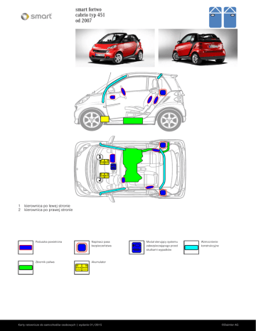 smart fortwo cabrio typ 451 od 2007 1 2 1 kierownica po lewej stronie 2 kierownica po prawej stronie Poduszka powietrzna Napinacz pasa bezpieczeństwa Zbiornik paliwa Akumulator Karty ratownicze do samochodów osobowych | wydanie 01/2015 Moduł sterujący systemu zabezpieczającego przed skutkami wypadków Wzmocnienie konstrukcyjne ©Daimler AG