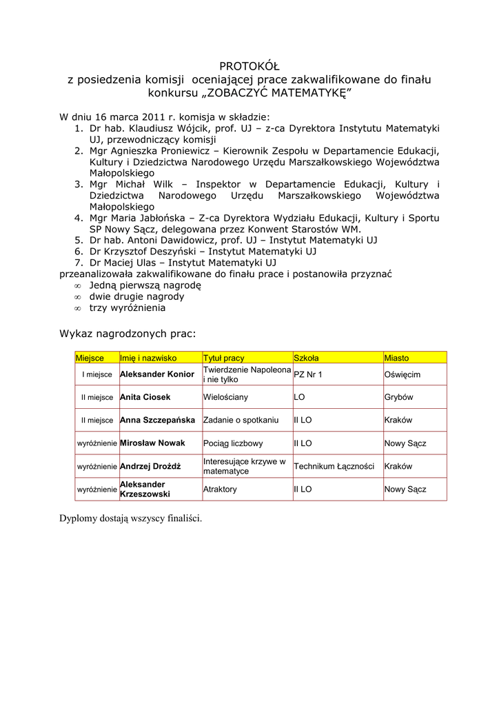 PROTOKÓŁ z posiedzenia komisji oceniającej prace zakwalifikowane do finału konkursu „ZOBACZYĆ MATEMATYKĘ” W dniu 16 marca 2011 r. komisja w składzie: 1. Dr hab. Klaudiusz Wójcik, prof. UJ – z-ca Dyrektora Instytutu Matematyki UJ, przewodniczący komisji 2. Mgr Agnieszka Proniewicz – Kierownik Zespołu w Departamencie Edukacji, Kultury i Dziedzictwa Narodowego Urzędu Marszałkowskiego Województwa Małopolskiego 3. Mgr Michał Wilk – Inspektor w Departamencie Edukacji, Kultury i Dziedzictwa Narodowego Urzędu Marszałkowskiego Województwa Małopolskiego 4. Mgr Maria Jabłońska – Z-ca Dyrektora Wydziału Edukacji, Kultury i Sportu SP Nowy Sącz, delegowana przez Konwent Starostów WM. 5. Dr hab. Antoni Dawidowicz, prof. UJ – Instytut Matematyki UJ 6. Dr Krzysztof Deszyński – Instytut Matematyki UJ 7. Dr Maciej Ulas – Instytut Matematyki UJ przeanalizowała zakwalifikowane do finału prace i postanowiła przyznać • Jedną pierwszą nagrodę • dwie drugie nagrody • trzy wyróŜnienia Wykaz nagrodzonych prac: Miejsce I miejsce Imię i nazwisko Aleksander Konior Tytuł pracy Szkoła Twierdzenie Napoleona PZ Nr 1 i nie tylko Miasto Oświęcim II miejsce Anita Ciosek Wielościany LO Grybów II miejsce Anna Szczepańska Zadanie o spotkaniu II LO Kraków wyróŜnienie Mirosław Nowak Pociąg liczbowy II LO Nowy Sącz wyróŜnienie Andrzej DroŜdŜ Interesujące krzywe w Technikum Łączności matematyce Kraków Atraktory Nowy Sącz wyróŜnienie Aleksander Krzeszowski Dyplomy dostają wszyscy finaliści. II LO