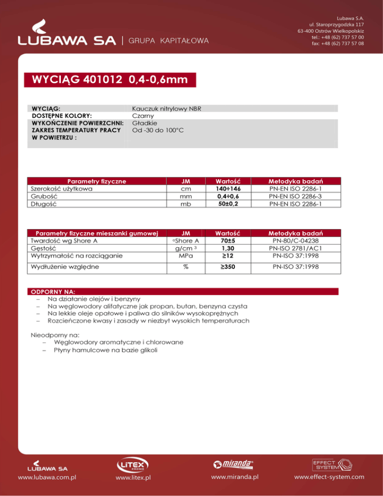 WYCIĄG 401012 0,4-0,6mm WYCIĄG: DOSTĘPNE KOLORY: WYKOŃCZENIE POWIERZCHNI: ZAKRES TEMPERATURY PRACY W POWIETRZU : Kauczuk nitrylowy NBR Czarny Gładkie Od -30 do 100°C Parametry fizyczne Szerokość użytkowa Grubość Długość Parametry fizyczne mieszanki gumowej Twardość wg Shore A Gęstość Wytrzymałość na rozciąganie Wydłużenie względne JM cm mm mb Wartość 140÷146 0,4÷0,6 50±0,2 Metodyka badań PN-EN ISO 2286-1 PN-EN ISO 2286-3 PN-EN ISO 2286-1 JM A g/cm 3 MPa Wartość 70±5 1,30 ≥12 Metodyka badań PN-80/C-04238 PN-ISO 2781/AC1 PN-ISO 37:1998 % ≥350 PN-ISO 37:1998 oShore ODPORNY NA: − Na działanie olejów i benzyny − Na węglowodory alifatyczne jak propan, butan, benzyna czysta − Na lekkie oleje opałowe i paliwa do silników wysokoprężnych − Rozcieńczone kwasy i zasady w niezbyt wysokich temperaturach Nieodporny na: − Węglowodory aromatyczne i chlorowane − Płyny hamulcowe na bazie glikoli