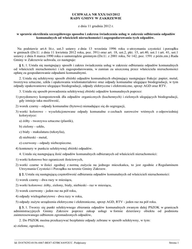 UCHWAŁA NR XXX/163/2012 RADY GMINY W ZAKRZEWIE z dnia 11 grudnia 2012 r. w sprawie określenia szczegółowego sposobu i zakresu świadczenia usług w zakresie odbierania odpadów komunalnych od właścicieli nieruchomości i zagospodarowania tych odpadów. Na podstawie art.6 lit.r, ust.3 ustawy z dnia 13 września 1996 roku o utrzymaniu czystości i porządku w gminach (Dz.U. z dnia 11 kwietnia 2012 roku, poz. 391) oraz art. 18, ust.2, pkt. 15, art.40, ust.1 i art. 41, ust.1 ustawy z dnia 8 marca 1990 roku o samorządzie gminnym (Dz.U. z 2001 roku, Nr 142, poz. 1591 z późn.zm.) Rada Gminy w Zakrzewie uchwala, co następuje: § 1. 1. Ustala się następujący sposób i zakres świadczenia usług w zakresie odbierania odpadów komunalnych od właścicieli nieruchomości i ich zagospodarowania, w zamian za uiszczoną przez właściciela nieruchomości opłatę za gospodarowanie odpadami komunalnymi. 2. Ustala się selektywny sposób zbiórki odpadów komunalnych obejmujący następujące frakcje: papier, metal, tworzywa sztuczne, szkła i opakowania wielomateriałowe oraz odpady komunalne ulegające biodegradacji, w tym odpady opakowaniowe ulegające biodegradacji, odpady elektryczne i elektroniczne, sprzęt AGD oraz RTV. 3. Ustala się sposób prowadzenia selektywnej zbiórki odpadów komunalnych poprzez: 1) przydomowy kompostownik dla odpadów organicznych (kuchennych) i zielonych ulegających biodegradacji, gdy istnieje taka możliwość, 2) worek czarny - odpady komunalne (bytowe) nienadające się do segregacji, 3) worki kolorowe - wyselekcjonowane odpady komunalne o cechach surowców wtórnych o odpowiedniej kolorystyce: a) żółty - tworzywa sztuczne (plastik), b) zielony - szkło, c) biały - makulatura (tekstylia), d) niebieski - metal, e) czerwony - odpady niebezpieczne. 4) kontenery w punkcie selektywnej zbiórki odpadów. 4. Ustala się następującą ilość odpadów komunalnych odbieranych od właścicieli nieruchomości: 1) worki kolorowe bez ograniczeń ilościowych, 2) worki czarne w ilości zgodnej z normą zużycia na jednego mieszkańca, to jest zgodnie z Regulaminem Utrzymania Czystości i Porządku na terenie Gminy Zakrzew. § 2. Ustala się następującą częstotliwość odbierania odpadów komunalnych od właścicieli nieruchomości: 1) worek czarny - dwa razy w miesiącu, 2) worki kolorowe: żółty, zielony, biały, niebieski - raz w miesiącu, 3) worek czerwony - jeden raz na pół roku, 4) odpady wielogabarytowe - dwa razy w roku, 5) odpady zużyte urządzenia elektryczne i elektroniczne, sprzęt AGD, RTV - jeden raz na pół roku. § 3. 1. Tworzy się punkt selektywnego zbierania odpadów komunalnych zwanym dalej PSZOK w granicach administracyjnych Gminy Zakrzew poprzez zakup usługi w formie dzierżawy obiektu od podmiotu zainteresowanego odbiorem zgromadzonych odpadów, 2. Do PSZOK można przekazywać bezpłatnie odpady zebrane w sposób selektywny, w tym: a) zielone, ogrodowe, ————————————————————————————————————————————————————————— Id: D1878292-0156-4467-BE87-425BC4A952CC. Podpisany Strona 1 b) papier, tektura, c) tworzywa sztuczne, d) metale, e) szkło, f) zużyty sprzęt elektryczny i elektroniczny, g) wielogabarytowe, h) zużyte baterie i akumulatory, i) zużyte opony, j) przeterminowane lekarstwa, k) żużel z domowych pieców węglowych i centralnego ogrzewania, l) inne odpady niebezpieczne wydzielone ze strumienia odpadów komunalnych. § 4. U stala się uzyskanie do 31 grudnia 2020 roku: 1) poziomu recyklingu i przygotowania do ponownego użycia następujących frakcji odpadów komunalnych: papieru, metali, tworzyw sztucznych i szkła w wysokości co najmniej 50% wagowo, 2) poziomu recyklingu, przygotowania do ponownego użycia i odzysku innymi metodami innych niż niebezpieczne, odpadów budowlanych i rozbiórkowych w wysokości, co najmniej 70% wagowo. § 5. Wykonanie uchwały powierza się Wójtowi Gminy Zakrzew. § 6. 1. Uchwała podlega ogłoszeniu w Dzienniku Urzędowym Województwa Mazowieckiego. 2. Uchwała wchodzi w życie po upływie 14 dni od dnia jej ogłoszenia, z mocą obowiązującą od dnia 1 stycznia 2013 roku. Przewodniczący Rady Gminy Roman Stępień ————————————————————————————————————————————————————————— Id: D1878292-0156-4467-BE87-425BC4A952CC. Podpisany Strona 2