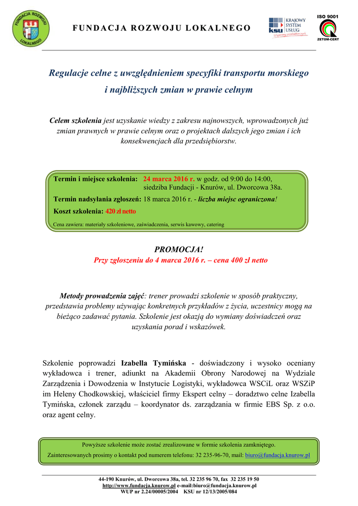 ISO 9001 FUNDACJA ROZWOJU LOKALNEGO ZETOM-CERT Regulacje celne z uwzględnieniem specyfiki transportu morskiego i najbliższych zmian w prawie celnym Celem szkolenia jest uzyskanie wiedzy z zakresu najnowszych, wprowadzonych już zmian prawnych w prawie celnym oraz o projektach dalszych jego zmian i ich konsekwencjach dla przedsiębiorstw. Termin i miejsce szkolenia: 24 marca 2016 r. w godz. od 9:00 do 14:00, siedziba Fundacji - Knurów, ul. Dworcowa 38a. Termin nadsyłania zgłoszeń: 18 marca 2016 r. - liczba miejsc ograniczona! Koszt szkolenia: 420 zł netto Cena zawiera: materiały szkoleniowe, zaświadczenia, serwis kawowy, catering PROMOCJA! Przy zgłoszeniu do 4 marca 2016 r. – cena 400 zł netto Metody prowadzenia zajęć: trener prowadzi szkolenie w sposób praktyczny, przedstawia problemy używając konkretnych przykładów z życia, uczestnicy mogą na bieżąco zadawać pytania. Szkolenie jest okazją do wymiany doświadczeń oraz uzyskania porad i wskazówek. Szkolenie poprowadzi Izabella Tymińska - doświadczony i wysoko oceniany wykładowca i trener, adiunkt na Akademii Obrony Narodowej na Wydziale Zarządzenia i Dowodzenia w Instytucie Logistyki, wykładowca WSCiL oraz WSZiP im Heleny Chodkowskiej, właściciel firmy Ekspert celny – doradztwo celne Izabella Tymińska, członek zarządu – koordynator ds. zarządzania w firmie EBS Sp. z o.o. oraz agent celny. Powyższe szkolenie może zostać zrealizowane w formie szkolenia zamkniętego. Zainteresowanych prosimy o kontakt pod numerem telefonu: 32 235-96-70, mail: [email protected] 44-190 Knurów, ul. Dworcowa 38a, tel. 32 235 96 70, fax 32 235 19 50 http://www.fundacja.knurow.pl e-mail:[email protected] WUP nr 2.24/00005/2004 KSU nr 12/13/2005/084 ISO 9001 FUNDACJA ROZWOJU LOKALNEGO ZETOM-CERT Program szkolenia: 1. Podstawy funkcjonowania prawa celnego w Unii Europejskiej: Źródła polityki celnej i prawa celnego, Unia celna, Organy celne i ich kompetencje. 2. Podstawy stosowania prawa celnego: Podstawy prawne wywozu oraz przywozu towarów z oraz do Unii Europejskiej, Procedury celne, Procedury specjalne (procedury gospodarcze). 3. Elektroniczne zgłoszenia celne w imporcie i eksporcie towarów z i do UE: CELINA (AIS), ECS. 4. Dokumenty w wymianie towarowej za granicą: SAD, faktura, list przewozowy, pozostałe. 5. Zgłoszenia celne w EU: formy zgłoszeń celnych, właściwość rzeczowa i miejscowa organów celnych. 6. Podatki w przywozie i wywozie towarów na/z UE: VAT, akcyza. 7. Elementy kalkulacyjne odpraw celnych w UE: pochodzenie towarów, wartość celna, taryfa celna. 8. Postępowanie celne w EU: przedstawicielstwo w sprawach celnych, kontrola towarów, postępowanie administracyjne. 44-190 Knurów, ul. Dworcowa 38a, tel. 32 235 96 70, fax 32 235 19 50 http://www.fundacja.knurow.pl e-mail:[email protected] WUP nr 2.24/00005/2004 KSU nr 12/13/2005/084 ISO 9001 FUNDACJA ROZWOJU LOKALNEGO ZETOM-CERT FORMULARZ ZGŁOSZENIOWY Niniejszym zgłaszam udział w szkoleniu z zakresu: Regulacje celne poza wspólnotowe z uwzględnieniem specyfiki transportu morskiego i najbliższych zmian w prawie celnym. Imię i Nazwisko: Stanowisko: Nazwa instytucji: Adres Tel/fax: Adres e-mail: - 400,00 zł/os (promocja do 4 marca 2016 r.) + 23% VAT - 400,00 zł/os (promocja do 4 marca 2016 r.) zwolnienie z VAT dla opłacających szkolenie ze środków publicznych - 420,00 zł/os + 23% VAT - 420,00 zł/os zwolnienie z VAT dla opłacających szkolenie ze środków publicznych Podpis: Zgłoszenia można przesyłać faxem pod nr 32 235-19-50 lub na adres e-mail: [email protected] 44-190 Knurów, ul. Dworcowa 38a, tel. 32 235 96 70, fax 32 235 19 50 http://www.fundacja.knurow.pl e-mail:[email protected] WUP nr 2.24/00005/2004 KSU nr 12/13/2005/084 ISO 9001 FUNDACJA ROZWOJU LOKALNEGO ZETOM-CERT OŚWIADCZENIE Oświadczenie ma na celu możliwość zastosowania zwolnienia z podatku VAT zgodnie z art. 43 ust. 1 pkt 29 lit. c ustawy o podatku od towarów i usług z dnia 11 marca 2004 r. z późniejszymi zmianami. …………………………………………………………………………………………………………………………………………………….. (nazwa instytucji) Oświadczamy, że usługa szkoleniowa nabyta od Fundacji Rozwoju Lokalnego Tytuł szkolenia: Regulacje celne poza wspólnotowe z uwzględnieniem specyfiki transportu morskiego i najbliższych zmian w prawie celnym. Termin i miejsce realizacji: ................................................................................................................................ Imię i nazwisko uczestnika: ................................................................................................................................. ma charakter kształcenia zawodowego lub służy przekwalifikowaniu zawodowemu pracowników oraz jest finansowana przynajmniej w 70% ze środków publicznych. ……………………………………………….. ……………………………………………….. Pieczątka Data i podpis Prosimy o przesłanie podpisanego oświadczenia faxem pod nr 32 235-19-50 lub na adres e-mail: [email protected] Oryginał należy dostarczyć w dniu szkolenia 44-190 Knurów, ul. Dworcowa 38a, tel. 32 235 96 70, fax 32 235 19 50 http://www.fundacja.knurow.pl e-mail:[email protected] WUP nr 2.24/00005/2004 KSU nr 12/13/2005/084