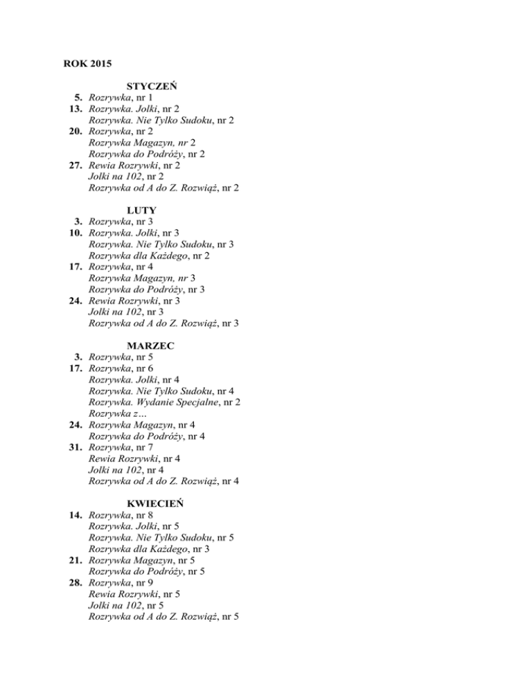 ROK 2015 STYCZEŃ 5. Rozrywka, nr 1 13. Rozrywka. Jolki, nr 2 Rozrywka. Nie Tylko Sudoku, nr 2 20. Rozrywka, nr 2 Rozrywka Magazyn, nr 2 Rozrywka do Podróży, nr 2 27. Rewia Rozrywki, nr 2 Jolki na 102, nr 2 Rozrywka od A do Z. Rozwiąż, nr 2 LUTY 3. Rozrywka, nr 3 10. Rozrywka. Jolki, nr 3 Rozrywka. Nie Tylko Sudoku, nr 3 Rozrywka dla Każdego, nr 2 17. Rozrywka, nr 4 Rozrywka Magazyn, nr 3 Rozrywka do Podróży, nr 3 24. Rewia Rozrywki, nr 3 Jolki na 102, nr 3 Rozrywka od A do Z. Rozwiąż, nr 3 3. 17. 24. 31. MARZEC Rozrywka, nr 5 Rozrywka, nr 6 Rozrywka. Jolki, nr 4 Rozrywka. Nie Tylko Sudoku, nr 4 Rozrywka. Wydanie Specjalne, nr 2 Rozrywka z… Rozrywka Magazyn, nr 4 Rozrywka do Podróży, nr 4 Rozrywka, nr 7 Rewia Rozrywki, nr 4 Jolki na 102, nr 4 Rozrywka od A do Z. Rozwiąż, nr 4 KWIECIEŃ 14. Rozrywka, nr 8 Rozrywka. Jolki, nr 5 Rozrywka. Nie Tylko Sudoku, nr 5 Rozrywka dla Każdego, nr 3 21. Rozrywka Magazyn, nr 5 Rozrywka do Podróży, nr 5 28. Rozrywka, nr 9 Rewia Rozrywki, nr 5 Jolki na 102, nr 5 Rozrywka od A do Z. Rozwiąż, nr 5 MAJ 12. Rozrywka, nr 10 Rozrywka. Jolki, nr 6 Rozrywka. Nie Tylko Sudoku, nr 6 19. Rozrywka Magazyn, nr 6 Rozrywka do Podróży, nr 6 26. Rozrywka, nr 11 Rewia Rozrywki, nr 6 Jolki na 102, nr 6 Rozrywka od A do Z. Rozwiąż, nr 6 2. 9. 16. 23. 30. CZERWIEC Rozrywka. Wydanie Specjalne, nr 3 Rozrywka, nr 12 Rozrywka. Jolki, nr 7 Rozrywka. Nie Tylko Sudoku, nr 7 Rozrywka dla Każdego, nr 4 Rozrywka, nr 13 Rozrywka Magazyn, nr 7 Rozrywka do Podróży, nr 7 Rewia Rozrywki, nr 7 Jolki na 102, nr 7 Rozrywka od A do Z. Rozwiąż, nr 7 Krzyżówki na Lato LIPIEC 7. Rozrywka, nr 14 14. Rozrywka. Jolki, nr 8 Rozrywka. Nie Tylko Sudoku, nr 8 21. Rozrywka, nr 15 Rozrywka Magazyn, nr 8 Rozrywka do Podróży, nr 8 28. Rewia Rozrywki, nr 8 Jolki na 102, nr 8 Rozrywka od A do Z. Rozwiąż, nr 8 SIERPIEŃ 4. Rozrywka, nr 16 11. Rozrywka. Jolki, nr 9 Rozrywka. Nie Tylko Sudoku, nr 9 Rozrywka dla Każdego, nr 5 Rozrywka. Wydanie Specjalne, nr 4 18. Rozrywka, nr 17 Rozrywka Magazyn, nr 9 Rozrywka do Podróży, nr 9 25. Rewia Rozrywki, nr 9 Jolki na 102, nr 9 Rozrywka od A do Z. Rozwiąż, nr 9 WRZESIEŃ 1. Rozrywka, nr 18 15. Rozrywka, nr 19 Rozrywka. Jolki, nr 10 Rozrywka. Nie Tylko Sudoku, nr 10 22. Rozrywka Magazyn, nr 10 Rozrywka do Podróży, nr 10 29. Rozrywka, nr 20 Rewia Rozrywki, nr 10 Jolki na 102, nr 10 Rozrywka od A do Z. Rozwiąż, nr 10 PAŹDZIERNIK 13. Rozrywka, nr 21 Rozrywka. Jolki, nr 11 Rozrywka. Nie Tylko Sudoku, nr 11 Rozrywka dla Każdego, nr 6 Jolki na Cały Rok 20. Rozrywka Magazyn, nr 11 Rozrywka do Podróży, nr 11 27. Rozrywka, nr 22 Rewia Rozrywki, nr 11 Jolki na 102, nr 11 Rozrywka od A do Z. Rozwiąż, nr 11 LISTOPAD 10. Rozrywka, nr 23 Rozrywka. Jolki, nr 12 Rozrywka. Nie Tylko Sudoku, nr 12 17. Rozrywka Magazyn, nr 12 Rozrywka do Podróży, nr 12 24. Rozrywka, nr 24 Rewia Rozrywki, nr 12 Jolki na 102, nr 12 Rozrywka od A do Z. Rozwiąż, nr 12 GRUDZIEŃ 8. Rozrywka, nr 25 Rozrywka. Jolki, nr 1/2016 Rozrywka. Nie Tylko Sudoku, nr 1/2016 Rozrywka dla Każdego, nr 1/2016 Rozrywka. Wydanie Specjalne, nr 1/2016 15. Rewia Rozrywki, nr 1/2016 Rozrywka Magazyn, nr 1/2016 Rozrywka do Podróży, nr 1/2016 Jolki na 102, nr 1/2016 Rozrywka od A do Z. Rozwiąż, nr 1/2016 22. Rozrywka, nr 26