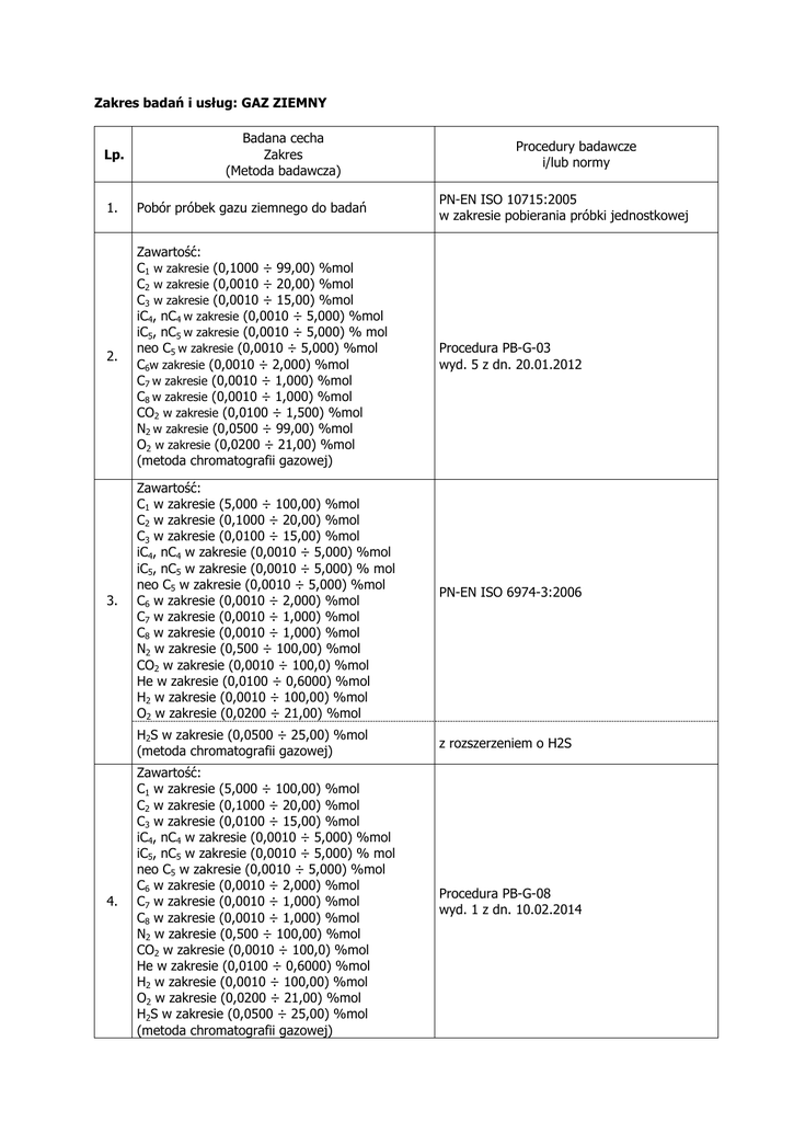 Zakres badań i usług: GAZ ZIEMNY Lp. Badana cecha Zakres