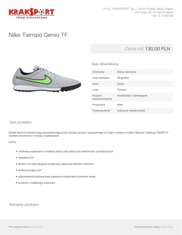 P.H.U. KRAKSPORT Sp.J. Zenon Piętak, Alicja Piętak Al.Pokoju 32, 31-564 Kraków +48 12 4140108 Nike Tiempo Genio TF Cena od: 130,00 PLN Opis słownikowy Cholewka Skóra naturalna Czas dostawy 48 godzin Kolor Szary Linia Tiempo Poziom zaawansowania Amatorskie / rekreacyjne Producent Nike Przeznaczenie Sztuczne nawierzchnie Opis produktu Model Genio to kontynuacją sprawdzonego przez tysiące graczy i popularnego na całym świecie modelu Natural. Kolekcja TIEMPO 5 została stwotrzona z myślą o najlepszych. Cechy: cholewka wykonana z miękkiej skóry naturalnej oraz elementów syntetycznych wkładka EVA phylon na całej długości podeszwy zapewnia lekkość i komfort podeszwa typu turf odpowiednia budowa buta zapewnia doskonałe trzymanie stopy wnętrze z miękkiego materiału Warianty produktu Plik wygenerowano: 08-03-2017 Oprogramowanie sklepu: AptusShop P.H.U. KRAKSPORT Sp.J. Zenon Piętak, Alicja Piętak Al.Pokoju 32, 31-564 Kraków +48 12 4140108 42 130,00 PLN Galeria Plik wygenerowano: 08-03-2017 Powered by TCPDF (www.tcpdf.org) Oprogramowanie sklepu: AptusShop