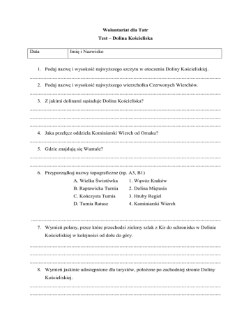 Wolontariat dla Tatr Test – Dolina Kościeliska Data Imię i Nazwisko 1. Podaj nazwę i wysokość najwyższego szczytu w otoczeniu Doliny Kościeliskiej. ....................................................................................................................................................... 2. Podaj nazwę i wysokość najwyższego wierzchołka Czerwonych Wierchów. ....................................................................................................................................................... 3. Z jakimi dolinami sąsiaduje Dolina Kościeliska? ....................................................................................................................................................... ....................................................................................................................................................... ....................................................................................................................................................... 4. Jaka przełęcz oddziela Kominiarski Wierch od Ornaku? ....................................................................................................................................................... 5. Gdzie znajdują się Wantule? ....................................................................................................................................................... ....................................................................................................................................................... 6. Przyporządkuj nazwy topograficzne (np. A3, B1) A. Wielka Świstówka 1. Wąwóz Kraków B. Raptawicka Turnia 2. Dolina Miętusia C. Kończysta Turnia 3. Hruby Regiel D. Turnia Ratusz 4. Kominiarski Wierch ...................................................................................................................................................... 7. Wymień polany, przez które przechodzi zielony szlak z Kir do schroniska w Dolinie Kościeliskiej w kolejności od dołu do góry. ....................................................................................................................................................... ....................................................................................................................................................... ....................................................................................................................................................... 8. Wymień jaskinie udostępnione dla turystów, położone po zachodniej stronie Doliny Kościeliskiej. ....................................................................................................................................................... ....................................................................................................................................................... 9. Jakiego koloru szlak prowadzi przez Dolinę Tomanową na Chudą Przełączkę? ....................................................................................................................................................... 10. Jakiego koloru szlak prowadzi z Doliny Kościeliskiej na Przysłop Miętusi? ....................................................................................................................................................... 11. Który szlak w Dolinie Kościeliskiej jest zamykany w okresie zimowym? ....................................................................................................................................................... 12. Wymień 3 polany w Dolinie Kościeliskiej, na których prowadzi się kulturowy wypas owiec i krów. ................................................................................................................................................. ................................................................................................................................................. 13. Gdzie w Dolinie Kościeliskiej znajdują się zabytkowe szałasy pasterskie? ....................................................................................................................................................... 14. Na jakiej polanie znajduje się kapliczka hawiarska (zbójnicka)? ....................................................................................................................................................... 15. Wymień 3 elementy rzeźby polodowcowej, które możemy spotkać w Dolinie Kościeliskiej. ....................................................................................................................................................... ....................................................................................................................................................... ....................................................................................................................................................... 16. Wymień jaskinie wchodzące w skład systemu wywierzyskowego Lodowego Źródła. ....................................................................................................................................................... ....................................................................................................................................................... 17. W którym miesiącu notuje się największe opady atmosferyczne w Tatrach? ....................................................................................................................................................... 18. Na czym polega zjawisko inwersji termicznej w górach? ....................................................................................................................................................... .......................................................................................................................
