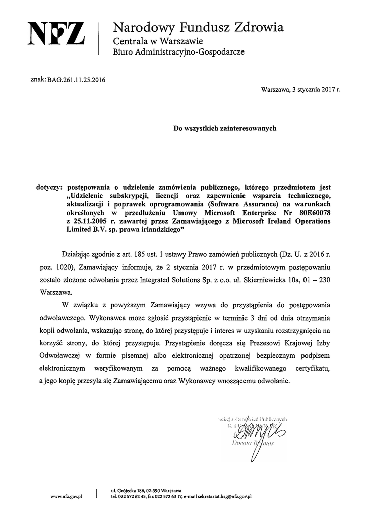 Narodowy Fundusz Zdrowia Centrala w Warszawie Biuro Administracyjno-Gospodarcze znak: BAG.261.11.25.2016 Warszawa, 3 stycznia 2017 Do wszystkich zainteresowanych dotyczy: postępowania o udzielenie zamówienia publicznego, którego przedmiotem jest „Udzielenie subskrypcji, licencji oraz zapewnienie wsparcia technicznego, aktualizacji i poprawek oprogramowania (Software Assurance) na warunkach określonych w przedłużeniu Umowy Microsoft Enterprise Nr 80E60078 z 25.11.2005 r. zawartej przez Zamawiającego z Microsoft Ireland Operations Limited B.V. sp. prawa irlandzkiego” Działając zgodnie z art. 185 ust. 1 ustawy Prawo zamówień publicznych (Dz. U. z 2016 r. poz. 1020), Zamawiający informuje, że 2 stycznia 2017 r. w przedmiotowym postępowaniu zostało złożone odwołania przez Integrated Solutions Sp. z o.o. ul. Skierniewicka 10a, 01 - 230 Warszawa. W związku z powyższym Zamawiający wzywa do przystąpienia do postępowania odwoławczego. Wykonawca może zgłosić przystąpienie w terminie 3 dni od dnia otrzymania kopii odwołania, wskazując stronę, do której przystępuje i interes w uzyskaniu rozstrzygnięcia na korzyść strony, do której przystępuje. Przystąpienie doręcza się Prezesowi Krajowej Izby Odwoławczej w formie pisemnej albo elektronicznej opatrzonej bezpiecznym podpisem elektronicznym weryfikowanym za pomocą ważnego kwalifikowanego a jego kopię przesyła się Zamawiającemu oraz Wykonawcy wnoszącemu odwołanie. ul. G rójecka 186,02-390 W arszaw a www. n fz.go v. pl teł. 022 572 62 45, fax 022 572 63 17, e-mail [email protected] certyfikatu, Warszawa, 02 stycznia 2017 r. Prezes Krajowej Izby Odwoławczej ul. Postępu 17a 02*676 Warszawa Zamawiający: Narodowy Fundusz Zdrowia w Warszawie ul. Grójecka 186 02-390 Warszawa fax; 22 572 63 05 www.nfz.gov.pl e-mail: [email protected] Odwołujący: Integrated Solutions Sp.z o.o. ul. Skierniewicka 10a 01-230 Warszawa fax : 22 556 32 39 e-mail: [email protected] Adres do korespondencji: ul. Skierniewicka 10A, 01-230 Warszawa Nr pisma: WWIP/AR/08 /i/2017 Numer ogłoszenia TED: 2016/S 248-456178 ODWOŁANIE W postępowaniu o udzielenie zamówienia publicznego prowadzonym w trybie przetargu nieograniczonego przez Narodowy Fundusz Zdrowia - Centrala na „Udzielenie subskrypcji, licencji oraz zapewnienie wsparcia technicznego, aktualizacji i poprawek oprogramowania (Software Assurance) na warunkach określonych w przedłużeniu Umowy Microsoft Enterprise nr 80E60078 z 25.11.2005 r. zawartej przez Zamawiającego z Microsoft Ireland Operations Umited B.V. sp. prawa irlandzkiego". Znak sprawy BAG.261.1.25.2016. Wpis od odwołania w wysokości 15.000 zł został wpłacony na rachunek Urzędu zamówień publicznych nr 60 1010 1010 0081 3622 3100 0000 dn. 2 stycznia 2017 r. Na podstawie art. 180 ust, 1 ustawy z dn. 29 stycznia 2004 r. Prawo zamówień publicznych (Dz. U. 2015 poz. 2164 ze zm.)f zwanej dalej „ustawą", lub „Pzp", wnoszę odwołanie ( ha treść ogłoszenia o i rtas Senior Ka Integrand Soli um Manager ns Sp. z o.o. zamówienia oraz siwz w postępowaniu prowadzonym przez Narodowy Fundusz Zdrowia - Centrala na „Udzielenie subskrypcji, licencji oraz zapewnienie wsparcia technicznego, aktualizacji i poprawek oprogramowania {Software Assurance} na warunkach określonych w przedłużeniu Umowy Microsoft Enterprise nr 80E60078 z 25.11.2005 r, zawartej przez Zamawiającego z Microsoft Ireland Operations Limited B.V. sp. prawa irlandzkiego". Odwołujący jako wykonawca posiada interes w uzyskaniu zamówienia. Określenie warunków udziału w postępowaniu w zakresie zdolności technicznej i zawodowej obejmującej doświadczenie wykonawcy w sposób nieproporcjonalny i uniemożliwiający ocenę zdolności wykonawcy do realizacji zamówienia, uniemożliwia Odwołującemu złożenie oferty i tym samym uzyskanie przedmiotowego zamówienia. Uwzględnienie odwołania spowoduje, że warunki udziału w postępowaniu w zakresie zdolności technicznej i zawodowej obejmującej doświadczenie wykonawcy będą zgodne z ustawą, a Odwołujący będzie mógł złożyć ofertę w przedmiotowym postępowaniu. Mając na względzie powyższe należy stwierdzić, że Odwołujący jest podmiotem uprawnionym do skorzystania ze środków ochrony prawnej w rozumieniu art. 179 ust. 1 Pzp. Zamawiającemu zarzucam naruszenie następujących przepisów ustawy; 1. Art. 7 ust. 1 w zw. z art. 22 ust. 1 a Pzp - poprzez określenie warunków udziału w postępowaniu w zakresie zdolności technicznej i zawodowej obejmującej doświadczenie wykonawcy w sposób nieproporcjonalny i nie umożliwiający oceny zdolności wykonawcy do należytego wykonania zamówienia, z uwagi na wymaganie doświadczenia w realizacji świadczeń, które nie są adekwatne do przedmiotu zamówienia i realizować je może jedynie podmiot trzeci - producent oprogramowania (usługa subskrypcji na oprogramowanie}, a nie wykonawca - Sekcja III.2.3) ogłoszenia i Roz. V ust. 1 pkt 2) lit. c) siwz. Wnoszę o nakazanie Zamawiającemu zmiany treści ogłoszenia oraz siwz poprzez; 1, Zmianę opisu warunku udziału w postępowaniu w zakresie zdolności technicznej i zawodowej obejmującej doświadczenie wykonawcy - Sekcja IIi.2.3) ogłoszenia i Roz. V ust. 1 pkt 2) lit. c) siwz - w ten sposób, że zamiast usług subskrypcji (udzielenia licencji), warunek będzie obejmował dostawę subskrypcji (dostawę licencji udzielanych przez producenta oprogramowania). Ogłoszenie o zamówieniu zostało opublikowane dn. 23 grudnia 2016 r., w obec czego termin na wniesienie odwołania, o którym mowa w art. 182 ust. 2 pkt 1} ustawy należy uznać za zachowany. A 2 Manager Sp. z o.o. Kopia odwołania została przesłana Zamawiającemu dn. 2 stycznia 2 0 17 r, zgodnie z art. 180 ust. 5 Pzp. UZASADNIENIE Zamawiający prowadzi postępowanie w trybie przetargu nieograniczonego na „Udzielenie subskrypcji, licencji oraz zapewnienie wsparcia technicznego, aktualizacji i poprawek oprogramowania