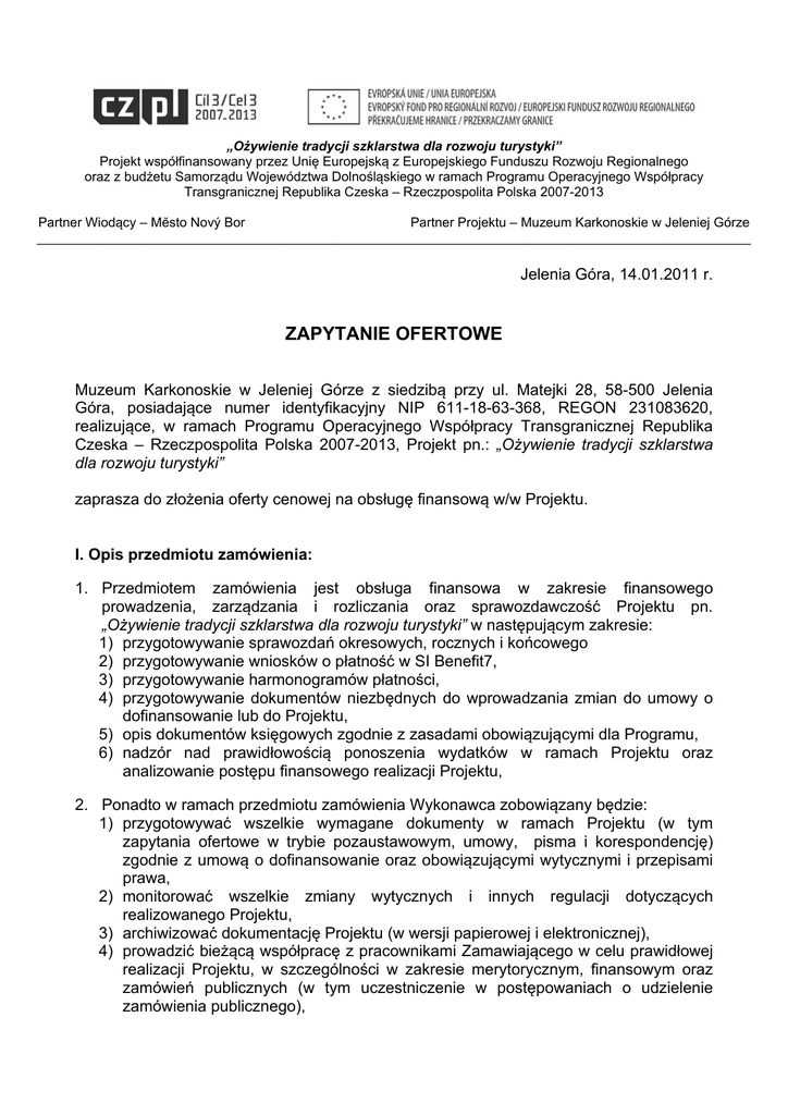 „Ożywienie tradycji szklarstwa dla rozwoju turystyki” Projekt współfinansowany przez Unię Europejską z Europejskiego Funduszu Rozwoju Regionalnego oraz z budżetu Samorządu Województwa Dolnośląskiego w ramach Programu Operacyjnego Współpracy Transgranicznej Republika Czeska – Rzeczpospolita Polska 2007-2013 Partner Wiodący – Mĕsto Nový Bor Partner Projektu – Muzeum Karkonoskie w Jeleniej Górze _________________________________________________________________________________________________ Jelenia Góra, 14.01.2011 r. ZAPYTANIE OFERTOWE Muzeum Karkonoskie w Jeleniej Górze z siedzibą przy ul. Matejki 28, 58-500 Jelenia Góra, posiadające numer identyfikacyjny NIP 611-18-63-368, REGON 231083620, realizujące, w ramach Programu Operacyjnego Współpracy Transgranicznej Republika Czeska – Rzeczpospolita Polska 2007-2013, Projekt pn.: „Ożywienie tradycji szklarstwa dla rozwoju turystyki” zaprasza do złożenia oferty cenowej na obsługę finansową w/w Projektu. I. Opis przedmiotu zamówienia: 1. Przedmiotem zamówienia jest obsługa finansowa w zakresie finansowego prowadzenia, zarządzania i rozliczania oraz sprawozdawczość Projektu pn. „Ożywienie tradycji szklarstwa dla rozwoju turystyki” w następującym zakresie: 1) przygotowywanie sprawozdań okresowych, rocznych i końcowego 2) przygotowywanie wniosków o płatność w SI Benefit7, 3) przygotowywanie harmonogramów płatności, 4) przygotowywanie dokumentów niezbędnych do wprowadzania zmian do umowy o dofinansowanie lub do Projektu, 5) opis dokumentów księgowych zgodnie z zasadami obowiązującymi dla Programu, 6) nadzór nad prawidłowością ponoszenia wydatków w ramach Projektu oraz analizowanie postępu finansowego realizacji Projektu, 2. Ponadto w ramach przedmiotu zamówienia Wykonawca zobowiązany będzie: 1) przygotowywać wszelkie wymagane dokumenty w ramach Projektu (w tym zapytania ofertowe w trybie pozaustawowym, umowy, pisma i korespondencję) zgodnie z umową o dofinansowanie oraz obowiązującymi wytycznymi i przepisami prawa, 2) monitorować wszelkie zmiany wytycznych i innych regulacji dotyczących realizowanego Projektu, 3) archiwizować dokumentację Projektu (w wersji papierowej i elektronicznej), 4) prowadzić bieżącą współpracę z pracownikami Zamawiającego w celu prawidłowej realizacji Projektu, w szczególności w zakresie merytorycznym, finansowym oraz zamówień publicznych (w tym uczestniczenie w postępowaniach o udzielenie zamówienia publicznego), 5) utrzymywać kontakty z IP oraz Partnerem Wiodącym Projektu (koszty tłumaczeń z języka polskiego na czeski lub z języka czeskiego na polski pozostają po stronie Zamawiającego) 6) prowadzić nadzór w zakresie rzeczowego postępu realizacji Projektu. 3. Wymagane doświadczenie – Zamawiający wymaga aby Wykonawca posiadał minimum roczne doświadczenie w zakresie realizacji i rozliczania projektów współfinansowanych ze środków EFRR w ramach POWT Republika Czeska – Rzeczpospolita Polska 2007-2013. Preferowane wykształcenie: europeistyka, zarządzanie funduszami unijnymi, administracja UE, ekonomia, rachunkowość, itp. II. Opis sposobu obliczania ceny: 1. Cena oferty winna obejmować wszelkie koszty jakie poniesie Wykonawca przy realizacji zamówienia. 2. Wykonawca zobowiązany jest do podania całkowitej ceny zamówienia, wyliczonej do dwóch miejsc po przecinku, wyrażonej cyfrowo i słownie w złotych polskich. 3. Cenę należy podać w wartościach netto, brutto oraz wskazać obowiązującą stawkę podatku VAT – w przypadku gdy Wykonawca prowadzi działalność podlegającą opodatkowaniu podatkiem VAT. III. Termin wykonania zamówienia: Zamówienie będzie realizowane w okresie: styczeń 2011 - marzec 2013 IV. Kryterium oceny ofert: najniższa cena V. Oferty należy składać: w formie pisemnej w siedzibie Muzeum Karkonoskiego, 58-500 Jelenia Góra, ul. Matejki 28 – sekretariat, lub przesłać faksem na nr (75) 75 234 65 albo na adres e-mail: [email protected] w terminie do dnia 21.01.2011 r. do godz. 1500. Informację o wybranej przez nas ofercie zamieścimy na naszej stronie internetowej www.muzeumkarkonoskie.pl VI. Wykaz dokumentów, jakie mają dostarczyć Wykonawcy: Ofertę sporządzoną wg niniejszego zapytania wraz z udokumentowaniem posiadanego doświadczenia i wykształcenia. Z poważaniem Dyrektor Muzeum Karkonoskiego w Jeleniej Górze /-/ Gabriela Zawiła