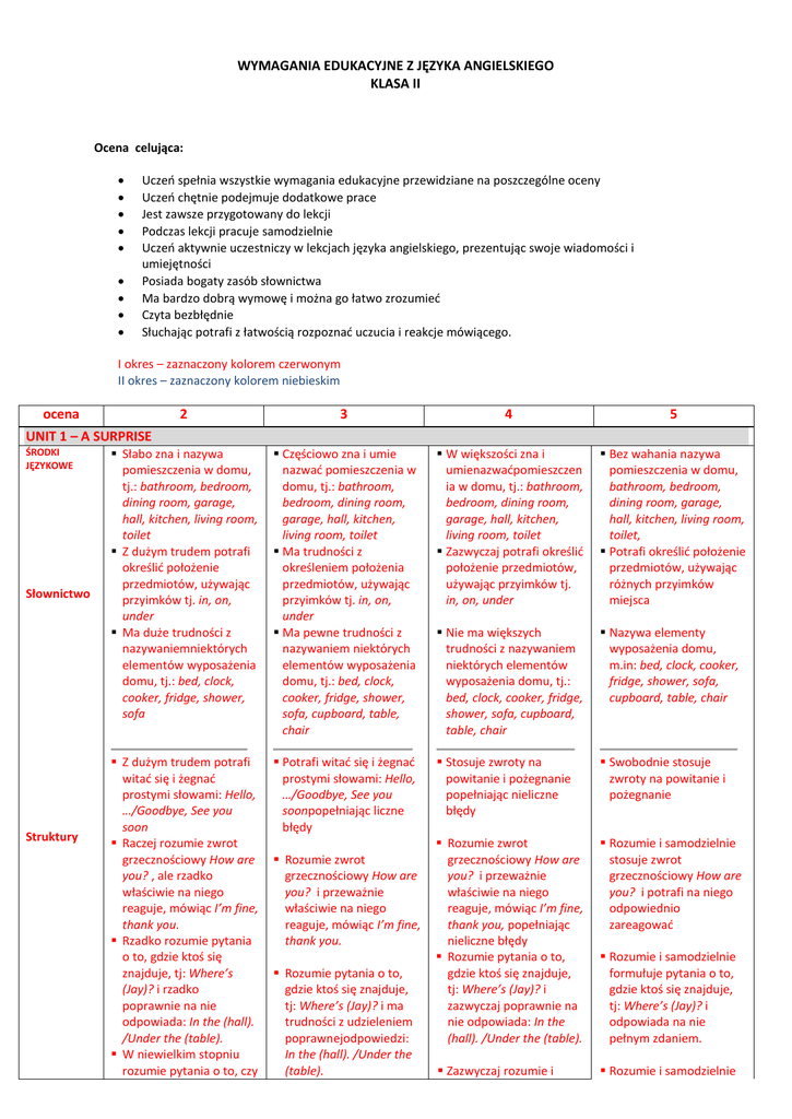 WYMAGANIA EDUKACYJNE Z JĘZYKA ANGIELSKIEGO KLASA II Ocena celująca: Uczeń spełnia wszystkie wymagania edukacyjne przewidziane na poszczególne oceny Uczeń chętnie podejmuje dodatkowe prace Jest zawsze przygotowany do lekcji Podczas lekcji pracuje samodzielnie Uczeń aktywnie uczestniczy w lekcjach języka angielskiego, prezentując swoje wiadomości i umiejętności Posiada bogaty zasób słownictwa Ma bardzo dobrą wymowę i można go łatwo zrozumieć Czyta bezbłędnie Słuchając potrafi z łatwością rozpoznać uczucia i reakcje mówiącego. I okres – zaznaczony kolorem czerwonym II okres – zaznaczony kolorem niebieskim ocena UNIT 1 – A SURPRISE ŚRODKI JĘZYKOWE Słownictwo Struktury 2 3 4 5 Słabo zna i nazywa pomieszczenia w domu, tj.: bathroom, bedroom, dining room, garage, hall, kitchen, living room, toilet Z dużym trudem potrafi określić położenie przedmiotów, używając przyimków tj. in, on, under Ma duże trudności z nazywaniemniektórych elementów wyposażenia domu, tj.: bed, clock, cooker, fridge, shower, sofa Częściowo zna i umie nazwać pomieszczenia w domu, tj.: bathroom, bedroom, dining room, garage, hall, kitchen, living room, toilet Ma trudności z określeniem położenia przedmiotów, używając przyimków tj. in, on, under Ma pewne trudności z nazywaniem niektórych elementów wyposażenia domu, tj.: bed, clock, cooker, fridge, shower, sofa, cupboard, table, chair W większości zna i umienazwaćpomieszczen ia w domu, tj.: bathroom, bedroom, dining room, garage, hall, kitchen, living room, toilet Zazwyczaj potrafi określić położenie przedmiotów, używając przyimków tj. in, on, under Bez wahania nazywa pomieszczenia w domu, bathroom, bedroom, dining room, garage, hall, kitchen, living room, toilet, Potrafi określić położenie przedmiotów, używając różnych przyimków miejsca Nie ma większych trudności z nazywaniem niektórych elementów wyposażenia domu, tj.: bed, clock, cooker, fridge, shower, sofa, cupboard, table, chair Nazywa elementy wyposażenia domu, m.in: bed, clock, cooker, fridge, shower, sofa, cupboard, table, chair Z dużym trudem potrafi witać się i żegnać prostymi słowami: Hello, …/Goodbye, See you soon Raczej rozumie zwrot grzecznościowy How are you? , ale rzadko właściwie na niego reaguje, mówiąc I’m fine, thank you. Rzadko rozumie pytania o to, gdzie ktoś się znajduje, tj: Where’s (Jay)? i rzadko poprawnie na nie odpowiada: In the (hall). /Under the (table). W niewielkim stopniu rozumie pytania o to, czy Potrafi witać się i żegnać prostymi słowami: Hello, …/Goodbye, See you soonpopełniając liczne błędy Stosuje zwroty na powitanie i pożegnanie popełniając nieliczne błędy Swobodnie stosuje zwroty na powitanie i pożegnanie Rozumie zwrot grzecznościowy How are you? i przeważnie właściwie na niego reaguje, mówiąc I’m fine, thank you, popełniając nieliczne błędy Rozumie pytania o to, gdzie ktoś się znajduje, tj: Where’s (Jay)? i zazwyczaj poprawnie na nie odpowiada: In the (hall). /Under the (table). Rozumie i samodzielnie stosuje zwrot grzecznościowy How are you? i potrafi na niego odpowiednio zareagować Zazwyczaj rozumie i Rozumie i samodzielnie Rozumie zwrot grzecznościowy How are you? i przeważnie właściwie na niego reaguje, mówiąc I’m fine, thank you. Rozumie pytania o to, gdzie ktoś się znajduje, tj: Where’s (Jay)? i ma trudności z udzieleniem poprawnejodpowiedzi: In the (hall). /Under the (table). Rozumie i samodzielnie formułuje pytania o to, gdzie ktoś się znajduje, tj: Where’s (Jay)? i odpowiada na nie pełnym zdaniem. ktoś lub coś znajduje się we wskazanym miejscu: Is (Sue) in the (cupboard)?i z dużym trudem na nie odpowiada: Yes, she is./No, she isn’t. Słabo rozumie pytania o to, czy posiada dany przedmiot: Have you got (a clock) in your (bedroom)?i rzadko poprawnie na nie odpowiada: Yes, I have./No, I haven’t. W niewielkim stopniu wskazuje elementy wyposażenia i bardzo rzadko poprawnie je nazywa: It’s a … (sofa). Umiejętności wg NPP Rzadko reaguje werbalnie i niewerbalnie na proste polecenia Rzadko poprawnie rozpoznaje zwroty codzienne Ma trudności z zaśpiewaniem piosenki: Where’s Li? i The shower is in the bathroom. nawet z pomocą nauczyciela Rzadko poprawnie recytuje proste rymowanki Z trudem poprawnie rozpoznaje głoskę / / w usłyszanych wyrazach Z trudem rozumie sens opowiadanych historyjek i rzadko wskazuje wybrane przedmioty/postaci w historyjce Ma duże trudności nawet przy wsparciu nauczyciela w odgrywaniu scenek i dialogów W niewielkim stopniu potrafi korzystać ze słowniczka obrazkowego Rzadko współpracuje z rówieśnikami w trakcie nauki Częściowo rozumie r pytania o to, czy ktoś lub coś znajduje się we wskazanym miejscu: Is (Sue) in the (cupboard)?i (cupboard)? ma trudności z udzieleniem poprawnej odpowiedzi: Yes, she odpowiedzi:: is./No, she isn’t. Częściowo rozumie pytania o to, czy posiada dany przedmiot: Have you got (a clock) in your (bedroom)? ma (bedroom)?i trudności z udzieleniem poprawnej odpowiedzi: odpowiedzi Yes, I have./No, I haven’t. Częściowo wskazuje elementy wyposażenia i rzadko poprawnie je nazywa: It’s a … (sofa). Częściowo we właściwy sposób reaguje werbalnie i niewerbalnie na proste polecenia Przeważnie poprawnie rozpoznaje zwroty codzienne Z pomocą nauczyciela śpiewa piosenki: Where’s Li? i The shower is in the bathroom. R Recytuje proste rymowanki popełniając błędy Cz Czasami poprawnie rozpoznaje głoskę / / w usłyszanych wyrazach Z pomocą nauczyciela r rozumie sens opowiadanych historyjek i częściowo poprawnie wskazuje wybrane przedmioty/postaci w historyjce Czasami ma trudności w odgrywaniu scenek i dialogów często dialogów, korzystając z pomocy nauczyciela Z pomocą nauczyciela korzysta ze słowniczka obrazkowego W niewielkim stopniu współpracuje z rówieśnikami w trakcie nauki Z trudem poprawnie samodzielnie zadaje pyt