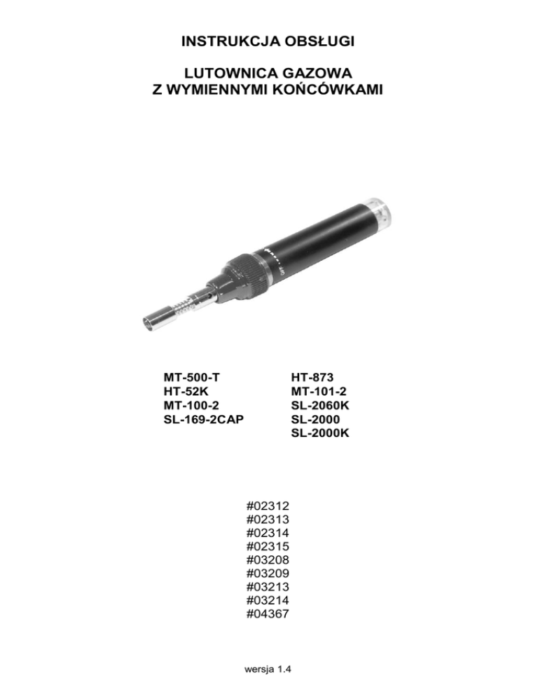 INSTRUKCJA OBSŁUGI LUTOWNICA GAZOWA Z WYMIENNYMI KOŃCÓWKAMI MT-500-T HT-52K MT-100-2 SL-169-2CAP HT-873 MT-101-2 SL-2060K SL-2000 SL-2000K #02312 #02313 #02314 #02315 #03208 #03209 #03213 #03214 #04367 wersja 1.4 Wstęp Lutownica gazowa to wielofunkcyjne narzędzie z możliwością wielokrotnego napełniania. W zależności od rodzaju użytej nasadki może być stosowane jako lutownica lub palnik gazowy. Narzędzie przeznaczone jest do lutowania twardego, jako narzędzie odcinające, nóż cieplny do styropianu, do obkurczania rur termokurczliwych, itp. W zależności od użytej nasadki temperatura robocza narzędzia wynosi: - maksymalna temperatura palnika gazowego: 1300°C, - maksymalna temperatura lutownicy gazowej: 400°C. Instrukcja ta zawiera opis lutownicy gazowej z odpowiednimi procedurami montażu i użytkowania. Przed przystąpieniem do pracy z narzędziem należy dokładnie przeczytać całość tej instrukcji, w szczególności zaś punkty poświęcone bezpieczeństwu. 1. Zawartość opakowania - lutownica gazowa ze zbiornikiem plastikowym lub metalowym (w zależności od modelu), - nasadka lutownicza z grotem, - niniejsza instrukcja obsługi, - osłona zabezpieczająca z zapalarką (modele: SL-2000, SL-2050K, SL-169-2CAP), - dodatkowe końcówki (model: SL-2050K), - podstawka (modele: HT-52K, SL-2050K). Podczas dostawy należy upewnić się, że opakowanie nie jest uszkodzone. W przypadku stwierdzonych uszkodzeń należy niezwłocznie skontaktować się z dostawcą. Prosimy również o sprawdzenie zgodności zawartości opakowania z powyżej zamieszczoną listą. 2. Bezpieczeństwo użytkowania Narzędzie zostało zaprojektowane i wyprodukowane z najwyższą starannością o bezpieczeństwo użytkownika. Dla zapewnienia bezpieczeństwa pracy, należy stosować się do wszelkich wskazań zawartych w tej instrukcji. 3. Zasady bezpieczeństwa a) Przechowywać w miejscu niedostępnym dla dzieci. b) W czasie pracy groty i nasadki są gorące. Nie należy dotykać rozgrzanych części, oraz innych miejsc z otwartym płomieniem. c) Należy zawsze używać okularów ochronnych. d) W pobliżu miejsca pracy z lutownicą gazową należy zadbać o zabezpieczenie gaśnicy lub zbiornika z wodą. e) Nie należy wykonywać napraw narzędzia we własnym zakresie. f) Narzędzie powinno być używane jedynie w dobrze wietrzonych pomieszczeniach. Należy unikać wdychania oparów i spalin. g) Należy zachować szczególną ostrożność podczas lutowania przedmiotów kadmowanych i galwanizowanych. h) Nie należy napełniać zbiornika gazem w pobliżu źródeł ognia i rozgrzanych przedmiotów. i) Nie należy pozostawiać narzędzia w miejscu narażonym na bezpośrednie działanie promieni słonecznych lub tam, gdzie temperatura przewyższa 40°C. 2 j) Przed schowaniem narzędzia należy pozostawić je do wystygnięcia do temperatury pokojowej. k) Nie schładzać w wodzie. Części powinny wystygnąć samoczynnie. l) Przed użyciem (lutowaniem, założeniem grotu) należy upewnić się, że płomień wychodzi poprzez dyszę. 4 Praca z palnikiem 4.1 Napełnianie Aby zapewnić długotrwałe użytkowanie narzędzia należy stosować filtrowany gaz wysokiej jakości. - przed napełnieniem gazem, należy upewnić się czy regulator płomienia jest wyłączony tj. czy pokrętło ustawione jest w pozycji OFF; - w celu napełnienia gazem należy dopasować końcówki zaworów; - odwrócić zbiornik na gaz zaworem do napełniania do góry a następnie docisnąć zbiornik z gazem do narzędzia; - całkowite napełnienie następuje po ok. 10 sekundach. Należy odczekać kilka minut w celu ustabilizowania gazu. Narzędzie fabrycznie nie jest napełnione gazem. 4.2 Zapalanie a) Aby uruchomić narzędzie należy wypchnąć regulator płomienia w stronę końcówki palnika i obrócić w kierunku ON aż do wystąpienia charakterystycznego dźwięku wydobywającego się gazu (Rys. 1). b) Użyć zapalniczki lub zapalarki do zapalenia gazu wydobywającego się z dyszy grotu (Rys. 2) lub palnika (Rys. 3). c) Narzędzie będzie gotowe do pracy po kilku sekundach. Rys. 1 Rys. 2 Rys. 3 4.3 Wymiana końcówek Należy upewnić się, że części składowe palnika nie są gorące. Aby wymienić nasadkę do lutowania należy ją odkręcić i zastąpić nasadką-palnikiem (lub inną). Nasadki do lutowania składają się z dwóch części, jest więc możliwa wymiana samej końcówki do lutowania. 4.4 Regulacja płomienia Rozgrzanie wszystkich końcówek można kontrolować za pomocą „regulatora płomienia”. - płomień palnika powinien mieć ok. 12 mm. Ustawienie dłuższego płomienia nie powoduje poprawy działania urządzenia a jedynie marnuje paliwo. - pracując z nasadką lutowniczą ustaw „regulator płomienia” na ok. ½ maksymalnej możliwości. Przegrzanie może spowodować zniszczenie końcówki. 3 5. Wyposażenie dodatkowe Wyposażenie dodatkowe jest dostępne oddzielnie i nie stanowi elementu zestawu. Pomimo dołożenia wszelkich starań nie gwarantujemy, że publikowane w niniejszej instrukcji informacje są wolne od błędów. W celu weryfikacji danych i uzyskania szczegółowych informacji dotyczących niniejszego urządzenia prosimy o odwiedzenie strony www.atel.com.pl. Atel Electronics www.atel.com.pl hs/dr/08.02.2010 4