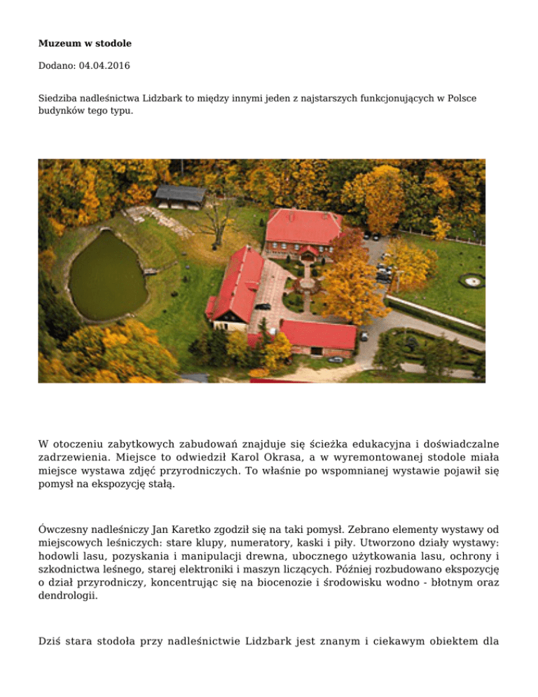 Muzeum w stodole Dodano: 04.04.2016 Siedziba nadleśnictwa Lidzbark to między innymi jeden z najstarszych funkcjonujących w Polsce budynków tego typu. W otoczeniu zabytkowych zabudowań znajduje się ścieżka edukacyjna i doświadczalne zadrzewienia. Miejsce to odwiedził Karol Okrasa, a w wyremontowanej stodole miała miejsce wystawa zdjęć przyrodniczych. To właśnie po wspomnianej wystawie pojawił się pomysł na ekspozycję stałą. Ówczesny nadleśniczy Jan Karetko zgodził się na taki pomysł. Zebrano elementy wystawy od miejscowych leśniczych: stare klupy, numeratory, kaski i piły. Utworzono działy wystawy: hodowli lasu, pozyskania i manipulacji drewna, ubocznego użytkowania lasu, ochrony i szkodnictwa leśnego, starej elektroniki i maszyn liczących. Później rozbudowano ekspozycję o dział przyrodniczy, koncentrując się na biocenozie i środowisku wodno - błotnym oraz dendrologii. Dziś stara stodoła przy nadleśnictwie Lidzbark jest znanym i ciekawym obiektem dla turystów oraz pasjonatów. Obejrzeć można stare maszyny związane z informatyką leśną, stare pilarki, świdry glebowe, a także narzędzia do nielegalnego chwytania zwierząt zgromadzone przez lata w magazynie Straży Leśnej. Warto odwiedzić muzeum i zobaczyć, jak dawniej pracowali leśnicy. Komentarze (0) Nie dodano jeszcze żadnego komentarza.