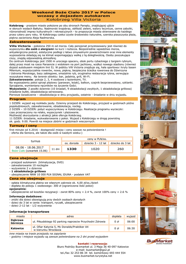 Weekend Boże Ciało 2017 w Polsce wczasy z dojazdem autokarem Kołobrzeg Villa Victoria Kołobrzeg - prastare miasto położone po obu stronach Parsęty, znajdującej ujście w słonych wodach Bałtyku. Nadmorski krajobraz, obfitość zieleni, walory lecznicze, cenne zabytki, różnorodność imprez kulturalnych i rekreacyjnych - to propozycje miasta skierowane do każdego przez cztery pory roku. W Kołobrzegu czeka czyste środowisko naturalne, szeroka piaszczysta plaża, piękna zacieniona Aleja Nadmorska. Zakwaterowanie Villa Victoria - położona 250 m od morza. Cały pensjonat przystosowany jest również do wypoczynku dla osób z alergiami na kurz i roztocza. Bezpośrednie sąsiedztwo morza, antyalergiczna pościel, estetyczne podłogi z łatwo zmywalnymi powierzchniami oraz inne elementy wyposażenia składają się na klimat wspomagający walkę z tą dolegliwością. Osoby poszukujące ciszy, znajdą odpowiednią atmosferę. Do centrum Kołobrzegu jest 1500 m uroczego spaceru, obok portu rybackiego z targiem rybnym, dalej przez most na rzece Parsencie z widokiem na port jachtowy, wzdłuż nowego stadionu (również dojazd autobusem miejskim linii 5). W pobliżu Villi Victoria znajduje się, hala sportowa i kryty basen Milenium, wypożyczalnia rowerów, nowa, piękna, bezpieczna ścieżka rowerowa do Dźwirzyna i Ustronia Morskiego, bazy zabiegowe, smażalnie ryb, oryginalna restauracja rybna, serwująca wyszukane menu. Na terenie obiektu: bar, jadalnia, grill, Wi-Fi. Zakwaterowanie: pokoje 2, 3, 4 osobowe z łazienkami, TV. Na wyposażeniu pokoi sprzęt plażowy (parawan, leżak), balkon, czajnik bezprzewodowy, szklanki. Sprzątanie, wymieniana ręczników na życzenie Gości. Wyżywienie: 2 posiłki dziennie (10 śniadań, 9 obiadokolacji zwykłych, 1 obiadokolacja grillowa) śniadanie bufet, obiadokolacja serwowana. Pierwsze świadczenie – obiadokolacja w dniu przyjazdu, ostatnie - śniadanie w dniu wyjazdu. Program 1 DZIEŃ: wyjazd wg rozkładu jazdy. Dzienny przejazd do Kołobrzegu, przyjazd w godzinach późno popołudniowych, zakwaterowanie, obiadokolacja, nocleg. 2 DZIEŃ – 10 DZIEŃ: pobyt wypoczynkowy w Kołobrzegu. Realizacja programu wycieczki: czas przeznaczony na relaks, wypoczynek i plażowanie. Możliwość skorzystania z atrakcji jakie oferuje Kołobrzeg. 11 DZIEŃ: śniadanie, wykwaterowanie z pokoi. Wyjazd z Kołobrzegu w drogę powrotną ok. godz. 9.00. Powrót na miejsce zbiórki w godzinach wieczornych. Turnusy i ceny first minute od X.2016 - dostępność miejsc i ceny zawsze na potwierdzenie ! - oferta dla Seniora, ale także dla osób w każdym wieku:) ceny w PLN/os. turnus 08.06 - 18.06.2017 Boże Ciało (czwartek 15.06) 11 dni os. dorosła dziecko 3 - 12 lat dziecko do 3 lat 1330 1020 260 a Cena obejmuje - przejazd autokarem (klimatyzacja, DVD) zakwaterowanie 10 noclegów wyżywienie 2 x dziennie 1 obiadokolacja grillowa ubezpieczenie NNW 10 000 PLN SIGNAL IDUNA - podatek VAT Cena nie obejmuje - opłata klimatyczna płatna we własnym zakresie ok. 4,00 zł/os./dzień - dopłata do pokoju 1 osobowego: 300 zł (ograniczona ilość pokoi) opcjonalnie: - ubezpieczenie od kosztów rezygnacji - zwrot 80% ceny = 2.4 %, zwrot 100% ceny = 2.6 % Informacje dodatkowe: - zniżki dla dzieci obowiązują przy dwóch osobach dorosłych - dzieci do 3 lat w cenie: transport, ryczałt, ubezpieczenie - dzieci 2-12 lat - 1/2 wyżywienia Informacje transportowe miasto Dąbrowa Górnicza adres ul. Piłsudskiego 92 parking naprzeciw Przychodni Zdrowia ul. Ofiar Katynia 5, Mc Donalds/Praktiker A4 w kierunku Wrocławia inne miasta na trasie przejazdu na zapytanie - godziny i miejsce wyjazdu są zawsze potwierdzane na 2 dni przed wyjazdem Katowice dopłata wyjazd 0 zł 06:00 0 zł 06:30 kontakt i rezerwacja: Biuro Podróży Busmarket ul. 3 Maja 36 40-097 Katowice e-mail: [email protected] tel./fax 32 253 86 34 tel. komórkowy 693 444 554 www.busmarket.turystyka.net
