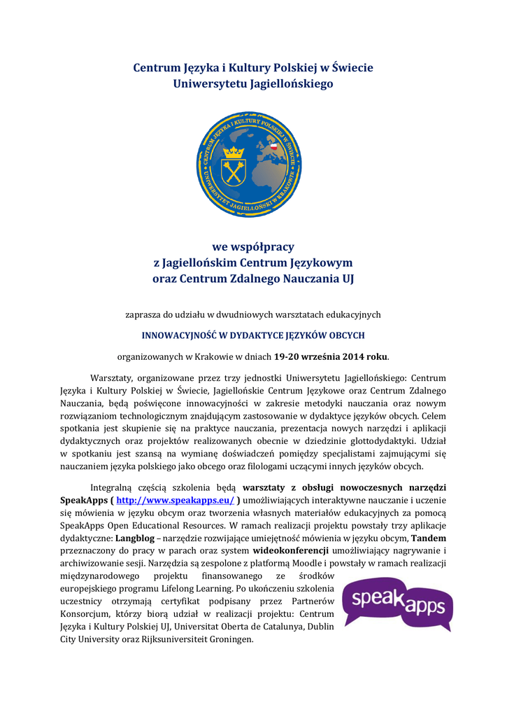 Centrum Języka i Kultury Polskiej w Świecie Uniwersytetu Jagiellońskiego we współpracy z Jagiellońskim Centrum Językowym oraz Centrum Zdalnego Nauczania UJ zaprasza do udziału w dwudniowych warsztatach edukacyjnych INNOWACYJNOŚĆ W DYDAKTYCE JĘZYKÓW OBCYCH organizowanych w Krakowie w dniach 19-20 września 2014 roku. Warsztaty, organizowane przez trzy jednostki Uniwersytetu Jagiellońskiego: Centrum Języka i Kultury Polskiej w Świecie, Jagiellońskie Centrum Językowe oraz Centrum Zdalnego Nauczania, będą poświęcone innowacyjności w zakresie metodyki nauczania oraz nowym rozwiązaniom technologicznym znajdującym zastosowanie w dydaktyce języków obcych. Celem spotkania jest skupienie się na praktyce nauczania, prezentacja nowych narzędzi i aplikacji dydaktycznych oraz projektów realizowanych obecnie w dziedzinie glottodydaktyki. Udział w spotkaniu jest szansą na wymianę doświadczeń pomiędzy specjalistami zajmującymi się nauczaniem języka polskiego jako obcego oraz filologami uczącymi innych języków obcych. Integralną częścią szkolenia będą warsztaty z obsługi nowoczesnych narzędzi SpeakApps ( http://www.speakapps.eu/ ) umożliwiających interaktywne nauczanie i uczenie się mówienia w języku obcym oraz tworzenia własnych materiałów edukacyjnych za pomocą SpeakApps Open Educational Resources. W ramach realizacji projektu powstały trzy aplikacje dydaktyczne: Langblog – narzędzie rozwijające umiejętność mówienia w języku obcym, Tandem przeznaczony do pracy w parach oraz system wideokonferencji umożliwiający nagrywanie i archiwizowanie sesji. Narzędzia są zespolone z platformą Moodle i powstały w ramach realizacji międzynarodowego projektu finansowanego ze środków europejskiego programu Lifelong Learning. Po ukończeniu szkolenia uczestnicy otrzymają certyfikat podpisany przez Partnerów Konsorcjum, którzy biorą udział w realizacji projektu: Centrum Języka i Kultury Polskiej UJ, Universitat Oberta de Catalunya, Dublin City University oraz Rijksuniversiteit Groningen. W ramach cyklu spotkań zaplanowano trzy panele warsztatowo-dyskusyjne oraz panel studencko-doktorancki. PANEL 1. KRAJOWE I MIĘDZYNARODOWE PROJEKTY W ZAKRESIE NAUCZANIA JĘZYKÓW OBCYCH I MOŻLIWOŚCI ICH WYKORZYSTANIA W CODZIENNEJ PRAKTYCE NAUCZYCIELSKIEJ W ramach tego panelu zachęcamy Państwa do prezentacji projektów, których celem jest wspomaganie nauczania języków obcych poprzez prowadzenie badań nad współczesnym językiem oraz jego dynamiką, tworzenie korpusów tekstów, przygotowanie nowych materiałów dydaktycznych oraz opracowanie narzędzi edukacyjnych w oparciu o nowe technologie. Zapraszamy Państwa do przygotowania referatu, prezentacji multimedialnej lub przeprowadzenia warsztatów. PANEL 2. ZASTOSOWANIE NOWYCH TECHNOLOGII W KSZTAŁCENIU JĘZYKOWYM Do udziału w tym panelu zapraszamy nauczycieli, którzy w swojej pracy wykorzystują najnowsze rozwiązania, jakie stwarzają technologie informacyjno-komunikacyjne i chcieliby podzielić się wynikami badań prowadzonych na tym gruncie lub przeprowadzić szkolenie z użyciem wybranych narzędzi oraz aplikacji. Szczególnie zachęcamy do wystąpień wpisujących się w następujące kręgi tematyczne: wykorzystanie platform edukacyjnych w kształceniu językowym jako elementu wspomagającego w ramach kursów stacjonarnych oraz w nauczaniu zdalnym, wirtualne społeczności językowe i ich rola w poznawaniu języków obcych, projekty językowe i kulturowe realizowane zdalnie, urządzenia mobilne i możliwości ich wykorzystania w nauce języka, prezentacja ogólnodostępnych aplikacji webowych i ich zastosowanie w tworzeniu materiałów dydaktycznych, rola gier w edukacji językowej. PANEL 3. INNOWACJE W METODYCE NAUCZANIA JĘZYKÓW OBCYCH Panel metodyczny zaplanowany został jako przestrzeń wymiany doświadczeń dla wszystkich zajmujących się metodyką nauczania języków obcych i planowaniem dydaktycznym. Zachęcamy Państwa do przygotowania prezentacji w obrębie następujących kręgów tematycznych: podejście działaniowe – od teorii do praktyki, kształcenie oparte na realizacji projektów, nauczanie języków obcych w kontekście kształcenia umiejętności kluczowych, efektywne techniki rozwijania sprawności językowych i nauczania podsystemów języka, neurodydaktyka a nauczanie i uczenie się języków obcych, dydaktyka wielojęzyczności, niekonwencjonalne formy kształcenia. Proponujemy Państwu różne formy prezentacji wybranych problemów – od wygłoszenia referatu przez warsztaty po microteaching. PANEL STUDENCKO-DOKTORANCKI NOWA GENERACJA, NOWE SPOJRZENIE! Udział w panelu studenckim to szansa dla osób, które przygotowują się do napisania rozprawy magisterskiej, planują bądź prowadzą badania nad określonymi aspektami rzeczywistości glottodydaktycznej i chcą podzielić się swoimi pomysłami z koleżankami i kolegami przygotowującymi się do roli nauczyciela języka obcego. Tematyka zgłaszanych referatów powinna odpowiadać przewodniemu tematowi konferencji. Prosimy o przesyłanie propozycji wystąpień z zaznaczeniem panelu, w którym chcieliby Państwo wziąć udział, interesującej Państwa formy prezentacji oraz czasu potrzebnego na wygłoszenie prezentacji lub przeprowadzenie warsztatów. Jednocześnie organizatorzy zastrzegają sobie prawo wyboru zgłoszonych referatów oraz warsztatów. Zgłoszenia wystąpień wraz ze streszczeniem oraz wszelkie zapytania prosimy kierować pod adresem: [email protected]. Bieżące informacje na temat konferencji można także znaleźć na stronie: polishstudies.uj.edu.pl (zakładka: KONFERENCJE) Nadsyłanie zgłoszeń (p. załącznik): do 30 czerwca 2014 r. Języki robocze konferencji: polski i angielski. Opłata konferencyjna: 200 zł (100 zł dla studentów i doktorantów) obejmuje udział w konferencji, uroczystą kolację (19 września) oraz przerwy kawowe. Organizatorzy nie zapewniają posiłków ani nocl