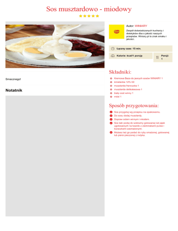 Sos musztardowo miodowy Autor: WINIARY Zespół doświadczonych kucharzy i dietetyków dba o jakość naszych przepisów. Winiary.pl to znak smaku i jakości. Łączny czas: 15 min. Kalorie: kcal/1 porcję Porcji: 1 Składniki: Smacznego! Kremowa Baza do jasnych sosów WINIARY 1 śmietanka 12% 50 musztarda francuska 1 Notatnik musztarda delikatesowa 1 biały ocet winny 1 miód 1 Sposób przygotowania: Sos przygotuj wg przepisu na opakowaniu. Do sosu dodaj musztardy. Dopraw octem winnym i miodem. Sos taki podaj do wołowiny gotowanej lub jajek ugotowanych na twardo z ziemniakami puree i buraczkami zasmażonymi. Możesz też go podać do ryby smażonej, gotowanej lub piersi pieczonej z indyka.