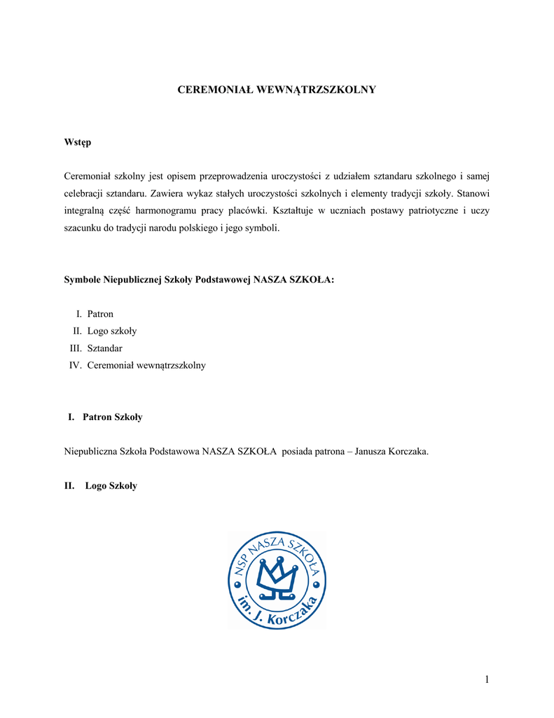 CEREMONIAŁ WEWNĄTRZSZKOLNY Wstęp Ceremoniał szkolny jest opisem przeprowadzenia uroczystości z udziałem sztandaru szkolnego i samej celebracji sztandaru. Zawiera wykaz stałych uroczystości szkolnych i elementy tradycji szkoły. Stanowi integralną część harmonogramu pracy placówki. Kształtuje w uczniach postawy patriotyczne i uczy szacunku do tradycji narodu polskiego i jego symboli. Symbole Niepublicznej Szkoły Podstawowej NASZA SZKOŁA: I. Patron II. Logo szkoły III. Sztandar IV. Ceremoniał wewnątrzszkolny I. Patron Szkoły Niepubliczna Szkoła Podstawowa NASZA SZKOŁA posiada patrona – Janusza Korczaka. II. Logo Szkoły 1 III. Sztandar Szkoły Sztandar szkolny dla społeczności szkolnej jest symbolem Polski. Uroczystości z udziałem sztandaru wymagają zachowania powagi, a jego przechowywanie, transport i przygotowanie do prezentacji, właściwych postaw jego poszanowania. Sztandar jest przechowywany w zamkniętej gablocie na korytarzu szkolnym. W tym samym miejscu znajdują się insygnia pocztu sztandarowego. Skład pocztu sztandarowego: - chorąży: jeden uczeń, - zastępca chorążego: jeden uczeń, - asysta: dwóch uczniów. Kandydatury składu pocztu zgłaszane są przez wychowawców (za zgodą nauczycieli i rodziców wybranych uczniów) do dyrektora szkoły. Uczniowie wybierani są z klasy programowo najwyższej. Kadencja pocztu trwa jeden rok – począwszy od ślubowania w dniu uroczystego zakończenia roku szkolnego klas VI . Po skończeniu kadencji nazwiska uczniów są wpisane do kroniki szkoły oraz publicznie są im wręczane pamiątkowe dyplomy. Decyzją rady pedagogicznej uczniowie mogą być odwołani ze składu pocztu sztandarowego. W takim wypadku należy dokonać kolejnego wyboru. Insygnia pocztu sztandarowego to biało – czerwone szarfy założone przez prawe ramię, zwrócone kolorem białym w stronę kołnierza, spięte na lewym biodrze oraz białe rękawiczki. IV. Ceremoniał wewnątrzszkolny 1. Uroczystości szkolne Sztandar bierze udział we wszystkich ważnych uroczystościach szkolnych i świętach państwowych: - uroczyste rozpoczęcie roku szkolnego, - ślubowanie klas pierwszych, 2 - uroczystości rocznicowe, - święto patrona, - pożegnanie absolwentów klas VI, - uroczyste zakończenie roku szkolnego. Chorąży i asysta powinni być ubrani odświętnie: - uczeń: ciemny garnitur lub ciemne spodnie, biała koszula, czarne lub granatowe obuwie - uczennica: biała bluzka i ciemna spódnica, czarne lub granatowe obuwie Uczniowie Niepublicznej Szkoły Podstawowej NASZA SZKOŁA, uczestnicząc w uroczystościach szkolnych i pozaszkolnych, powinni być ubrani odświętnie. 2. Chwyty sztandaru: W trakcie przebiegu uroczystości z udziałem pocztu sztandarowego ustala się następujące postawy i chwyty: - postawa „zasadnicza” -sztandar położony na trzewiku drzewca przy prawej nodze na wysokości czubka buta. Drzewce przytrzymywane prawą ręką na wysokości pasa. Lewa ręka jak w postawie „zasadniczej”. - postawa "spocznij" - sztandar trzymany przy prawej nodze jak w postawie "zasadniczej". Chorąży i asysta w postawie "spocznij". - postawa "na ramię" - chorąży prawą ręką (pomagając sobie lewą) kładzie drzewce na prawe ramię i trzyma je pod kątem 45° w stosunku do ramienia. Prawa ręka wyciągnięta wzdłuż drzewca. - postawa „prezentuj” - z postawy "zasadniczej" chorąży podnosi sztandar prawą ręką i pionowo do góry wzdłuż prawego ramienia (dłoń prawej ręki na wysokości barku). Następnie lewą ręką chwyta drzewiec sztandaru tuż pod prawą i opuszcza prawą rękę na całej jej długości, obejmując dolną część drzewca. Asysta w postawie "zasadniczej". - salutowanie sztandaru w miejscu- wykonuje się z postawy „prezentuj". Chorąży robi zwrot w prawo, skos z równoczesnym wysunięciem lewej nogi w przód na odległość jednej stopy i pochyla sztandar do przodu pod kątem 45°. Po czasie "salutowania" przenosi sztandar do postawy "prezentuj". - salutowanie sztandarem w marszu z położenia "na ramię" w taki sam sposób jak przy salutowaniu w miejscu. 3. Komendy dla pocztu sztandarowego podczas uroczystości szkolnych i rocznicowych: 3 I. Wejście pocztu sztandarowego Komendy i ich kolejność: 1. „Proszę o powstanie” - Uczestnicy powstają przed wejściem pocztu flagowego. Sztandar w postawie „na ramię”. 2. „Baczność, sztandar wprowadzić” - Uczestnicy w postawie „zasadniczej”. Następuje wprowadzenie pocztu sztandarowego. Pozycja „na ramię” w marszu, następnie „prezentuj”. 3. „Do hymnu” - Uczestnicy w postawie „zasadniczej”, sztandar „salutowanie w miejscu”. 4. „Po hymnie” - Uczestnicy w postawie „spocznij” . II. Wyjście pocztu sztandarowego Komendy i ich kolejność 1. „Proszę o powstanie” - Uczestnicy powstają przed wyjściem pocztu flagowego, pozycja „spocznij”. 2. „Baczność, sztandar wyprowadzić” - Uczestnicy w postawie „zasadniczej”. Sztandar wyprowadzany w pozycji „na ramię”. 3. „Spocznij”- Uczestnicy siadają. 4. Ceremoniał przekazania sztandaru Uroczyste przekazanie sztandaru przedstawicielom klas młodszych następuje podczas uroczystości zakończenia szkoły przez klasy szóste. Po ceremonii wprowadzenia sztandaru zebrani na uroczystości zachowują postawę zasadniczą. Pada komenda: „Do przejęcia sztandaru – wystąp”. Sztandar przyjmuje pozycję „zasadniczą” (jest uniesiony). Do pocztu sztandarowego podchodzą wybrani przedstawiciele klas młodszych, którzy mają przejąć sztandar i stają naprzeciw pocztu sztandarowego. Asysta sztandaru zdejmuje biało-czerwone szarfy i zakładają nowej asyście. Osoby przejmujące sztandar mają już założone białe rękawiczki. Chorąży wręcza sztandar nowemu chorążemu (sztandar zachowuje pozycję „baczność”), a następnie zdejmuje swoją szarfę i zakłada ją trzymającemu sztandar. Ustępujący poczet dokonuje przekazania szt