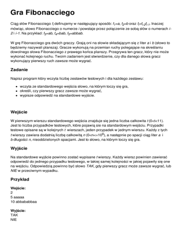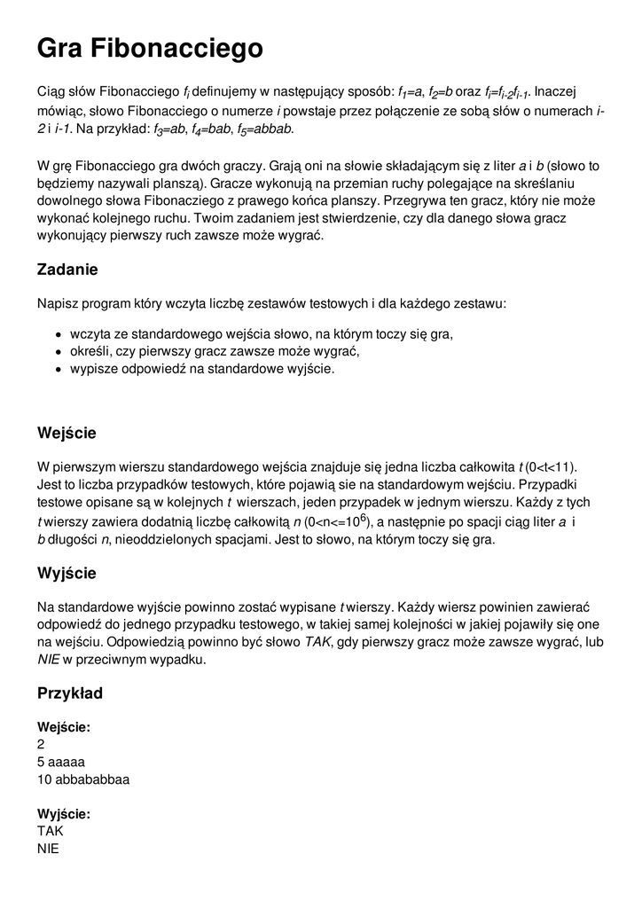 Gra Fibonacciego Ciąg słów Fibonacciego fi definujemy w następujący sposób: f1=a, f2=b oraz fi=fi-2fi-1. Inaczej mówiąc, słowo Fibonacciego o numerze i powstaje przez połączenie ze sobą słów o numerach i2 i i-1. Na przykład: f3=ab, f4=bab, f5=abbab. W grę Fibonacciego gra dwóch graczy. Grają oni na słowie składającym się z liter a i b (słowo to będziemy nazywali planszą). Gracze wykonują na przemian ruchy polegające na skreślaniu dowolnego słowa Fibonacziego z prawego końca planszy. Przegrywa ten gracz, który nie może wykonać kolejnego ruchu. Twoim zadaniem jest stwierdzenie, czy dla danego słowa gracz wykonujący pierwszy ruch zawsze może wygrać. Zadanie Napisz program który wczyta liczbę zestawów testowych i dla każdego zestawu: wczyta ze standardowego wejścia słowo, na którym toczy się gra, określi, czy pierwszy gracz zawsze może wygrać, wypisze odpowiedź na standardowe wyjście. Wejście W pierwszym wierszu standardowego wejścia znajduje się jedna liczba całkowita t (0<t<11). Jest to liczba przypadków testowych, które pojawią sie na standardowym wejściu. Przypadki testowe opisane są w kolejnych t wierszach, jeden przypadek w jednym wierszu. Każdy z tych t wierszy zawiera dodatnią liczbę całkowitą n (0<n<=106), a następnie po spacji ciąg liter a i b długości n, nieoddzielonych spacjami. Jest to słowo, na którym toczy się gra. Wyjście Na standardowe wyjście powinno zostać wypisane t wierszy. Każdy wiersz powinien zawierać odpowiedź do jednego przypadku testowego, w takiej samej kolejności w jakiej pojawiły się one na wejściu. Odpowiedzią powinno być słowo TAK, gdy pierwszy gracz może zawsze wygrać, lub NIE w przeciwnym wypadku. Przykład Wejście: 2 5 aaaaa 10 abbababbaa Wyjście: TAK NIE