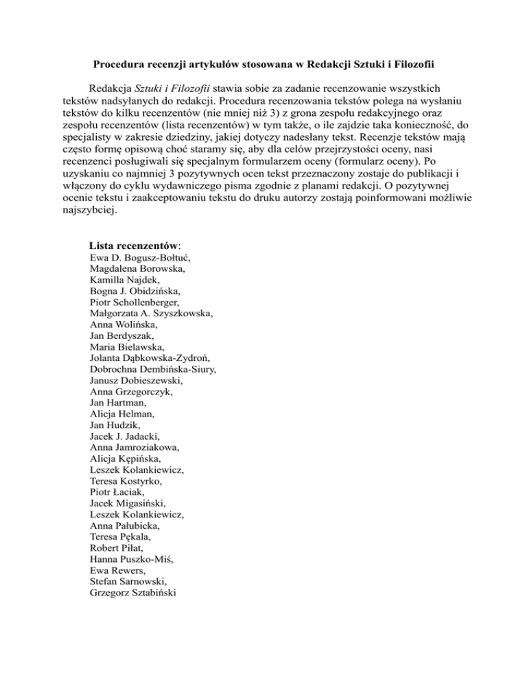 Procedura recenzji artykułów stosowana w Redakcji Sztuki i Filozofii Redakcja Sztuki i Filozofii stawia sobie za zadanie recenzowanie wszystkich tekstów nadsyłanych do redakcji. Procedura recenzowania tekstów polega na wysłaniu tekstów do kilku recenzentów (nie mniej niż 3) z grona zespołu redakcyjnego oraz zespołu recenzentów (lista recenzentów) w tym także, o ile zajdzie taka konieczność, do specjalisty w zakresie dziedziny, jakiej dotyczy nadesłany tekst. Recenzje tekstów mają często formę opisową choć staramy się, aby dla celów przejrzystości oceny, nasi recenzenci posługiwali się specjalnym formularzem oceny (formularz oceny). Po uzyskaniu co najmniej 3 pozytywnych ocen tekst przeznaczony zostaje do publikacji i włączony do cyklu wydawniczego pisma zgodnie z planami redakcji. O pozytywnej ocenie tekstu i zaakceptowaniu tekstu do druku autorzy zostają poinformowani możliwie najszybciej. Lista recenzentów: Ewa D. Bogusz-Bołtuć, Magdalena Borowska, Kamilla Najdek, Bogna J. Obidzińska, Piotr Schollenberger, Małgorzata A. Szyszkowska, Anna Wolińska, Jan Berdyszak, Maria Bielawska, Jolanta Dąbkowska-Zydroń, Dobrochna Dembińska-Siury, Janusz Dobieszewski, Anna Grzegorczyk, Jan Hartman, Alicja Helman, Jan Hudzik, Jacek J. Jadacki, Anna Jamroziakowa, Alicja Kępińska, Leszek Kolankiewicz, Teresa Kostyrko, Piotr Łaciak, Jacek Migasiński, Leszek Kolankiewicz, Anna Pałubicka, Teresa Pękala, Robert Piłat, Hanna Puszko-Miś, Ewa Rewers, Stefan Sarnowski, Grzegorz Sztabiński