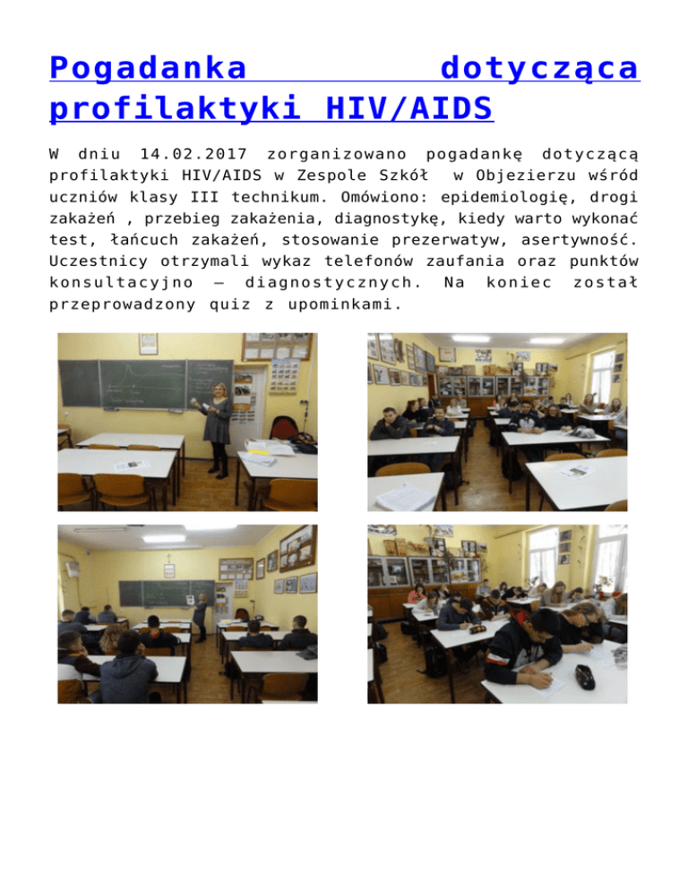 Pogadanka dotycząca profilaktyki HIV/AIDS W dniu 14.02.2017 zorganizowano pogadankę dotyczącą profilaktyki HIV/AIDS w Zespole Szkół w Objezierzu wśród uczniów klasy III technikum. Omówiono: epidemiologię, drogi zakażeń , przebieg zakażenia, diagnostykę, kiedy warto wykonać test, łańcuch zakażeń, stosowanie prezerwatyw, asertywność. Uczestnicy otrzymali wykaz telefonów zaufania oraz punktów konsultacyjno – diagnostycznych. Na koniec został przeprowadzony quiz z upominkami.