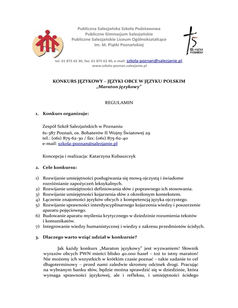 Publiczna Salezjańska Szkoła Podstawowa Publiczne Gimnazjum Salezjańskie Publiczne Salezjańskie Liceum Ogólnokształcące im. bł. Piątki Poznańskiej tel. 61 875 62 30, fax: 61 875 62 40, e-mail: [email protected], www.szkola-poznan.salezjanie.pl KONKURS JĘZYKOWY – JĘZYKI OBCE W JĘZYKU POLSKIM „Maraton językowy” REGULAMIN 1. Konkurs organizuje: Zespół Szkół Salezjańskich w Poznaniu 61-387 Poznań, os. Bohaterów II Wojny Światowej 29 tel.: (061) 875-62-30 / fax: (061) 875-62-40 e-mail: [email protected] Koncepcja i realizacja: Katarzyna Kubaszczyk 2. Cele konkursu: 1) Rozwijanie umiejętności posługiwania się mową ojczystą i świadome rozróżnianie zapożyczeń leksykalnych. 2) Rozwijanie umiejętności definiowania słów i poprawnego ich stosowania. 3) Rozwijanie umiejętności kojarzenia słów z określonym kontekstem. 4) Łączenie znajomości języków obcych z kompetencją języka ojczystego. 5) Rozwijanie sprawności interdyscyplinarnego kojarzenia wiedzy i poszerzenie aparatu pojęciowego. 6) Budowanie aparatu myślenia krytycznego w dziedzinie rozumienia tekstów i komunikatów. 7) Integrowanie wiedzy humanistycznej i wiedzy z zakresu przedmiotów ścisłych. 3. Dlaczego warto wziąć udział w konkursie? Jak każdy konkurs „Maraton językowy” jest wyzwaniem! Słownik wyrazów obcych PWN mieści blisko 40.000 haseł – toż to istny maraton! Nie możemy ich wszystkich w krótkim czasie poznać – takie zadanie to cel długoterminowy – przed nami zaledwie skromny odcinek drogi. Pracując na wybranym banku słów, będzie można sprawdzić się w dziedzinie, która wymaga sprawności językowej, ale i refleksu, i umiejętności ścisłego myślenia. Wiele słów znamy dzięki tekstom, które czytamy, słyszymy na co dzień oraz z przeróżnych lekcji i wykładów. Wiele z nich rozumiemy intuicyjnie, o wielu sądzimy, że je rozumiemy. Ale czy na pewno tak jest? Dzięki przygotowaniu do konkursu podniesiemy wiedzę i umiejętności z dziedziny, która w niewielkim zakresie rozwijana jest w szkole, lecz będzie owocować w późniejszej edukacji i w życiu. Zadania konkursowe mogą być okazją do dobrej zabawy. Jeśli lubisz się uczyć i polegać na przyswojonej wiedzy znajdziesz okazję do sprawdzenia się w teście. Jeśli lubisz być twórczy – zabaw się w wynalazcę i spróbuj stworzyć nowe słowa. Jeśli jesteś szybki i lubisz się ścigać – wystartuj w konkurencji grupowej! 4. Zasady uczestnictwa w konkursie W konkursie może wziąć udział każdy uczeń gimnazjum i liceum, który pragnie władać słowem niczym szpadą i używać języka precyzyjnie. Każdy może się przekonać o swoich umiejętnościach stając do walki o najlepsze miejsca indywidualnie i grupowo. Na etapie przygotowania do konkursu zgłoszeni uczestnicy otrzymują listę słów, które będą stanowić przedmiot zadań konkursowych. Osoby zgłoszone do kategorii TWÓRCA otrzymują ponadto listę słów, dla których samodzielnie należy stworzyć odpowiedniki polskie. Przewidujemy ciekawe nagrody. a) Konkurs na etapie szkolnym odbywa się wspólnie dla gimnazjum i liceum w następujących kategoriach: - indywidualne: „MARATOŃCZYK” (wiesz i umiesz) oraz „TWÓRCA” (tworzysz) - grupowa: „SPRINTER” (kojarzysz i zgadujesz) Uczniowie zgłaszają się indywidualnie bądź jako zespoły. Uczniowie, którzy zgłoszą się indywidualnie, a pragną wystąpić w kategorii zespołowej mogą wziąć udział w konkurencji zespołowej – będą wówczas dobrani do zespołów drogą losowania. Zespoły są dokładnie 2-osobowe. b) Podstawowym zadaniem konkursowym wspólnym dla wszystkich kategorii jest test definicyjno-etymologiczny zaliczany indywidualnie. c) dodatkową kategorią indywidualną jest TWÓRCA. Polega na wymyślaniu polskich słów dla zapożyczeń, które nie doczekały się jeszcze trwałych odpowiedników polskich. d) kategoria zespołowa SPRINTER polega na zabawie w ramach teleturnieju skojarzenia – wygrywa zespół, który odgadnie najwięcej haseł w najkrótszym czasie. e) Zadania konkursowe będą badały następujące umiejętności: definiowanie słów używanie słów adekwatnie do kontekstu (wypełnianie luk w tekście) znajomość etymologii (określanie języka źródłowego dla wskazanego słowa – znajomość słowa obcego, od którego pochodzi) umiejętność szybkiego kojarzenia i zgadywania słów (teleturniej skojarzenia – zgadywanie słów w zespołach) tworzenie polskich odpowiedników dla zapożyczeń f) Zadania konkursowe powinny być wykonywane przez uczestnika samodzielnie (wyjątek to konkurencja zespołowa według odrębnych zasad) bez pomocy słownika oraz bez posiłkowania się innymi zewnętrznymi źródłami wiedzy. 5. Warunkiem uczestnictwa jest dostarczenie organizatorom wypełnionego zgłoszenia (załącznik). Kartę zgłoszeniową można odebrać w sekretariacie Szkoły. 6. Jury konkursu oceniać będzie: „MARATOŃCZYK” Rozumienie słów i znajomość synonimów polskich Znajomość etymologii lub formy słowa w języku obcym Umiejętność definiowania i stosowania słów w kontekście „TWÓRCA” Formę i aspekty znaczeniowe nowych słów i wyrażeń zaproponowanych przez uczestnika jako odpowiedniki słów obcych „SPRINTER” Skuteczność drużyn w zgadywaniu słów poprzez skojarzenia. Czynnikiem wymiernym będzie czas realizacji zadania oraz ilość słów i wyrażeń odgadniętych. 7. Jury może unieważnić przyznaną punktację i nagrodę w przypadku udowodnienia naruszenia przez uczestnika regulaminu konkursu. 8. W sprawach nienormowanych niniejszym podejmuje przewodnicząca konkursu. regulaminem decyzje 9. Uczestnictwo w konkursie należy zgłaszać do dnia 15 kwietnia, w sekretariacie Szkoły zostawiając kartę zgłoszeniową. 10. Konkurs odbędzie się w dniu 12 maja 2016 o godz. 13 00 w Zespole Szkół Salezjańskich. Wszelkich informacji udziela organizator konkursu pani mgr Katarzy