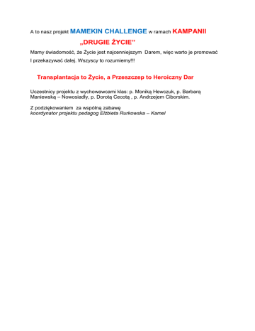 A to nasz projekt MAMEKIN CHALLENGE w ramach KAMPANII „DRUGIE ŻYCIE” Mamy świadomość, że Życie jest najcenniejszym Darem, więc warto je promować I przekazywać dalej. Wszyscy to rozumiemy!!! Transplantacja to Życie, a Przeszczep to Heroiczny Dar Uczestnicy projektu z wychowawcami klas: p. Moniką Hewczuk, p. Barbarą Maniewską – Nowosiadły, p. Dorotą Cecotą , p. Andrzejem Ciborskim. Z podziękowaniem za wspólną zabawę koordynator projektu pedagog Elżbieta Rurkowska – Kamel