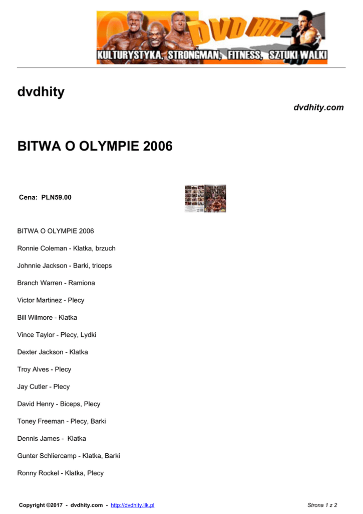 dvdhity dvdhity.com BITWA O OLYMPIE 2006 Cena: PLN59.00 BITWA O OLYMPIE 2006 Ronnie Coleman - Klatka, brzuch Johnnie Jackson - Barki, triceps Branch Warren - Ramiona Victor Martinez - Plecy Bill Wilmore - Klatka Vince Taylor - Plecy, Lydki Dexter Jackson - Klatka Troy Alves - Plecy Jay Cutler - Plecy David Henry - Biceps, Plecy Toney Freeman - Plecy, Barki Dennis James - Klatka Gunter Schliercamp - Klatka, Barki Ronny Rockel - Klatka, Plecy Copyright ©2017 - dvdhity.com - http://dvdhity.llk.pl Strona 1 z 2 Dennis Wolf - Plecy, Triceps Prawie 7 godzin filmu !!! Informacja o dostawcy Copyright ©2017 - dvdhity.com - http://dvdhity.llk.pl Strona 2 z 2