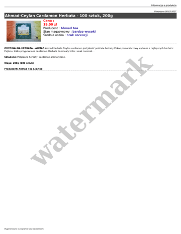 Informacje o produkcie Utworzono 08-03-2017 Ahmad-Ceylan Cardamon Herbata - 100 sztuk, 200g Cena : 19,00 zl Producent : Ahmad tea Stan magazynowy : bardzo wysoki Średnia ocena : brak recenzji ORYGINALNA HERBATA - AHMAD Ahmad Herbata Ceylon cardamon jest jakość podziale herbaty Pekoe pomarańczowy wybrane z najlepszych herbat z Cejlonu, lekko przyprawione cardamon. Herbata doskonały kolor, smak i aromat. . Składniki: Połączone herbaty, kardamon aromatyczne. w at Producent: Ahmad Tea Limited er m ar k Waga: 200g (100 sztuk) Wygenerowano w programie www.oscGold.com
