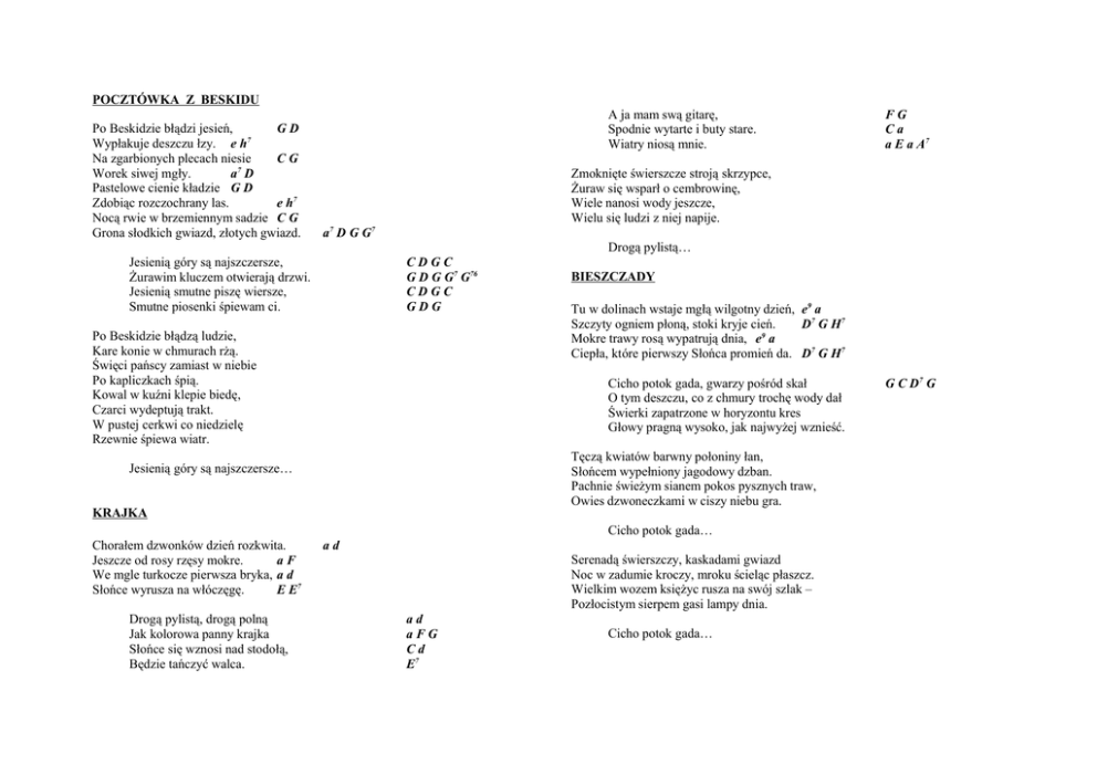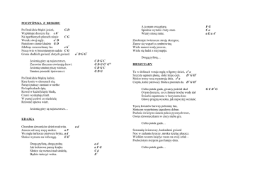 POCZTÓWKA Z BESKIDU Po Beskidzie błądzi jesień, GD Wypłakuje deszczu łzy. e h7 Na zgarbionych plecach niesie CG Worek siwej mgły. a7 D Pastelowe cienie kładzie G D Zdobiąc rozczochrany las. e h7 Nocą rwie w brzemiennym sadzie C G Grona słodkich gwiazd, złotych gwiazd. A ja mam swą gitarę, Spodnie wytarte i buty stare. Wiatry niosą mnie. FG Ca a E a A7 Zmoknięte świerszcze stroją skrzypce, Żuraw się wsparł o cembrowinę, Wiele nanosi wody jeszcze, Wielu się ludzi z niej napije. a7 D G G7 Drogą pylistą… Jesienią góry są najszczersze, Żurawim kluczem otwierają drzwi. Jesienią smutne piszę wiersze, Smutne piosenki śpiewam ci. CDGC G D G G7 G76 CDGC GDG Po Beskidzie błądzą ludzie, Kare konie w chmurach rżą. Święci pańscy zamiast w niebie Po kapliczkach śpią. Kowal w kuźni klepie biedę, Czarci wydeptują trakt. W pustej cerkwi co niedzielę Rzewnie śpiewa wiatr. BIESZCZADY Tu w dolinach wstaje mgłą wilgotny dzień, e9 a Szczyty ogniem płoną, stoki kryje cień. D7 G H7 Mokre trawy rosą wypatrują dnia, e9 a Ciepła, które pierwszy Słońca promień da. D7 G H7 Cicho potok gada, gwarzy pośród skał O tym deszczu, co z chmury trochę wody dał Świerki zapatrzone w horyzontu kres Głowy pragną wysoko, jak najwyżej wznieść. Tęczą kwiatów barwny połoniny łan, Słońcem wypełniony jagodowy dzban. Pachnie świeżym sianem pokos pysznych traw, Owies dzwoneczkami w ciszy niebu gra. Jesienią góry są najszczersze… KRAJKA Cicho potok gada… Chorałem dzwonków dzień rozkwita. Jeszcze od rosy rzęsy mokre. aF We mgle turkocze pierwsza bryka, a d Słońce wyrusza na włóczęgę. E E7 Drogą pylistą, drogą polną Jak kolorowa panny krajka Słońce się wznosi nad stodołą, Będzie tańczyć walca. ad Serenadą świerszczy, kaskadami gwiazd Noc w zadumie kroczy, mroku ścieląc płaszcz. Wielkim wozem księżyc rusza na swój szlak – Pozłocistym sierpem gasi lampy dnia. ad aFG Cd E7 Cicho potok gada… G C D7 G HEJ PRZYJACIELE Tam dokąd chciałem już nie dojdę szkoda zdzierać nóg. Już wędrówki naszej wspólnej nadchodzi kres. Wy pójdziecie inną drogą, zostawicie mnie. Odejdziecie, sam zostanę na rozstaju dróg. Hej, przyjaciele! Zostańcie ze mną. Przecież wszystko to, co miałem, oddałem wam. Hej, przyjaciele! Choć chwilę jedną. Znowu w życiu mi nie wyszło, znowu jestem sam. Znów spóźniłem się na pociąg i odjechał już. Tylko jego mglisty koniec zamajaczył mi. Stoję smutny na peronie z tą walizką jedną. Tak, jak człowiek, który zgubił od domu swego klucz. Hej, przyjaciele… Tam, dokąd chciałem, już nie dojdę, szkoda zdzierać nóg. Już wędrówki naszej wspólnej nadchodzi kres. Wy pójdziecie inną drogą, zostawicie mnie. Zamazanych drogowskazów nie odczytam już. Hej, przyjaciele… MY CYGANIE CGFC My Cyganie, co pędzimy razem z wiatrem, F C A7 My Cyganie znamy cały świat, da My Cyganie wszystkim gramy, da A śpiewamy sobie tak: E a A7 Ore, ore szabadabada amore, Hej amore szabadabada, O muriaty, o szagriaty, Hejże trojka na mienia. Kiedy tańczę, niebo tańczy razem ze mną, Kiedy gwiżdżę, gwiżdże ze mną wiatr. Oczy zamknę - liście więdną, Kiedy milknę, milczy świat. Ore, ore szabadabada amore… Gdy śpiewamy. słucha cała ziemia, Gdy śpiewamy, słucha każdy rad. Niechaj każdy z nami śpiewa, Niech rozbrzmiewa piosnka ta. Ore, ore szabadabada amore… Będzie prościej, będzie jaśniej, Całą radość damy wam. Będzie prościej, będzie jaśniej, Gdy zaśpiewa każdy z was. Ore, ore szabadabada amore… PO SEZONIE Złotym kobiercem wymoszczone góry – Jesień w doliny przyszła dziś nad ranem. Buki czerwienią zabarwiły chmury, Z latem się złotym właśnie pożegnałem… EPITAFIUM DO LEONARDA CFC C d G G7 CFEa FGC We wtorek w schronisku po sezonie – W doliny wczoraj zszedł ostatni gość… Za oknem plucha, kubek parzy dłonie I tej herbaty i tych gór mam dość. Szaruga niebo powoli zasnuwa, Wiatr już gałęzie pootrząsał z liści. Pod wiatr, pod górę znowu sam zasuwam – Może w schronisku spotkam kogoś z bliskich. We wtorek w schronisku po sezonie… Ludzie tak wiele spraw muszą załatwić, A czas sobie płynie wolno – pantha rhei… Do siebie tylko już nie umiem trafić – Kochać to więcej z siebie dać, czy mniej? We wtorek w schronisku po sezonie… CFGC a D G G7 CFEa FGC Na parterze w mojej chacie D Mieszkał kiedyś taki facet, GD Który dnia pewnego cicho do mnie rzekł: C G D Gdy zachwycisz się dziewczyną, C G Nie podrywaj jej na kino, D A Ale patrząc prosto w oczy, szepnij słowa te: CGD Jestem taki samotny Jak palec albo pies. Kocham wiersze Stachury I stary dobry jazz. Szczęścia w życiu nie miałem, Rzucały mnie dziewczyny. Szukam cichego portu, Gdzie okręt mój zawinie. Po tych słowach z miłosierdzia Padła już nie jedna twierdza I nie jedna cnota chyżo poszła w las. Ryba bierze na robaki A panienka na tekst taki, Który zawsze mówię, patrząc prosto w twarz. Jestem taki samotny… Kiedy szał pierwszych zrywów minął Zakochałem się w dziewczynie, Z którą się na całe życie zostać chce. Chciałem rzec: będziemy razem. Zrozumiała mnie od razu I jak echo wyszeptała słowa te. Jestem taki samotny… hG DA CG DAD hG DA C GD BALLADA O KRZYŻOWCU BAR W BESKIDZIE Wolniej, wolniej, wstrzymaj konia. Dokąd pędzisz w stal odziany ? A Pewnie tam, gdzie błyszczą w dali C Jeruzalem białe ściany. D Pewnie myślisz, że w świątyni Zniewolony Pan twój czeka, Abyś przybył Go ocalić, Abyś przybył doń z daleka Wolniej, wolniej, wstrzymaj konia. Byłem dzisiaj w Jeruzalem, Przemierzałem puste sale, Pana twego nie widziałem. Pan opuścił święte miasto Przed minutą, przed godziną. W chłodnym gaju na pustyni Z Mahometem pije wino. Wolniej, wolniej, wstrzymaj konia. Chcesz oblegać Jeruzalem. Strzegą go wysokie wieże, Bronią go mahometanie. Pan opuścił święte miasto, Na nic poświęcenie two