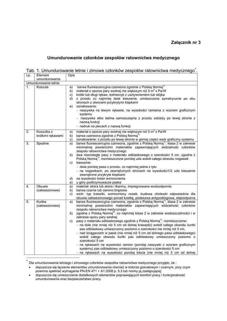 Załącznik nr 3 Umundurowanie członków zespołów ratownictwa medycznego Tab. 1. Umundurowanie letnie i zimowe członków zespołów ratownictwa medycznego*. Lp. Element umundurowania Umundurowanie letnie 1. Koszula Opis a) b) c) d) e) 2. Koszulka z krótkimi rękawami 3. Spodnie a) b) c) a) b) c) 4. Obuwie (całosezonowe) 5. Kurtka (całosezonowa) d) e) a) b) c) a) b) c) * barwa fluorescencyjna czerwona zgodnie z Polską Normą1) 2 materiał o oporze pary wodnej nie większym niż 5 m x Pa/W krótki lub długi rękaw, kołnierzyk z usztywnieniem lub stójka z przodu co najmniej dwie kieszenie, umieszczone symetrycznie po obu stronach z otworami przykrytymi klapkami oznakowania: − naszywka na lewym rękawie, na wysokości ramienia z wzorem graficznym systemu − naszywka albo taśma samosczepna z przodu odzieży po lewej stronie z nazwą funkcji − nadruk na plecach z nazwą funkcji 2 materiał o oporze pary wodnej nie większym niż 5 m x Pa/W 1) barwa czerwona zgodnie z Polską Normą oznakowanie: z przodu po lewej stronie w górnej części wzór graficzny systemu 1) barwa fluorescencyjna czerwona, zgodnie z Polską Normą , klasa 2 w zakresie minimalnej powierzchni materiałów zapewniających widzialność członków zespołu ratownictwa medycznego dwa równoległe pasy z materiału odblaskowego o szerokości 5 cm, zgodne z 1) Polską Normą , rozmieszczone poniżej uda wokół całego obwodu nogawek kieszenie: − dwie poniżej pasa z przodu, co najmniej jedna z tyłu − na nogawkach, po zewnętrznych stronach na wysokości1/2 uda kieszenie zewnętrzne przykryte klapkami na wysokości kolan wzmocnienia u góry podtrzymywacze paska materiał: skóra lub skóra i tkaniny, impregnowane wodoodpornie barwa czarna lub ciemno brązowa wzór: typ trzewiki, wzmocniony nosek, budowa cholewki odpowiednia dla obuwia całosezonowego ponad kostkę, podeszwa antypoślizgowa, olejoodporna 1) barwa fluorescencyjna czerwona, zgodnie z Polską Normą , klasa 2 w zakresie minimalnej powierzchni materiałów zapewniających widzialność członków zespołu ratownictwa medycznego 2) zgodna z Polską Normą , co najmniej klasa 2 w zakresie wodoszczelności i w zakresie oporu pary wodnej 1) pasy z materiału odblaskowego zgodnie z Polską Normą , rozmieszczone: − na dole (nie mniej niż 5 cm od dolnej krawędzi) wokół całego obwodu kurtki pas odblaskowy umieszczony poziomo o szerokości nie mniej niż 5 cm, − nad ściągaczem w pasie (nie mniej niż 5 cm od dolnego pasa odblaskowego) wokół całego obwodu kurtki pas odblaskowy umieszczony poziomo o szerokości 5 cm − na rękawach na wysokości ramion (poniżej naszywki z wzorem graficznym systemu) pas odblaskowy umieszczony poziomo o szerokości 5 cm − na rękawach na wysokości poniżej łokcia (nie mniej niż 5 cm od dolnej Dla umundurowania letniego i zimowego członków zespołów ratownictwa medycznego przyjęto, że : • dopuszcza się łączenie elementów umundurowania również w kolorze granatowym i czarnym, przy czym powinno spełniać wymagania PN-EN 471 + A1:2008 p. 5.3 lub normy ją zastępującej; • dopuszcza się umieszczenie dodatkowych elementów poprawiających komfort pracy i funkcjonalność umundurowania oraz bezpieczeństwo pracy. 6. Bluza - podpinka do kurtki 7. Czapka 8. Kamizelka krawędzi rękawów) pas odblaskowy umieszczony poziomo o szerokości 5 cm − minimalna powierzchnia materiału odblaskowego 0,13 m2 d) kaptur odpinany lub doszyty na stałe i chowany w stójce e) na obwodzie części twarzowej kaptura, wokół pasa i dolnej krawędzi kurtki odszyty tunel ze sznurkiem ściągającym f) z przodu co najmniej dwie kieszenie dolne umieszczone symetrycznie z skośnymi otworami zamykane na zamek błyskawiczny g) z przodu co najmniej dwie kieszenie na wysokości klatki piersiowej umieszczone symetrycznie po obu stronach, z zapięciem przykrytym klapą w tym jedna kieszeń o wymiarach umożliwiających zmieszczenie przenośnego radiotelefonu h) rękawy odpinane, łączone rozłącznie na zamki błyskawiczne przykryte plisami lub listwami, z regulacją obwodu mankietów, na łokciach wzmocnienia i) zamek błyskawiczny głównego zapięcia dwustronnie rozdzielczy j) plisa/listwa przykrywająca zapięcie główne zapinana na taśmę samosczepną k) co najmniej jedna kieszeń wewnętrzna l) od wewnątrz wykończona podszewką siatkową lub materiałem paroprzepuszczalnym m) długość co najmniej do wysokości bioder n) oznakowania przodu: − na lewej, górnej kieszeni naszywka, taśma samosczepna lub identyfikator z nazwą funkcji − na lewym rękawie wzór graficzny systemu w postaci nadruku na materiale odblaskowym o) oznakowania tyłu: − na wysokości klatki piersiowej naszywka na materiale odblaskowym z wzorem graficznym systemu − na plecach na materiale odblaskowym nazwa funkcji 3) a) zgodna z Polską Normą , co najmniej klasa 2 w zakresie oporu cieplnego b) mocowanie do kurtki w sposób rozdzielny na zamek błyskawiczny lub inny 2) c) barwa czerwona zgodnie z Polską Normą d) z przodu, na dole co najmniej dwie kieszenie ze skośnymi otworami zapinane na zamek błyskawiczny e) zalecana jedna kieszeń wewnętrzna z zapięciem otworu f) oznakowanie: naszywka z wzorem graficznym systemu po lewej stronie na wysokości klatki piersiowej, wykonana na materiale odblaskowym 1) a) barwa fluorescencyjna czerwona zgodnie z Polską Normą b) oznakowanie: naszywka z wzorem graficznym systemu wykonana na materiale odblaskowym c) z przodu wyposażona w daszek 1) a) barwa fluorescencyjna czerwona, zgodnie z Polską Normą , klasa 2 w zakresie minimalnej powierzchni materiałów zapewniających widzialność członków zespołu ratownictwa medycznego b) 2 poziome pasy materiału odblaskowego o szerokości 5 cm, spełniającego wymagania zgodne z Polską Norma1), rozmieszczone na dole (nie mniej niż 5 cm od dolnej krawędzi), wokół całego obwodu, w odległości od siebie nie mniejszej niż 5 cm c) rozmieszcz