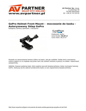 AV Partner Sp. z o.o. ul. Jórskiego 56 03-593 Warszawa tel. +48 22 747-02-91 GoPro Helmet Front Mount - mocowanie do kasku Autoryzowany Sklep GoPro kategoria: Kamery sportowe > Akcesoria Producent: GoPro Cena brutto: 69,00 zł Cena netto: 56,10 zł Pozwala na zamocowanie kamery GoPro na kasku, tak jak czołówki. Dzięki temu mocowaniu można nagrać to co znajduje się przed nami lub ustawić kamerę w pozycji na siebie i rejestrować autoportrety. UWAGA: Zawsze wybieraj kask, który spełnia warunki bezpieczeństwa, kiedy montujesz kamerę GoPro. Zastusuj się do zaleceń producenta kasku w celu zapewnienia bezpieczeństwa. http://www.avpartner.pl/gopro-mocowanie-do-kasku-polska-gwarancja-wysylka-od-reki.html