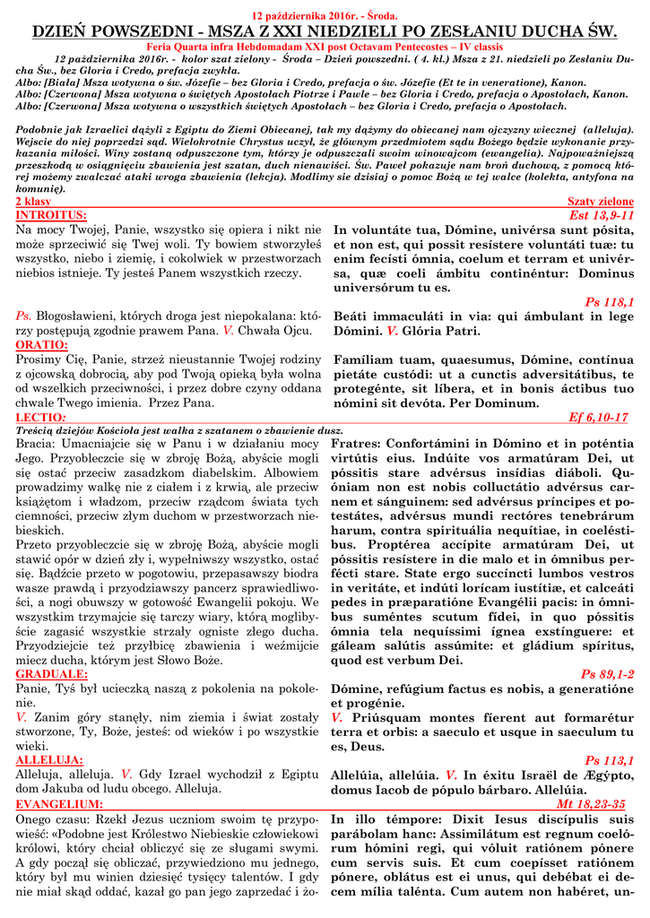 12 października 2016r. - Środa. DZIEŃ POWSZEDNI - MSZA Z XXI NIEDZIELI PO ZESŁANIU DUCHA ŚW. Feria Quarta infra Hebdomadam XXI post Octavam Pentecostes – IV classis 12 pażdziernika 2016r. - kolor szat zielony - Środa – Dzień powszedni. ( 4. kl.) Msza z 21. niedzieli po Zesłaniu Ducha Św., bez Gloria i Credo, prefacja zwykła. Albo: [Biała] Msza wotywna o św. Józefie – bez Gloria i Credo, prefacja o św. Józefie (Et te in veneratione), Kanon. Albo: [Czerwona] Msza wotywna o świętych Apostołach Piotrze i Pawle – bez Gloria i Credo, prefacja o Apostołach, Kanon. Albo: [Czerwona] Msza wotywna o wszystkich świętych Apostołach – bez Gloria i Credo, prefacja o Apostołach. Podobnie jak Izraelici dążyli z Egiptu do Ziemi Obiecanej, tak my dążymy do obiecanej nam ojczyzny wiecznej (alleluja). Wejscie do niej poprzedzi sąd. Wielokrotnie Chrystus uczył, że głównym przedmiotem sądu Bożego będzie wykonanie przykazania miłości. Winy zostaną odpuszczone tym, którzy je odpuszczali swoim winowajcom (ewangelia). Najpoważniejszą przeszkodą w osiągnięciu zbawienia jest szatan, duch nienawiści. Św. Paweł pokazuje nam broń duchową, z pomocą której możemy zwalczać ataki wroga zbawienia (lekcja). Modlimy sie dzisiaj o pomoc Bożą w tej walce (kolekta, antyfona na komunię). 2 klasy INTROITUS: Na mocy Twojej, Panie, wszystko się opiera i nikt nie może sprzeciwić się Twej woli. Ty bowiem stworzyłeś wszystko, niebo i ziemię, i cokolwiek w przestworzach niebios istnieje. Ty jesteś Panem wszystkich rzeczy. Szaty zielone Est 13,9-11 In voluntáte tua, Dómine, univérsa sunt pósita, et non est, qui possit resístere voluntáti tuæ: tu enim fecísti ómnia, coelum et terram et univérsa, quæ coeli ámbitu continéntur: Dominus universórum tu es. Ps 118,1 Ps. Błogosławieni, których droga jest niepokalana: któ- Beáti immaculáti in via: qui ámbulant in lege rzy postępują zgodnie prawem Pana. V. Chwała Ojcu. Dómini. V. Glória Patri. ORATIO: Prosimy Cię, Panie, strzeż nieustannie Twojej rodziny Famíliam tuam, quaesumus, Dómine, contínua z ojcowską dobrocią, aby pod Twoją opieką była wolna pietáte custódi: ut a cunctis adversitátibus, te od wszelkich przeciwności, i przez dobre czyny oddana protegénte, sit líbera, et in bonis áctibus tuo chwale Twego imienia. Przez Pana. nómini sit devóta. Per Dominum. LECTIO: Ef 6,10-17 Treścią dziejów Kościoła jest walka z szatanem o zbawienie dusz. Bracia: Umacniajcie się w Panu i w działaniu mocy Jego. Przyobleczcie się w zbroję Bożą, abyście mogli się ostać przeciw zasadzkom diabelskim. Albowiem prowadzimy walkę nie z ciałem i z krwią, ale przeciw książętom i władzom, przeciw rządcom świata tych ciemności, przeciw złym duchom w przestworzach niebieskich. Przeto przyobleczcie się w zbroję Bożą, abyście mogli stawić opór w dzień zły i, wypełniwszy wszystko, ostać się. Bądźcie przeto w pogotowiu, przepasawszy biodra wasze prawdą i przyodziawszy pancerz sprawiedliwości, a nogi obuwszy w gotowość Ewangelii pokoju. We wszystkim trzymajcie się tarczy wiary, którą moglibyście zagasić wszystkie strzały ogniste złego ducha. Przyodziejcie też przyłbicę zbawienia i weźmijcie miecz ducha, którym jest Słowo Boże. GRADUALE: Panie, Tyś był ucieczką naszą z pokolenia na pokolenie. V. Zanim góry stanęły, nim ziemia i świat zostały stworzone, Ty, Boże, jesteś: od wieków i po wszystkie wieki. ALLELUJA: Alleluja, alleluja. V. Gdy Izrael wychodził z Egiptu dom Jakuba od ludu obcego. Alleluja. EVANGELIUM: Onego czasu: Rzekł Jezus uczniom swoim tę przypowieść: «Podobne jest Królestwo Niebieskie człowiekowi królowi, który chciał obliczyć się ze sługami swymi. A gdy począł się obliczać, przywiedziono mu jednego, który był mu winien dziesięć tysięcy talentów. I gdy nie miał skąd oddać, kazał go pan jego zaprzedać i żo- Fratres: Confortámini in Dómino et in poténtia virtútis eius. Indúite vos armatúram Dei, ut póssitis stare advérsus insídias diáboli. Quóniam non est nobis colluctátio advérsus carnem et sánguinem: sed advérsus príncipes et potestátes, advérsus mundi rectóres tenebrárum harum, contra spirituália nequítiae, in coeléstibus. Proptérea accípite armatúram Dei, ut póssitis resístere in die malo et in ómnibus perfécti stare. State ergo succíncti lumbos vestros in veritáte, et indúti lorícam iustítiæ, et calceáti pedes in præparatióne Evangélii pacis: in ómnibus suméntes scutum fídei, in quo póssitis ómnia tela nequíssimi ígnea exstínguere: et gáleam salútis assúmite: et gládium spíritus, quod est verbum Dei. Ps 89,1-2 Dómine, refúgium factus es nobis, a generatióne et progénie. V. Priúsquam montes fíerent aut formarétur terra et orbis: a saeculo et usque in saeculum tu es, Deus. Ps 113,1 Allelúia, allelúia. V. In éxitu Israël de Ægýpto, domus Iacob de pópulo bárbaro. Allelúia. Mt 18,23-35 In illo témpore: Dixit Iesus discípulis suis parábolam hanc: Assimilátum est regnum coelórum hómini regi, qui vóluit ratiónem pónere cum servis suis. Et cum coepísset ratiónem pónere, oblátus est ei unus, qui debébat ei decem mília talénta. Cum autem non habéret, un- nę jego, i dzieci, i wszystko, co miał, i oddać. A sługa ów upadłszy prosił go mówiąc: Miej cierpliwość nade mną, a oddam ci wszystko. A Pan zlitowawszy się nad owym sługą uwolnił go i dług mu darował. Lecz sługa ów wyszedłszy spotkał jednego z towarzyszów swoich, który był mu winien sto denarów. I ująwszy go, dusił mówiąc Oddaj coś winien. A towarzysz ów upadłszy, prosił go mówiąc: Miej cierpliwość nade mną, a oddam ci wszystko. Lecz on nie chciał, ale odszedł i wtrącił go do więzienia, dopóki by mu długu nie zwrócił. A widząc, co się działo, towarzysze jego zasmucili się bardzo i przyszli, i donieśli panu swemu o wszys