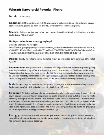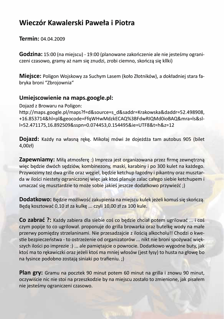 Wieczór Kawalerski Paweła i Piotra Termin: 04.04.2009 Godzina: 15:00 (na miejscu) - 19:00 (planowane zakończenie ale nie jesteśmy ograniczeni czasowo, gramy aż nam się znudzi, zrobi ciemno, skończą się kllki) Miejsce: Poligon Wojskowy za Suchym Lasem (koło Złotników), a dokładniej stara fabryka broni “Zbrojownia“ Umiejscowienie na maps.google.pl: Dojazd z Browaru na Poligon: http://maps.google.pl/maps?f=d&source=s_d&saddr=Krakowska&daddr=52.498908, +16.853714&hl=pl&geocode=FfqWHwMdzkECAQ%3BFdwRIQMd0ioBAQ&mra=ls&sll=52.471175,16.892509&sspn=0.074453,0.154495&ie=UTF8&t=h&z=12 Dojazd: Każdy na własną rękę. Mikołaj mówi że dojeżdża tam autobus 905 (bilet 4,00zł) Zapewniamy: Miłą atmosferę :) Impreza jest organizowana przez firmę zewnętrzną więc będzie dwóch sędziów, kombinezony, maski, karabiny i po 300 kulet na każdego. Przywozimy też dwa grille oraz węgiel, będzie ketchup łagodny i pikantny oraz musztarda w ilości niestety ograniczonej więc jak ktoś planuje zalac całego siebie ketchupem i umaczać się musztardzie to może sobie jakieś jeszcze dodatkowo przywieźć ;) Dodatkowo: Będzie możliwość zakupienia na miejscu kulek jeżeli komuś się skończą. Będą kosztować 0,10 zł za kulkę ... czyli 10,00 zł za 100 kule. Co zabrać ?: Każdy zabiera dla siebie coś co będzie chciał potem ugrilować ... i coś czym popije to co ugrilował. proponuje do grilla browarka oraz butelkę wody na małe przerwy pomiędzy strzelaninami. Nie przesadzajcie z ilością alkocholu!! Chodzi o kwestie bezpieczeństwa - to ostrzeżenie od organizatorów ... nikt nie broni spożywać większych ilości po imprezie :) ... ale pamiętajcie o powrocie. Dodatkowo wygodne buty, jak ktoś ma to rękawiczki oraz jeżeli ktoś ma mniej włosów (jest łysy) to husta na głowę bo na łysince podobno zostają siniaki po trafieniu. ;) Plan gry: Gramu na pocztek 90 minut potem 60 minut na grilla i znowu 90 minut, oczywiście nic nie stoi na przeszkodzie by na miejscu zostało to zmienione, jak pisałem nie jesteśmy ograniczeni czasowo. Scenariusze - żebyście wiedzieli czego się spodziewać :) ZDOBYWANIE FLAGI PRZECIWNIKA W grze biorą udział 2 zespoły. Każdy zespół ma swoją flagę umieszczoną w bazie. Wszyscy uczestnicy zaczynają grę w tym samym czasie w swoich bazach. Zawodnicy trafieni kończą grę i schodzą z terenu walki. Jeśli podczas trafienia zawodnik niósł flagę, musi ją zostawić w miejscu, w którym został wyeliminowany. Wyeliminowany gracz nie może podpowiadać swoim kompanom ani zdradzać pozycji przeciwnika. Wygrywa ta drużyna, która zdobędzie flagę przeciwnika i doniesie ją do swojej bazy. EKSTERMINACJA W grze biorą udział dwie drużyny. Gra polega na zdobywaniu punktów. Każdy wyeliminowany przeciwnik wart jest 2 punkty a odniesiona flaga 5 punktów. Czas gry to 30 minut. Przepisy są podobne jak w przypadku innych gier. Gra zaczyna się po sygnale startu. Trafiony zawodnik udaje się do swojej bazy i z niej ponownie wraca do gry. Wygrywa drużyna z największą ilością punktów. ŁOWCY W grze udział biorą dwa typy graczy: uciekający i ścigający (1/3). Drużyna uciekająca będąca w zdecydowanej mniejszości otrzymuje do dodatkowej obrony tarcze oraz radiotelefony motorola do komunikacji. Uciekający wyruszają 5 minut wcześniej niż ścigający. Celem uciekających jest przeżycie 30 minutowej gry. Celem ścigających jest wyeliminowanie wszystkich uciekających w ciągu 30 minut. Trafienie w tarczę nie jest liczone. AKCJA RATUKOWA Prosta gra polegająca na odbiciu zakładnika. Dwie drużyny. Terroryści porywają zakładnika, a antyterroryści próbują go odbić Żywego. Gra trwa około 30 minut. Jeśli drużyna ratunkowa nie zdąży odbić zakładnika to przegrywa .Zakładnik nie może poruszać się, aż nie zostanie dotknięty przez „swojego” gracza. Do tego czasu nie wolno terrorystom strzelać do zakładnika. Zakładnik jest uratowany, jeżeli Żywy powróci do swej bazy. OCHRONA PREZYDENTA Sędzia zostaje prezydentem. Gracze dzielą się na drużyny ochroniarzy i terrorystów w stosunku 2/1. Misja ochroniarzy polega na bezpiecznym przeprowadzeniu prezydenta określoną wcześniej trasą. Misja terrorystów polega na zabiciu prezydenta bez względu na własne straty. Gra ograniczona czasowo. Trafieni terroryści i ochroniarze schodzą z pola.