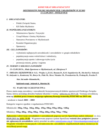 KOMUNIKAT ORGANIZACYJNY MISTRZOSTW POLSKI MŁODZICZEK I MŁODZIKÓW W SUMO 11-12.09.2015 - MYŚLENICE I. ORGANIZATOR: Polski Związek Sumo, KS Dalin Myślenice II. WSPÓŁORGANIZATORZY: Ministerstwo Sportu i Turystyki Urząd Miasta i Gminy Myślenice Starostwo Powiatowe w Myślenicach Komitet Organizacyjny Sponsorzy III. CEL ZAWODÓW: wyłonienie najlepszych zawodniczek i zawodników w grupie młodzików popularyzacja sumo wśród dzieci i młodzieży, popularyzacja sportu i zdrowego trybu życia promocja miasta, gminy i regionu IV. TERMIN I MIEJSCE ZAWODÓW 11-12.09.2015r., Hala Sportowa w Myślenicach, ul. Zdrojowa 9 V. OBSADA SĘDZIOWSKA: S.G.- Wojda A.,Z.S.G. Rozum D., K.O. Szpakiewicz R., Sh-cho/Gy: Sobczyk W, Jedynak A., Konieczny M., Boryc K., Flak M., Sh-n: Niemiec M., Proszkowiec R., Prokop R., Feczko P. Kier. list walk– Kitowska M., Sędziowie wagi: Jedynak A., Niemiec M. VI. WARUNKI UCZESTNICTWA: Prawo startu mają zawodnicy i zawodniczki licencjonowanych klubów sportowych Polskiego Związku Sumo, którzy posiadają aktualne badania lekarskie i ważną / opłaconą na 2015 rok / licencją zawodniczą oraz są szkoleni przez trenera mającego opłaconą licencję trenerską PZSUMO na 2015 rok. - urodzeni w latach 2001 – 2003 Kategorie wagowe zgodnie z regulaminem PZSUMO: Młodziczki: 30kg, 33kg, 36kg, 40kg, 45kg, 50kg, 55kg, 60kg, +60kg Młodzicy: 35kg, 40kg, 45kg, 50kg, 55kg, 60kg, 65kg, 70kg, +70kg Zgłoszenia i aktywacja zawodników i zawodniczek poprzez serwis SportZona należy dokonać do dnia 09.09.2015 do godz. 16 00. Wygenerowane poprzez system SportZona wnioski (bez podpisów) jeszcze nie zgłaszanych zawodników należy przesłać na adres [email protected] i [email protected] . Oryginały wniosków licencyjnych i oświadczenia dot. zawodników niepełnoletnich należy dostarczyć do weryfikacji przed wagą. Koszt licencji na 2015 rok wynosi : klubowa – 250 PLN, wpisowe dla nowych klubów 300 PLN + licencja klubowa 250 PLN, licencja zawodnicza dla młodzików 15 PLN, trenerska 25 PLN, sędziowska 25 PLN. Opłaty należy dokonać do dnia 04.09.2015 przelewem na konto PZSUMO z załączeniem skanu dowodu wpłaty i wykazem zawodników wygenerowanym poprzez system SportZona. Konto bankowe: KB 30 1500 1517 1215 1004 4268 0000 Walki przeprowadzane są zgodnie z systemem Polskiego Związku Sumo. Zawodnicy walczą w tradycyjnych wiązanych pasach, lub na rzepy. Pod pasami można używać czarne, obcisłe leginsy lub kostium zapaśniczy. Nie dopuszcza się stosowania innych rodzajów bielizny czy spodenek VII. KOSZTY UCZESTNICTWA: Koszty organizacyjne pokrywa organizator; ubezpieczenie zawodników pokrywają macierzyste kluby. Koszty przejazdu, wyżywienia i noclegu ponoszą delegujące kluby lub WISSy/WFS. VIII. MIEJSCE ZAMIESZKANIA: Noclegi (internat i hotele w pobliżu miejsca zawodów) 45 – 60 zł/osoba. Wyżywienie całodzienne - 45 zł Rezerwację noclegów i wyżywienia (PISEMNIE) należy zgłosić do dnia 30.08.2015r. na e-mail: [email protected], tel. 12 274 03 40, lub 660 937 298, oraz [email protected], tel. 503 095 395 Uwaga! Ograniczona ilość tańszych noclegów w pobliżu miejsca zawodów. Decyduje kolejność zgłoszeń. Za zamówione i nie wykorzystane miejsca noclegowe oraz wyżywienie będą obciążone jednostki zamawiające! IX. NAGRODY: - Zawodnicy zajmujący miejsca 1-3 (2 trzecie) otrzymują medale i dyplomy Organizatorzy przewidują dodatkowe nagrody rzeczowe X. PROGRAM ZAWODÓW: Piątek – 11.09.2015 r. - Hala Sportowa - ul Zdrojowa 9 do godz. 1500 - przyjazd ekip i zakwaterowanie, od godz. 1600 do 1800- weryfikacja(badania lekarskie, dowód tożsamości ze zdjęciem) i I waga zawodników, Uwaga! jeśli pozwolą warunki organizacyjne weryfikacja i waga może być rozpoczęta wcześniej. . Sobota - 12.09.2015 r. - Hala Sportowa - ul Zdrojowa 9 od godz. 815 do 900 – weryfikacja i II waga zgłoszonych zawodników i zawodniczek ok. godz. 1000 do 1030 - losowanie walk ( po wprowadzeniu zważonych zawodników do programu komp.) ok. godz. 1030 - rozpoczęcie walk, godz. 1200 - uroczyste otwarcie zawodów, powitanie zaproszonych gości, godz. 1215 – c.d. walk oraz ceremonia dekoracji medalistów tylko w strojach do walki - mawashi. Organizator: Ryszard Szpakiewicz, tel. 503 095 395 Mistrzostwa Polski Młodziczek i Młodzików w Sumo Myślenice, dn. 11-12.09.2015r. Nazwa Klubu/Instytucji …………...................................................................................................... Dane do faktury: …………………………………………………………………………………………………………………………… …………………………………………………………………………………………………………………………… …………………………………………………………………………………………………………………………… NIP: ……………………………………………........... REZERWACJA NOCLEGÓW I WYŻYWENIA NOCLEGI Liczba osób z podziałem na płeć: kobiety / mężczyźni / osoby towarzyszące: K/M Piątek/sobota 11/12.09.2015 WYŻYWIENIE Ilość posiłków Kolacja – piątek, 11.09.2015 Śniadanie – sobota , 12.09.2015 Obiad – sobota , 12.09.2015 Miejsce, data ………………………………………………….. Nazwisko i imię, oraz podpis osoby zamawiającej ……………………………………………………………………………..