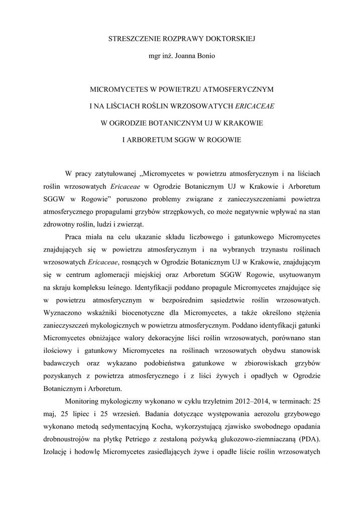 STRESZCZENIE ROZPRAWY DOKTORSKIEJ mgr inż. Joanna Bonio MICROMYCETES W POWIETRZU ATMOSFERYCZNYM I NA LIŚCIACH ROŚLIN WRZOSOWATYCH ERICACEAE W OGRODZIE BOTANICZNYM UJ W KRAKOWIE I ARBORETUM SGGW W ROGOWIE W pracy zatytułowanej „Micromycetes w powietrzu atmosferycznym i na liściach roślin wrzosowatych Ericaceae w Ogrodzie Botanicznym UJ w Krakowie i Arboretum SGGW w Rogowie” poruszono problemy związane z zanieczyszczeniami powietrza atmosferycznego propagulami grzybów strzępkowych, co może negatywnie wpływać na stan zdrowotny roślin, ludzi i zwierząt. Praca miała na celu ukazanie składu liczbowego i gatunkowego Micromycetes znajdujących się w powietrzu atmosferycznym i na wybranych trzynastu roślinach wrzosowatych Ericaceae, rosnących w Ogrodzie Botanicznym UJ w Krakowie, znajdującym się w centrum aglomeracji miejskiej oraz Arboretum SGGW Rogowie, usytuowanym na skraju kompleksu leśnego. Identyfikacji poddano propagule Micromycetes znajdujące się w powietrzu atmosferycznym w bezpośrednim sąsiedztwie roślin wrzosowatych. Wyznaczono wskaźniki biocenotyczne dla Micromycetes, a także określono stężenia zanieczyszczeń mykologicznych w powietrzu atmosferycznym. Poddano identyfikacji gatunki Micromycetes obniżające walory dekoracyjne liści roślin wrzosowatych, porównano stan ilościowy i gatunkowy Micromycetes na roślinach wrzosowatych obydwu stanowisk badawczych oraz wykazano podobieństwa gatunkowe w zbiorowiskach grzybów pozyskanych z powietrza atmosferycznego i z liści żywych i opadłych w Ogrodzie Botanicznym i Arboretum. Monitoring mykologiczny wykonano w cyklu trzyletnim 2012–2014, w terminach: 25 maj, 25 lipiec i 25 wrzesień. Badania dotyczące występowania aerozolu grzybowego wykonano metodą sedymentacyjną Kocha, wykorzystującą zjawisko swobodnego opadania drobnoustrojów na płytkę Petriego z zestaloną pożywką glukozowo-ziemniaczaną (PDA). Izolację i hodowlę Micromycetes zasiedlających żywe i opadłe liście roślin wrzosowatych z objawami nekrozy i plamistości przeprowadzono zgodnie z zasadami stosowanymi podczas badań fitopatologicznych. Analizując wyniki badań stwierdzono, że wyższa frekwencja propagul Micromycetes w powietrzu atmosferycznym w Arboretum, niż w Ogrodzie Botanicznym świadczy o większym zanieczyszczeniu bioaerozolu przez grzyby, co może wiązać się z położeniem Arboretum na skraju kompleksu leśnego, nawiewaniem pyłu glebowego z otaczających terenów rolniczych oraz warunkami atmosferycznymi sprzyjającymi (w okresie badań) propagulacji Micromycetes. Nieco niższe stężenie zanieczyszczeń mykologicznych w powietrzu atmosferycznym Ogrodu Botanicznego daje się wytłumaczyć usytuowaniem Ogrodu w centrum Krakowa, a tym samym złymi warunkami wentylacji pionowej i poziomej, brakiem kanałów przewietrzania oraz gromadzeniem się pyłu zawieszonego, co utrudnia przemieszczanie i przeżywalność zarodników Micromycetes. W powietrzu atmosferycznym, niezależnie od lokalizacji terenu, panujących warunków atmosferycznych i terminu badań, znajdują się grzyby rodzajów: Alternaria, Cladosporium, Epicoccum, Mortierella, Penicillium i Trichoderma, stąd za gatunki absolutnie stałe w powietrzu uznać należy: A. alternata, C. cladosporioides, C. herbarum, Davidiella macrocarpa, E. nigrum, M. alpina, T. viride i Umbelopsis isabellina. Symptomy chorób na liściach roślin wrzosowatych Ericaceae wywołał kompleks grzybów patogenicznych i saprotroficznych, wśród których dominowały: A. alternata, E. nigrum, P. expansum i Pestalotiopsis sydowiana, stanowiące 60% kolonii wyodrębnionych z porażonych tkanek. Gatunkami absolutnie stałymi w strukturze zbiorowisk Micromycetes butujących, zarówno w Ogrodzie Botanicznym, jak i w Arboretum, na liściach roślin wrzosowatych i powodujących zmiany chorobowe (najczęściej nekrozy) były: A. alternata, C. cladosporioides, Coleophoma rhododendri, E. nigrum, Fusarium chlamydosporum, Gibberella avenacea, M. alpina, P. expansum, P. jensenii, Pestalotia rhododendri, P. sydowiana, Phoma medicaginis, Sordaria fimicola, Truncatella truncata i U. isabellina, co może świadczyć, że grzyby te, mogą porażać większość roślin wrzosowatych. Ponadto stwierdzono, że zdecydowana większość gatunków Micromycetes zasiedlających liście roślin wrzosowatych była składnikiem bioaerozolu, co świadczy o ich wcześniejszym uwalnianiu do atmosfery, rozprzestrzenianiu, opadaniu i stanowi o ekologicznej roli atmosfery. Występowanie aeroalergennych Micromycetes w ogrodach botanicznych i arboretach, będących z racji funkcji miejscem rekreacji i wypoczynku, może rzutować na zdrowie i samopoczucie ludzi, stąd konieczne jest monitorowanie czystości powietrza w tych obiektach.