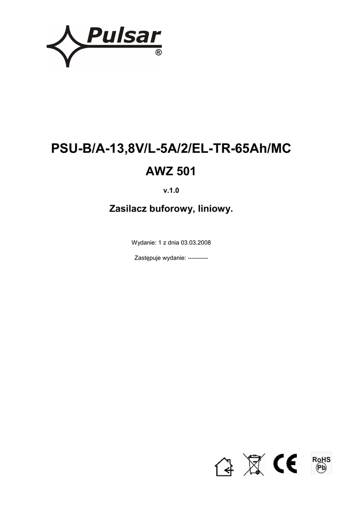 PSU-B/A-13,8V/L-5A/2/EL-TR-65Ah/MC AWZ 501 v.1.0 Zasilacz buforowy, liniowy. Wydanie: 1 z dnia 03.03.2008 Zastępuje wydanie: ---------- 1. Opis techniczny. 1.1. Opis ogólny. Zasilacz buforowy przeznaczony jest do nieprzerwanego zasilania urządzeń wymagających stabilizowanego napięcia 12V/DC. Zastosowany w urządzeniu liniowy układ stabilizacyjny dostarcza napięcia o mniejszym poziomie szumów i krótszym czasie odpowiedzi na zakłócenie, niŜ w przypadku stosowania stabilizatora impulsowego. Zasilacz dostarcza do odbiorników napięcia Uout= 12,0V÷13,8 V DC ( Uout= 10,0V÷13,8 V DC – praca bateryjna) o wydajności prądowej Imax=5A. Zasilacz posiada dwa niezaleŜnie chronione bezpiecznikami PTC i monitorowane wyjścia. W przypadku zaniku napięcia sieciowego następuje natychmiastowe przełączenie na zasilanie akumulatorowe. Zasilacz wyposaŜony jest w zabezpieczenia: przeciwzwarciowe (SCP), przeciąŜeniowe (OLP), termiczne (OHP), nadnapięciowe (OVP). Przystosowany jest do współpracy z akumulatorem ołowiowo-kwasowym, suchym (SLA). Zasilacz kontroluje automatycznie proces ładowania i konserwacji akumulator, ponadto wyposaŜony jest w dynamiczny test akumulatora oraz ochronę akumulatora przed nadmiernym rozładowaniem (UVP). WyposaŜony jest w optyczna i akustyczną sygnalizację pracy informującą o stanie pracy (zasilanie, awarie). Zasilacz wyposaŜony jest takŜe w wyjścia techniczne (BS, AW) słuŜące do zdalnej kontroli pracy (SSWiN, KD). Zasilacz umieszczony jest w obudowie metalowej (kolor RAL 9003) z miejscem na akumulator 65Ah/12 max. Obudowa wyposaŜona jest w mikroprzełączniki sygnalizujące otwarcie drzwiczek (czołówki) i oderwanie od podloŜa. UWAGA! Zasilacz współpracuje z akumulatorem ołowiowo-kwasowym (SLA). Po okresie eksploatacji nie naleŜy go wyrzucać, lecz zutylizować w sposób zgodny z obowiązującymi przepisami (dyrektywy Unii Europejskiej 91/157/EEC i 93/86/EEC). 1.2. Schemat blokowy Rys. 1 Schemat blokowy zasilacza. 2 2. Instalacja. 2.1 Opis wymagań. Zasilacz buforowy przeznaczony jest do montaŜu przez wykwalifikowanego instalatora , posiadającego odpowiednie (wymagane i konieczne dla danego kraju) zezwolenia i uprawnienia do przyłączania ( ingerencji) w instalacje 230V/AC oraz instalacje niskonapięciowe. Przed przystąpieniem do instalacji, naleŜy sporządzić bilans obciąŜenia zasilacza. W czasie normalnej eksploatacji suma prądów pobieranych przez odbiorniki oraz oraz prąd ładowania akumulatora nie moŜe przekroczyć 5.6A PoniewaŜ zasilacz zaprojektowany jest do pracy ciągłej nie posiada wyłącznika zasilania, dlatego naleŜy zapewnić właściwą ochronę przeciąŜeniową w obwodzie zasilającym. NaleŜy takŜe poinformować uŜytkownika o sposobie odłączenia zasilacza od napięcia sieciowego (najczęściej poprzez wydzielenie i oznaczenie odpowiedniego bezpiecznika w skrzynce bezpiecznikowej). Instalacja elektryczna powinna być wykonana według obowiązujących norm i przepisów. Urządzenie powinno być zamontowane w pomieszczeniach zamkniętych zgodnie z II klasą środowiskową, o normalnej wilgotności powietrza (RH=90% maks. bez kondensacji) i temperaturze z zakresu -10°C do +40°C. Zasilacz powinien pracować w pozycji pionowej tak, aby zapewnić swobodny konwekcyjny przepływ powietrza przez otwory wentylacyjne obudowy. UWAGA! Przed przystąpieniem do instalacji naleŜy upewnić się, Ŝe napięcie w obwodzie zasilającym 230V jest odłączone. 2.2 Procedura instalacji. 1.Przed przystąpieniem do instalacji naleŜy upewnić się, Ŝe napięcie w obwodzie zasilającym 230V jest odłączone. 2. Zamontować zasilacz w wybranym miejscu i doprowadzić przewody połączeniowe. 3. Wyjąć bezpiecznik sieciowy zabezpieczający obwód pierwotny transformatora [15]. 4. Przewody zasilania ~230V podłączyć do zacisków AC 230V transformatora [14]. Przewód uziemiający podłączyć do zacisku oznaczonego symbolem uziemienia [16]. Połączenie naleŜy wykonać kablem trójŜyłowym (z Ŝółtozielonym przewodem ochronnym PE). Przewody zasilające naleŜy doprowadzić do odpowiednich zacisków kostki przyłączeniowej [14] [16], poprzez przepust izolacyjny. Szczególnie starannie naleŜy wykonać obwód ochrony przeciwporaŜeniowej: Ŝółto-zielony przewód ochronny kabla zasilającego musi być dołączony z jednej strony do zacisku oznaczonego w obudowie zasilacza. Praca zasilacza bez poprawnie wykonanego i sprawnego technicznie obwodu ochrony przeciwporaŜeniowej jest NIEDOPUSZCZALNA! Grozi uszkodzeniem urządzeń, poraŜeniem prądem elektrycznym. 5. . Podłączyć przewody odbiorników do złączy +OUT1- i +OUT2- kostki zaciskowej na płytce zasilacza [9]. JeŜeli prąd obciąŜenia jest I>2,5A naleŜy wykonać mostek na wyjściach +OUT1 i +OUT2. 6. W razie potrzeby podłączyć przewody od urządzeń ( centrala alarmowa, kontroler, sygnalizator itp.) do wyjść technicznych : - BS wyjście sygnalizujące awarię sieci 230V Wyjście techniczne BS podczas prawidłowej pracy zasilacza jest odcięte od masy (-), natomiast w przypadku wystąpienia utraty zasilania 230V AC jest zwierane do masy (-) po czasie określonym zworkami Z1, Z2 [5] (Tab.3) - AW wyjście sygnalizujące awarie Wyjście techniczne AW podczas prawidłowej pracy zasilacza jest zwarte do masy (-), natomiast w przypadku wystąpienia jednej z wymienionych przyczyn wyjście zostaje odcięte od masy. 7. Przy pomocy zworek Z3, Z4 [5] określić czas odłączenia akumulatora w przypadku pracy akumulatorowej, gdy napięcie na jego zaciskach spadnie poniŜej 10.5V. 8. Przy pomocy zworek J1, J2 określić prąd ładowania akumulatora: 9.Załączyć zasilanie 230V AC i włoŜyć bezpiecznik sieciowy zabezpieczający obwód pierwotny transformatora [15]. Sprawdzić sygnalizację optyczną pracy zasilacza. Napięcie wyjściowe nie obciąŜonego zasilacza powinno wynosić Uout= 13,8V DC±0.1V W czasie ładowania akumulatora napięcie moŜe wynosić Uout=